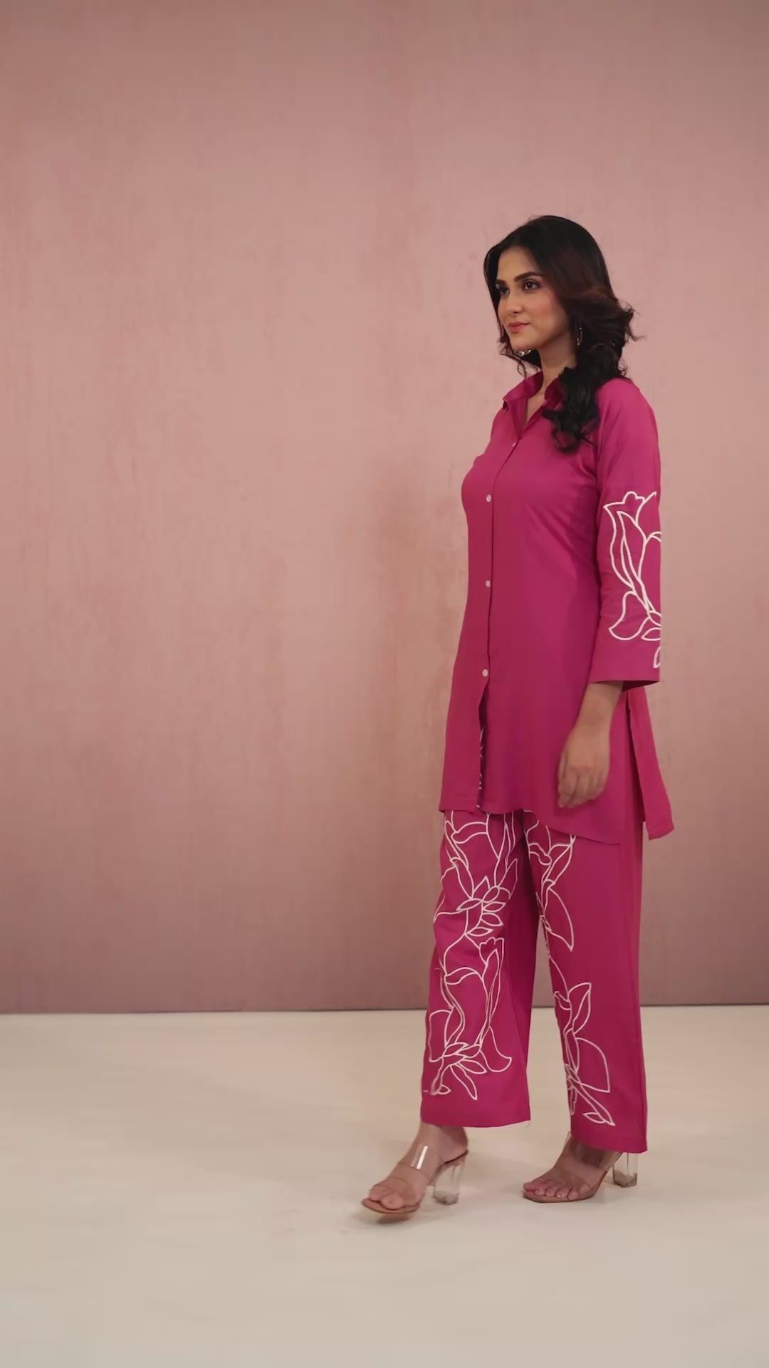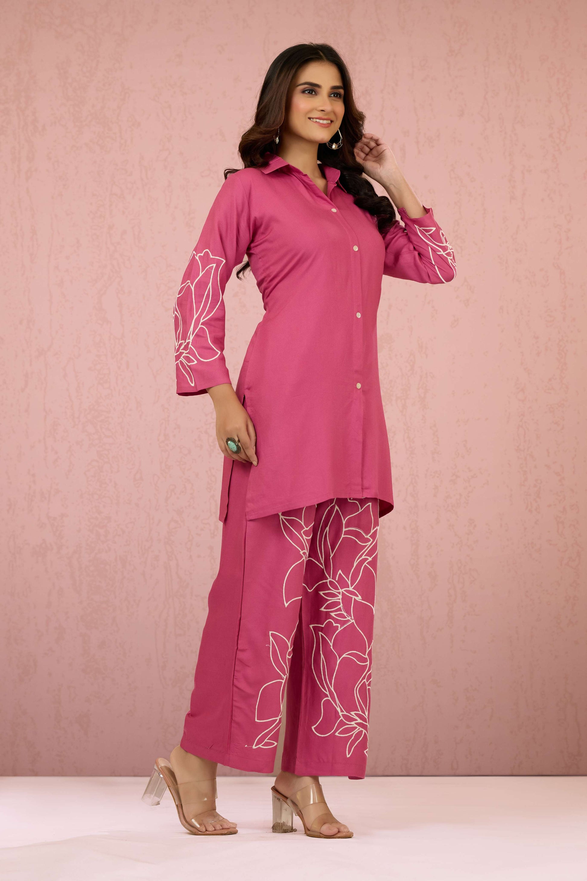 The Pink Embroidery Rayon Coord Set by Shreyshree combines the soft, breathable qualities of rayon fabric with detailed embroidery for a refined look. This coordinated outfit offers comfortable wear and a graceful drape, making it suitable for both casual and semi-formal occasions. Expertly designed, it reflects a harmonious blend of contemporary style and traditional craftsmanship.