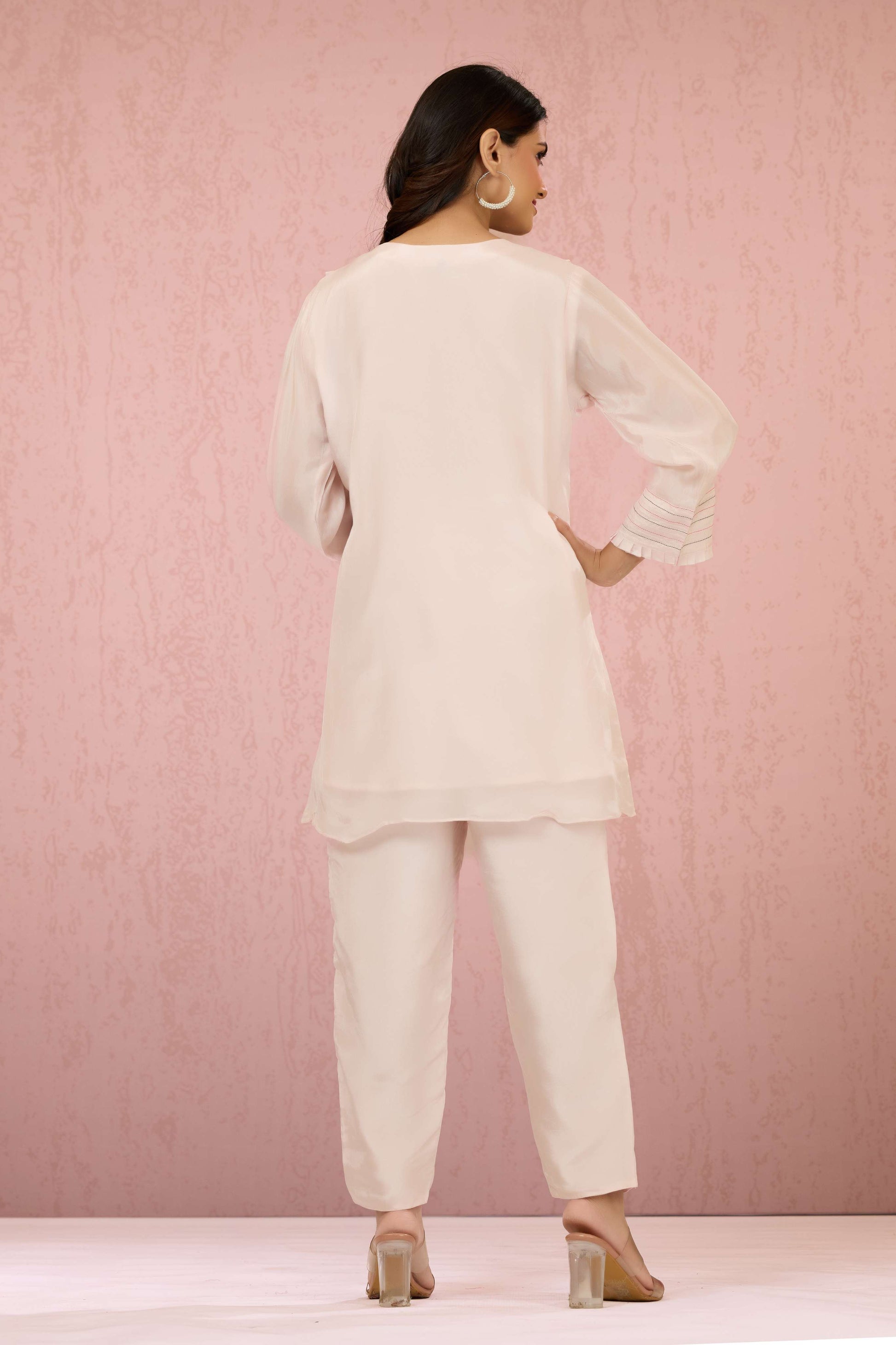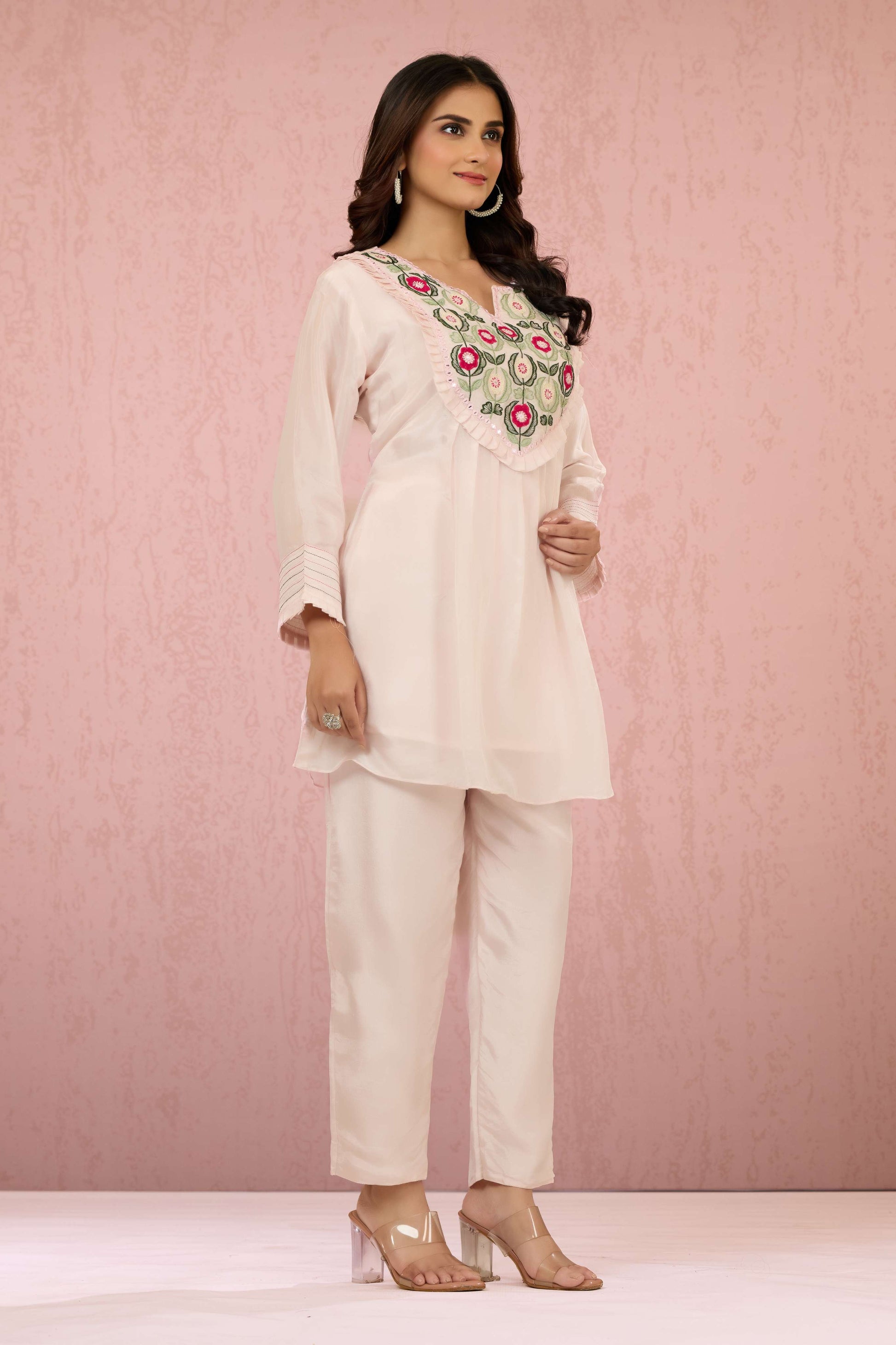 The Pink Kutch Work HO Silk Coord Set by Shreyshree features rich HO silk fabric adorned with intricate Kutch embroidery, showcasing traditional craftsmanship with vibrant detailing. This coordinated ensemble offers a luxurious texture and elegant drape, perfect for festive occasions and cultural events. Expertly crafted, it blends heritage artistry with contemporary design for a striking and sophisticated appearance.