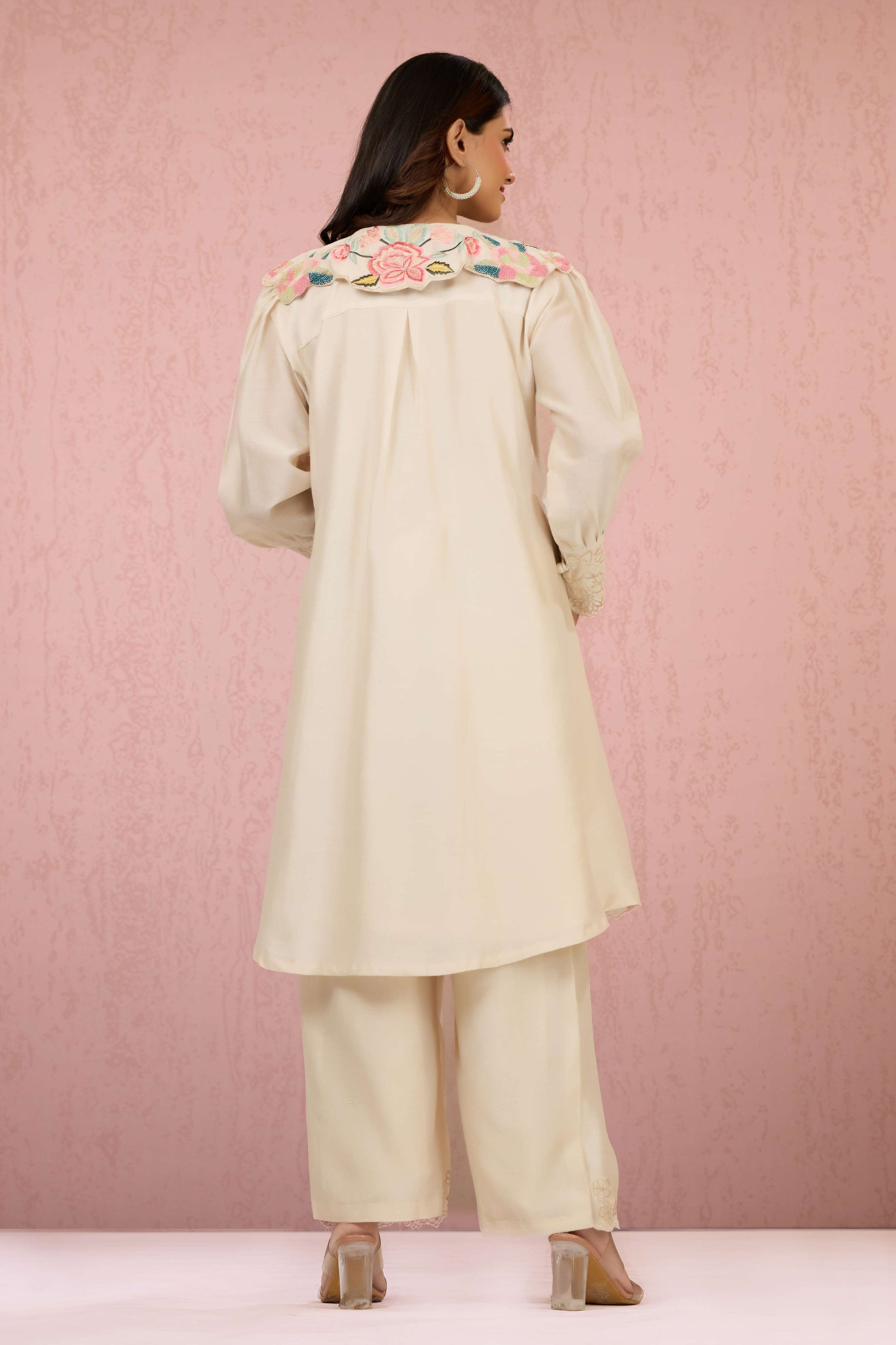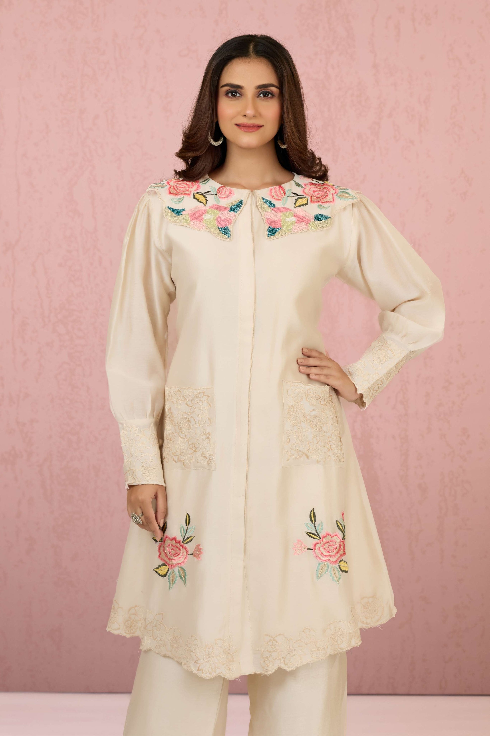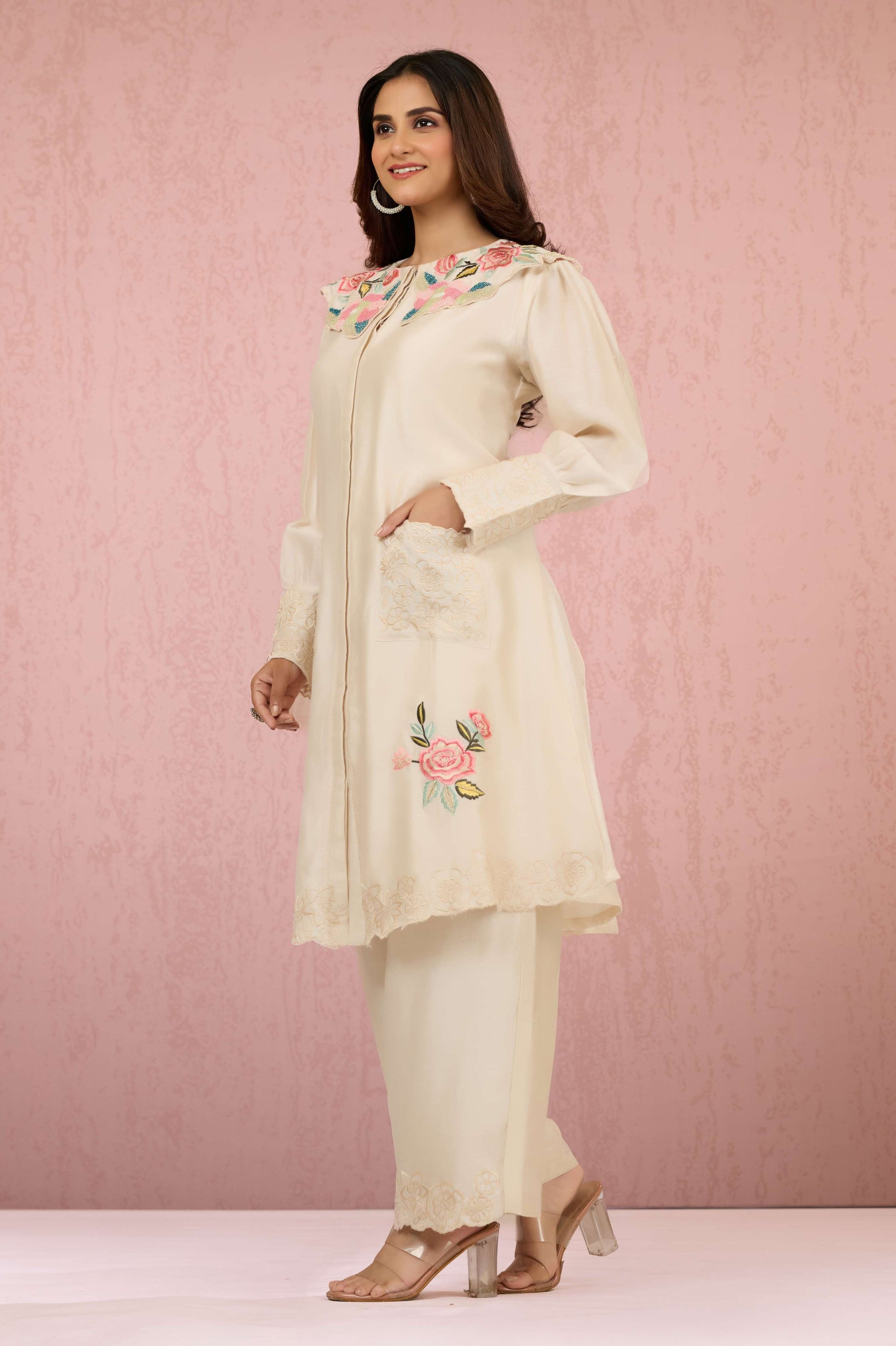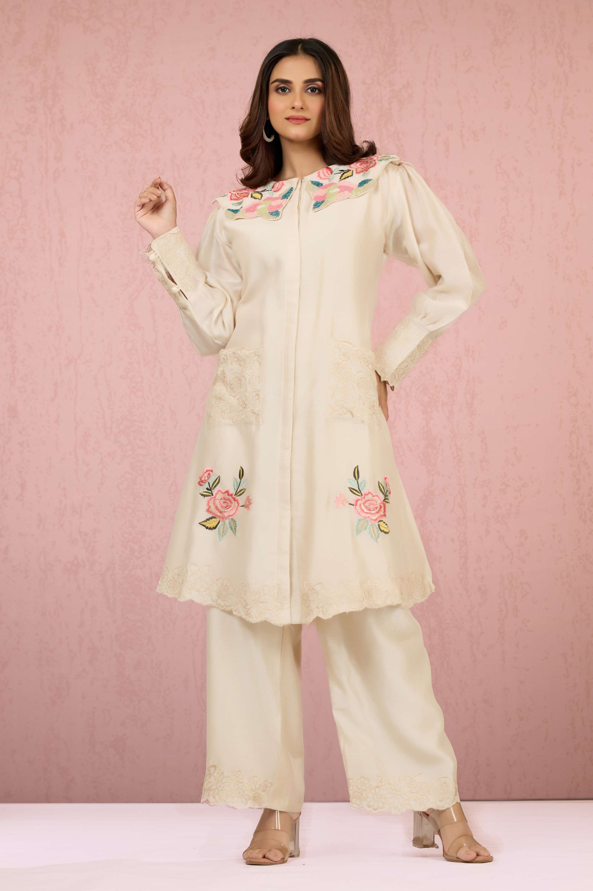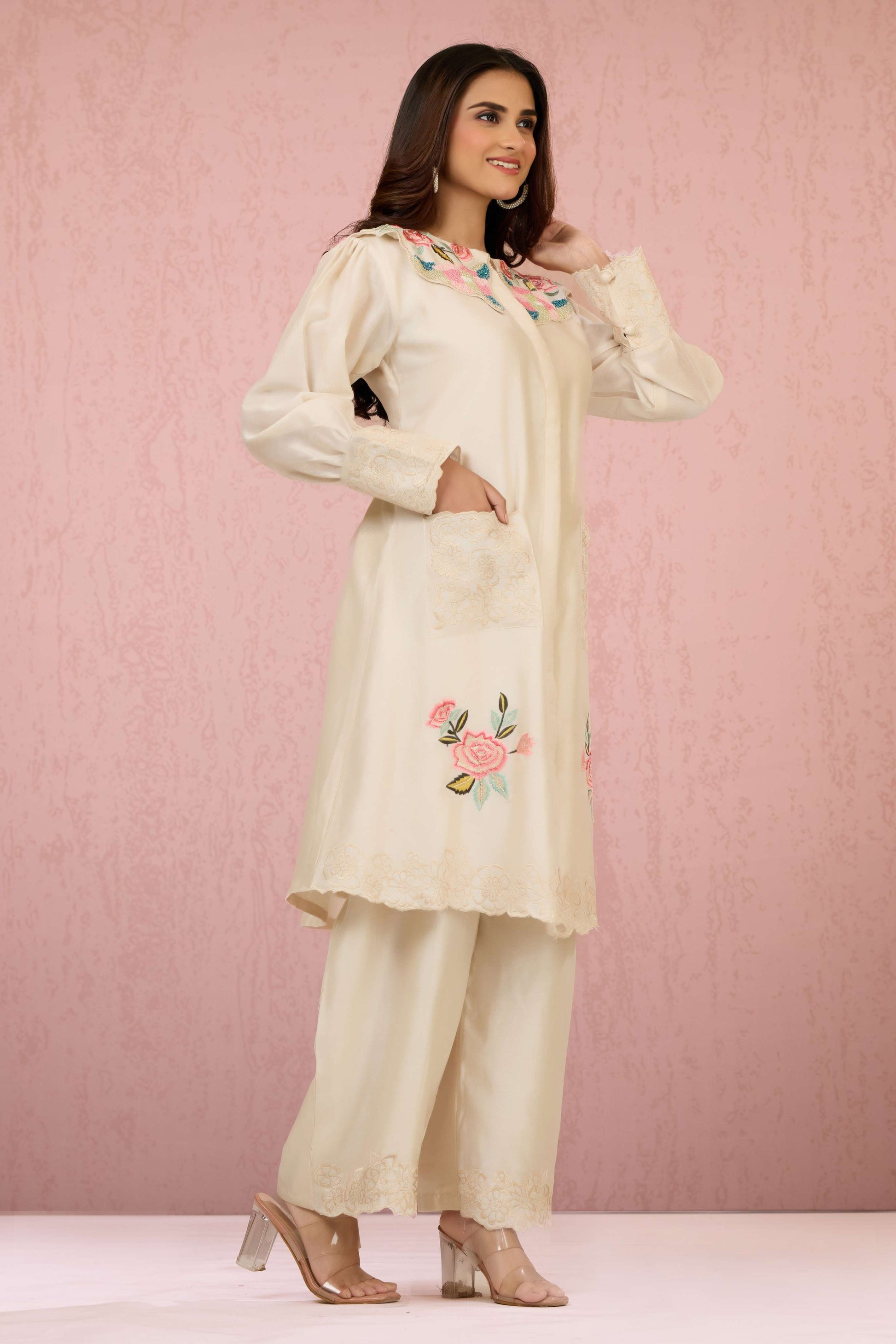 This elegant cream embroidery HO silk coordinate set from Shreyshree combines traditional craftsmanship with contemporary style. Crafted from high-quality silk, it features intricate embroidery that enhances its sophisticated appeal. Perfect for formal occasions, this set offers both comfort and a refined look, making it a versatile addition to your wardrobe.