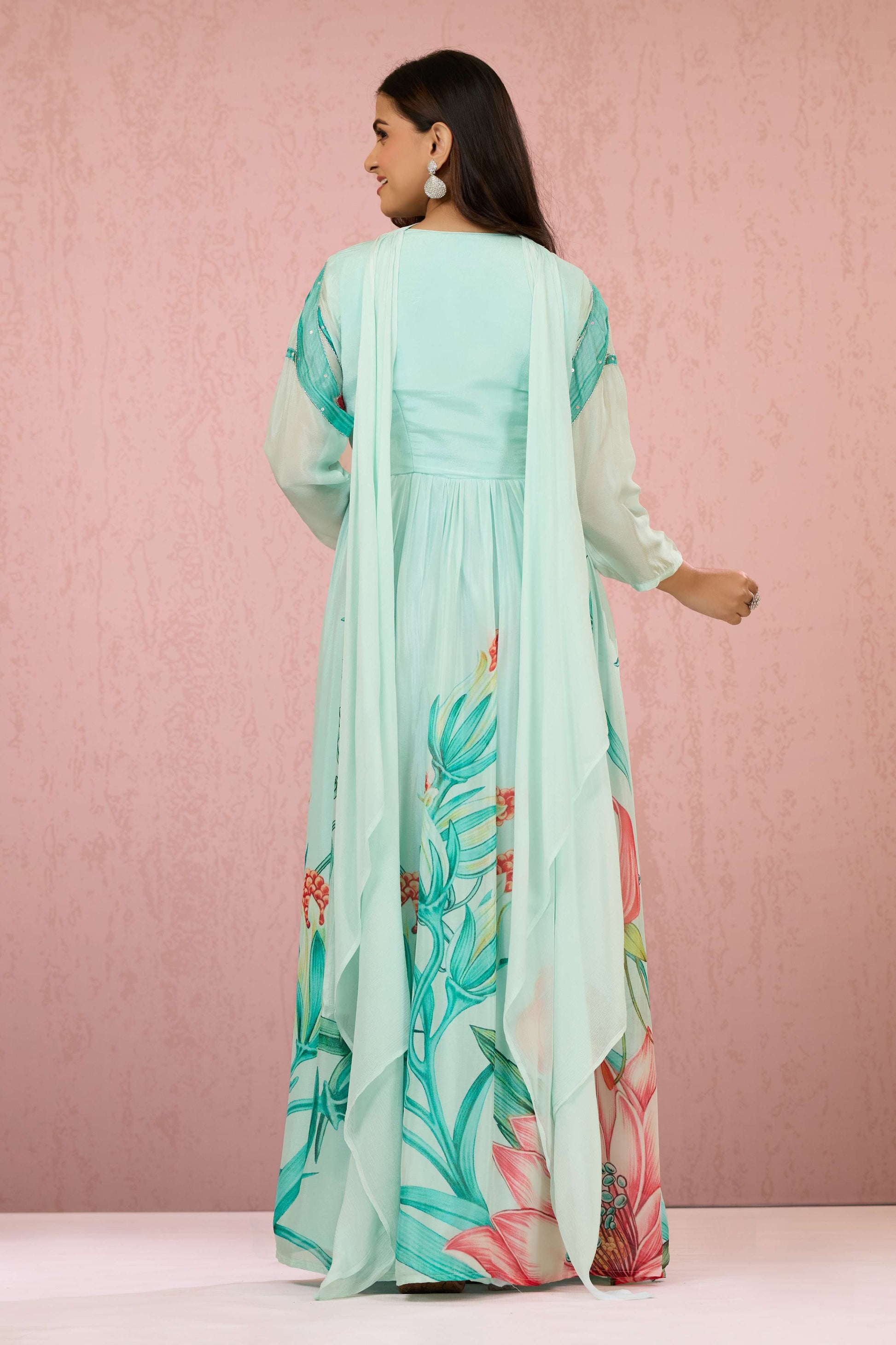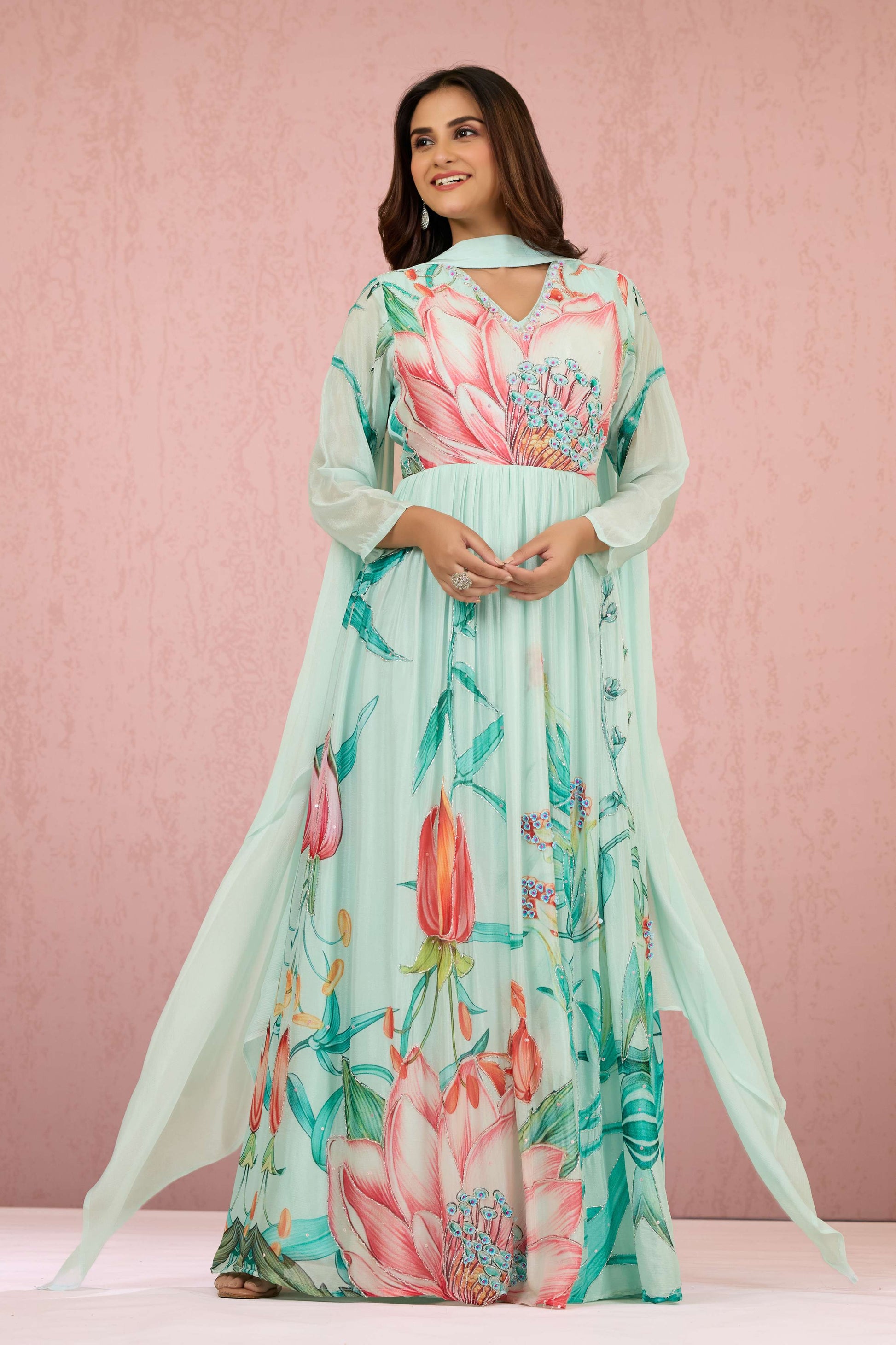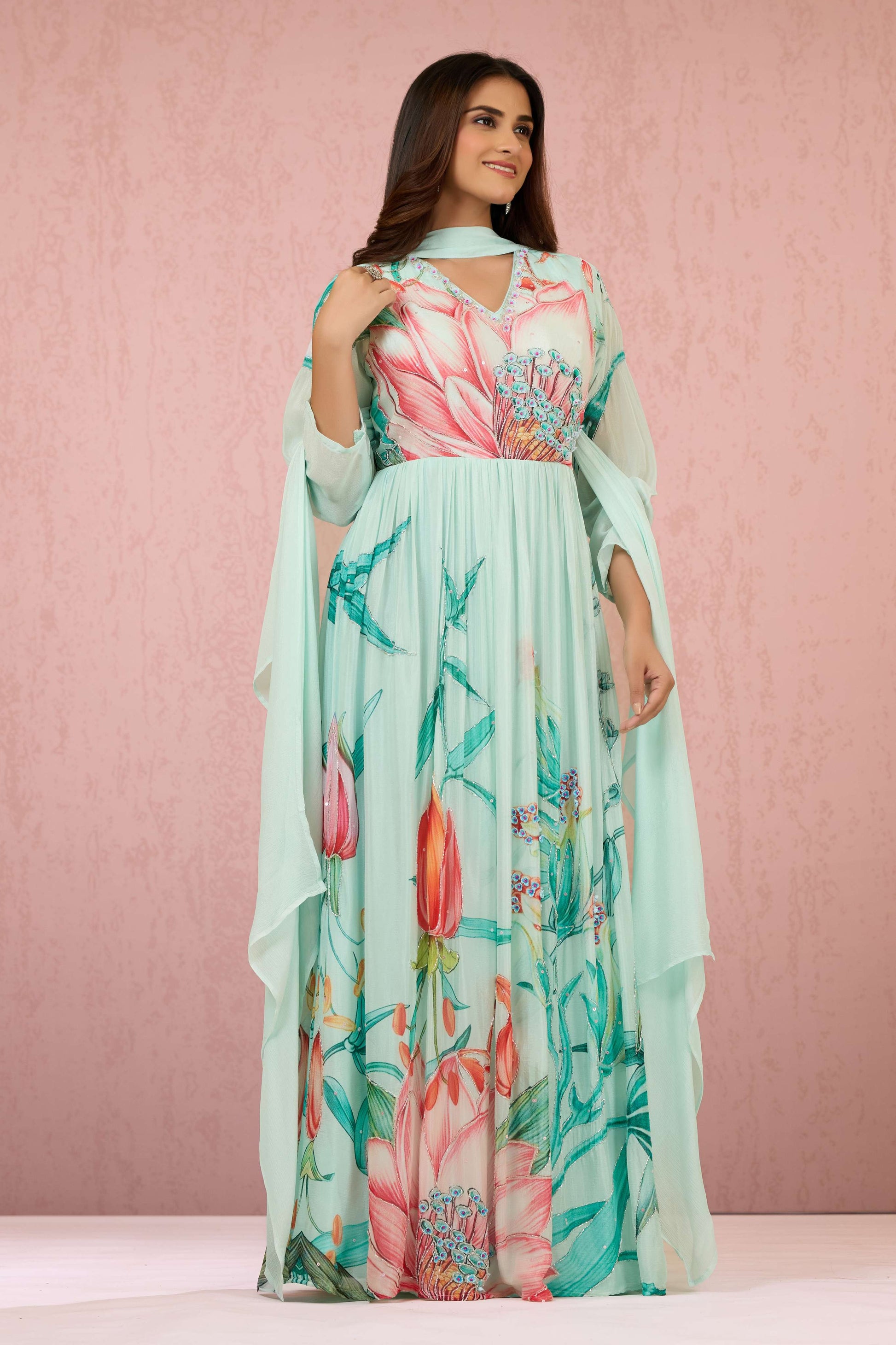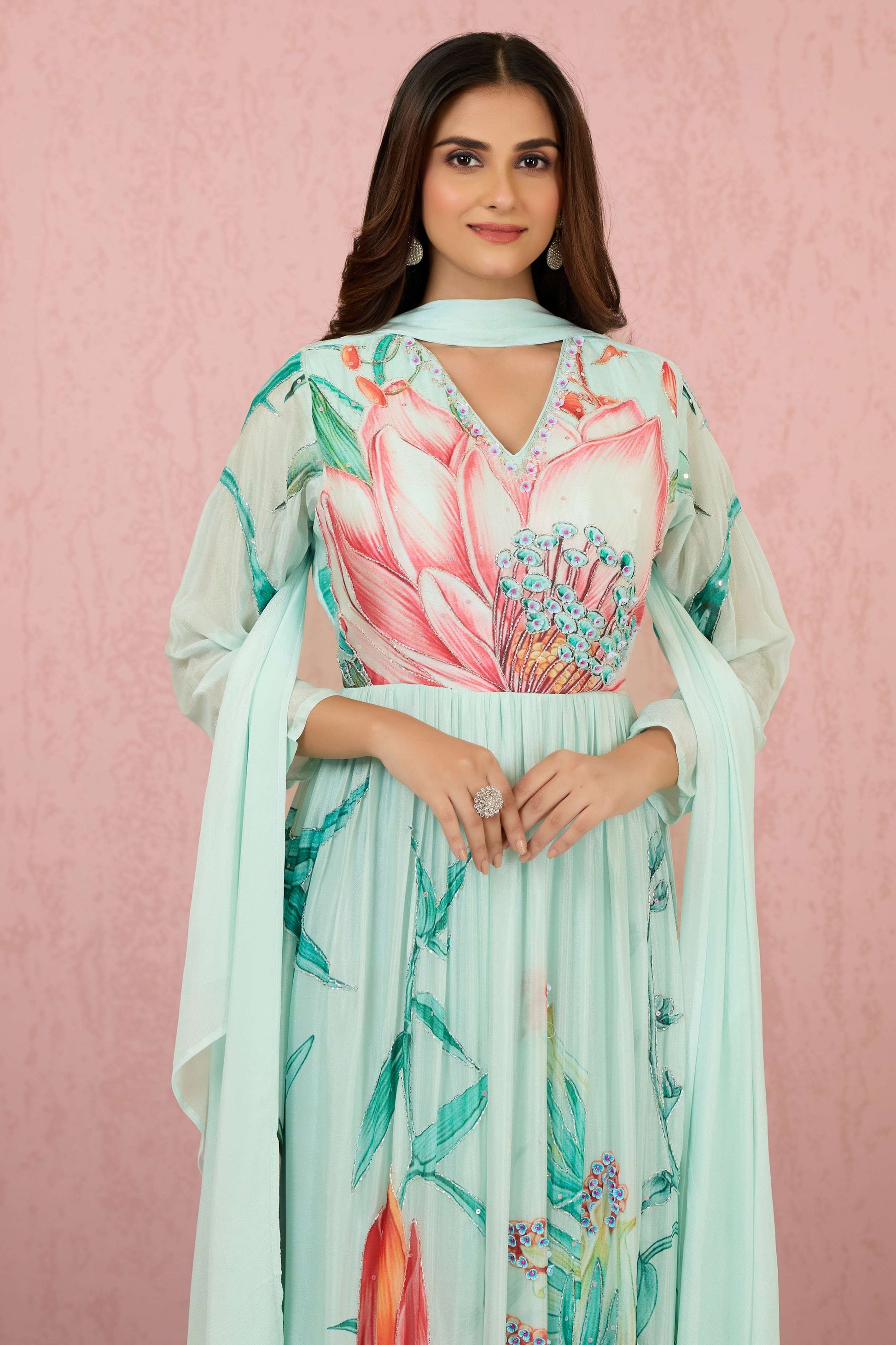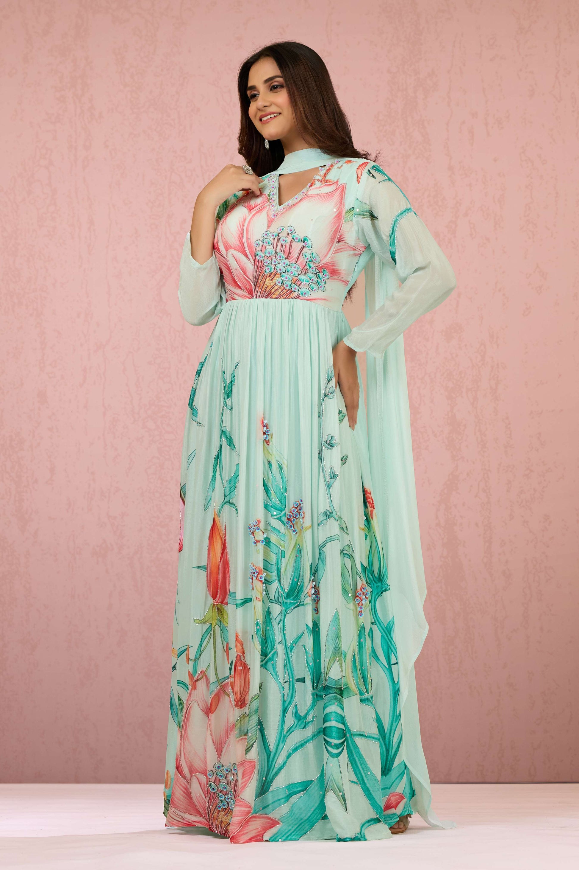 The Skyblue Sequins Chinon Dress by Shreyshree combines the soft, flowing texture of Chinon fabric with intricate sequin detailing for a luminous effect. Its serene skyblue hue and elegant cut make it an ideal choice for formal events, offering both comfort and a sophisticated, eye-catching presence.
