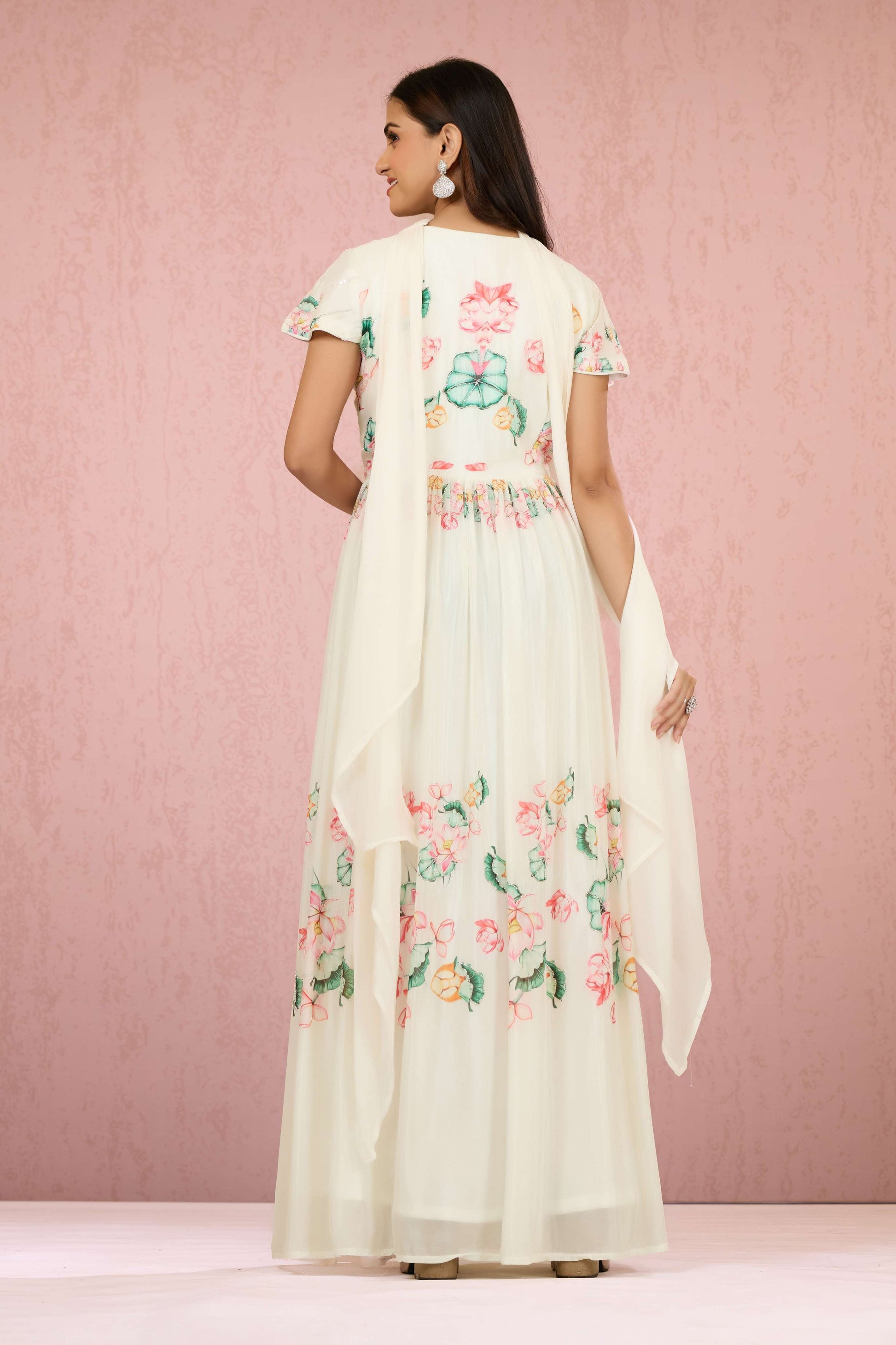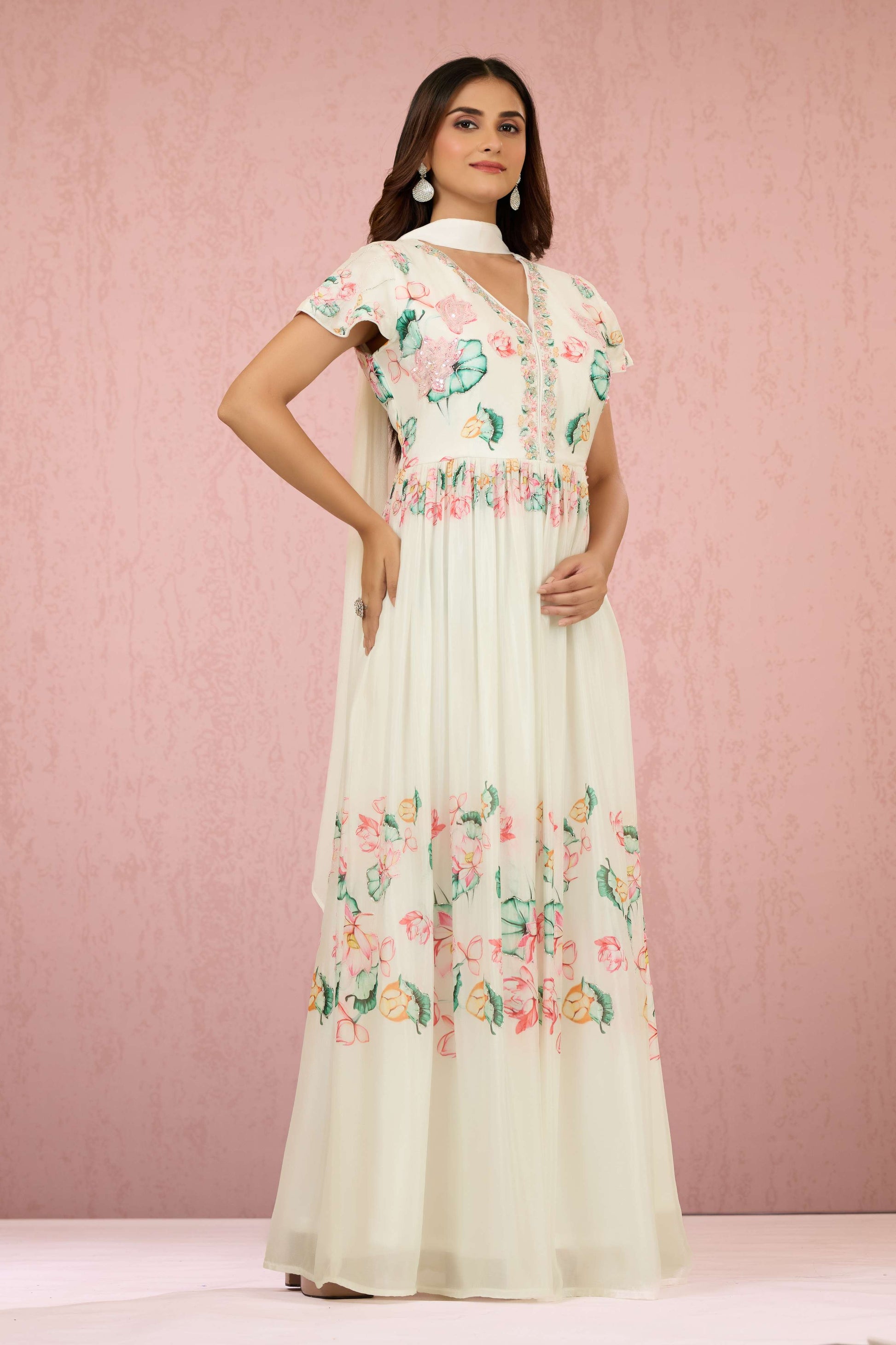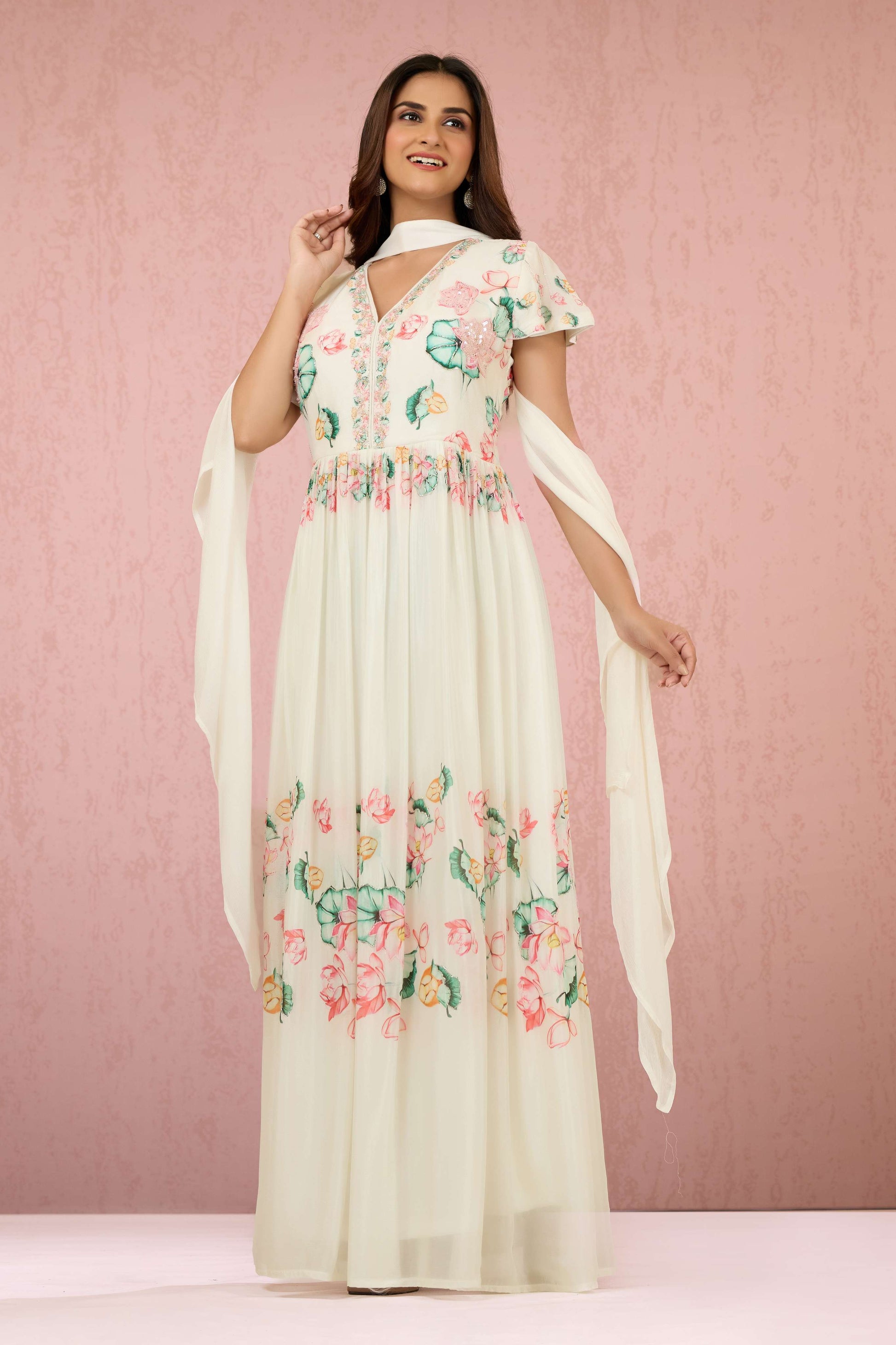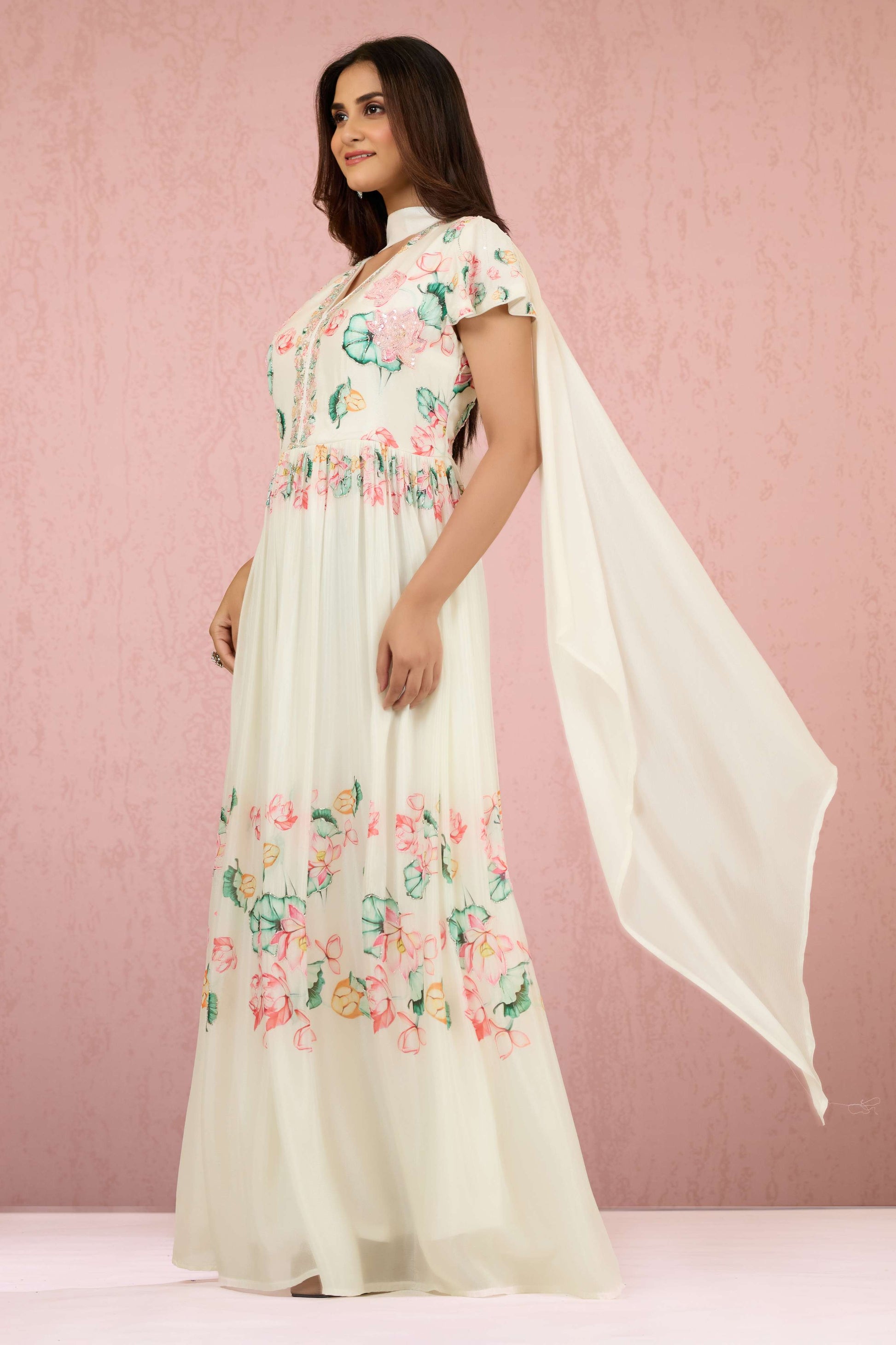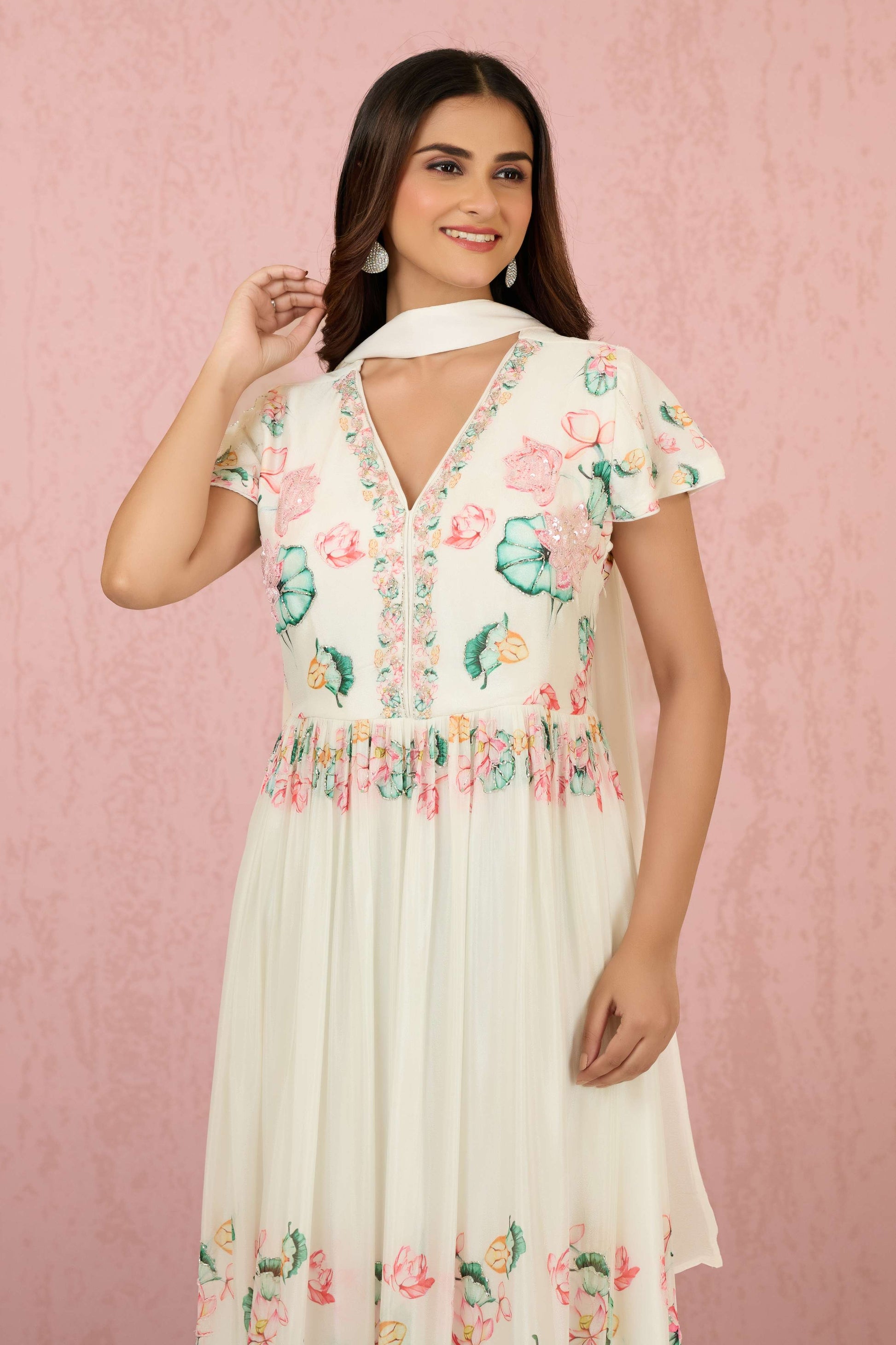 The White Sequins Chinon Dress by Shreyshree features delicate sequin embellishments on smooth Chinon fabric, creating a subtle shimmer that enhances its elegant silhouette. Designed for special occasions, this dress offers a graceful drape and refined finish, combining comfort with sophisticated style for a standout look.