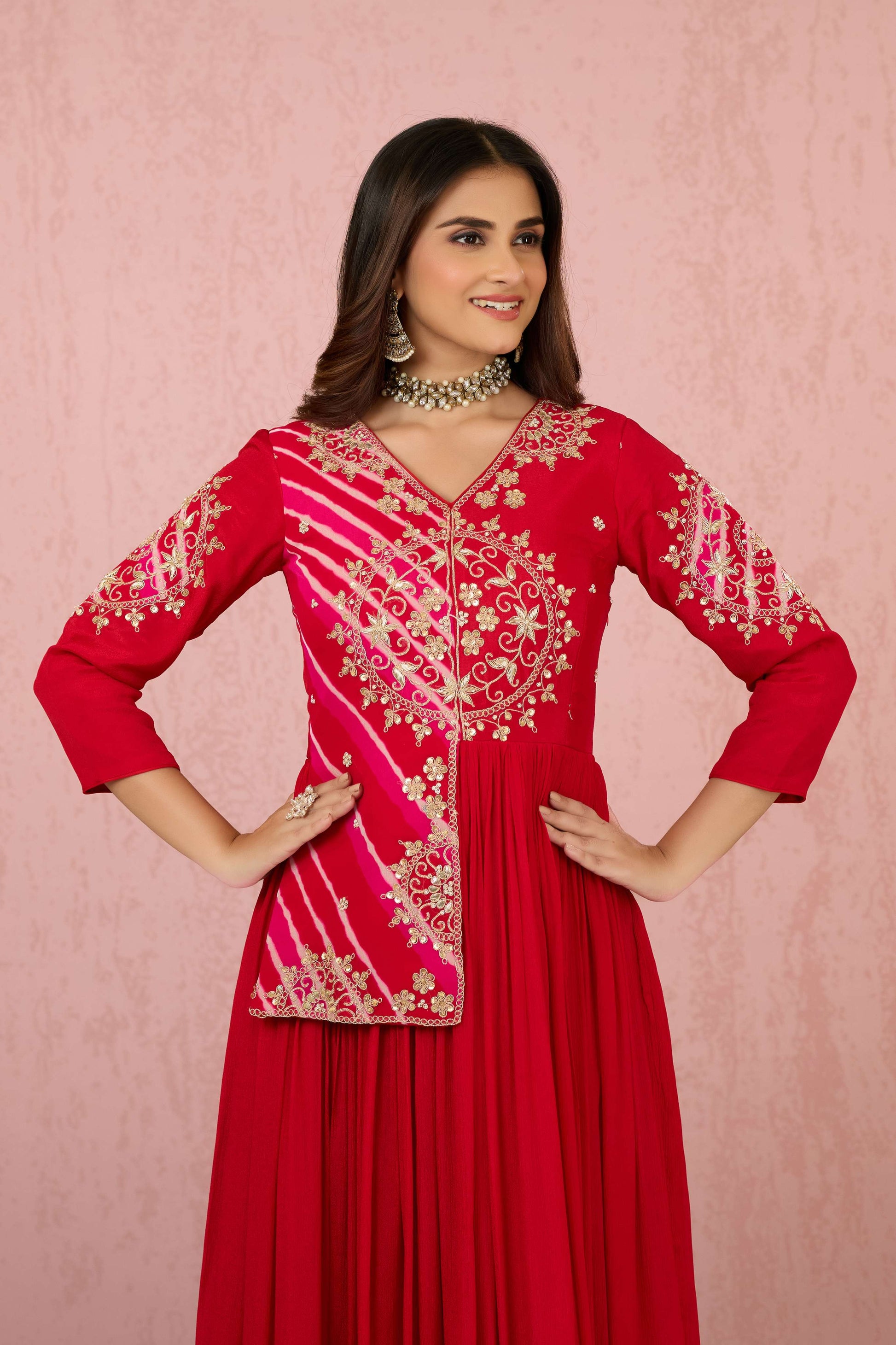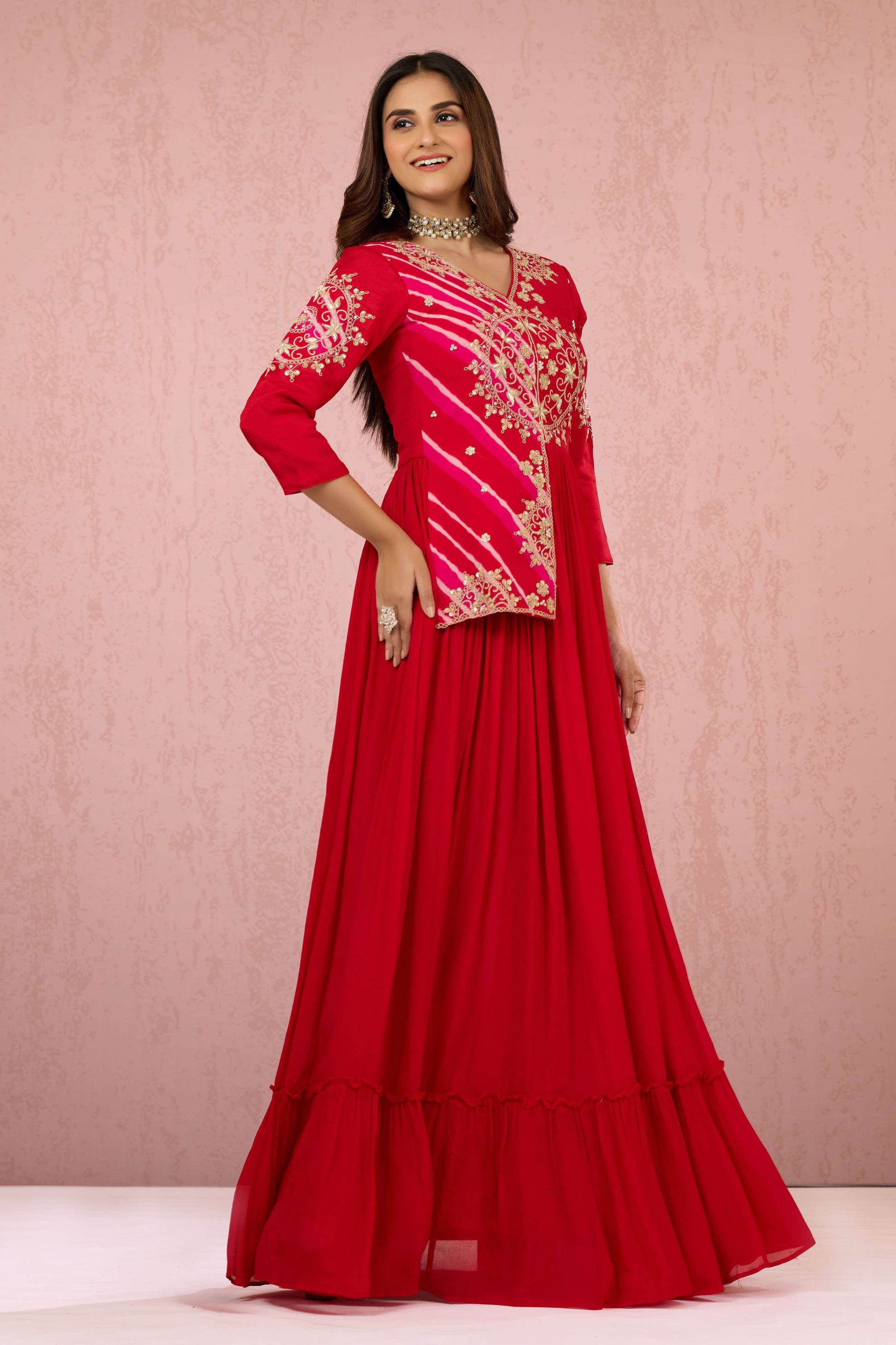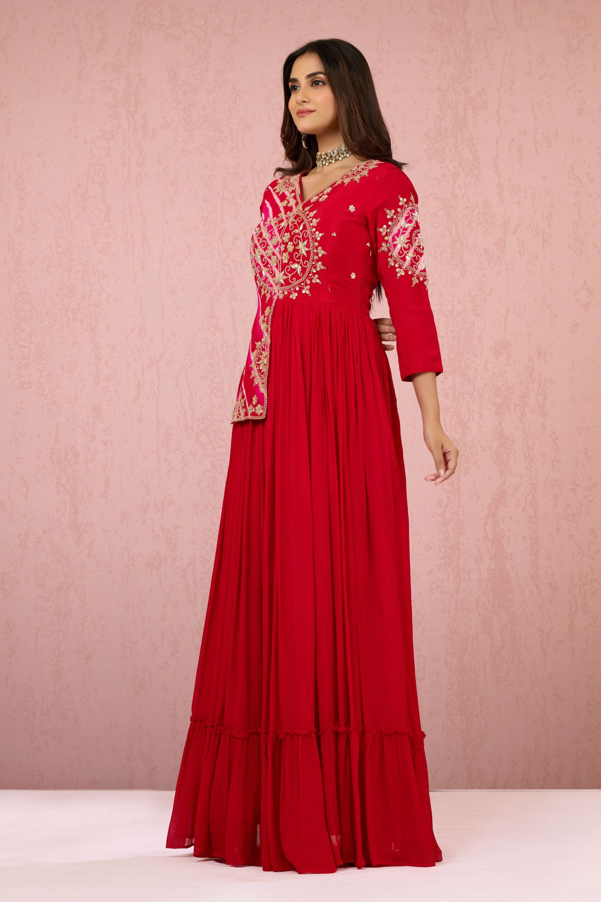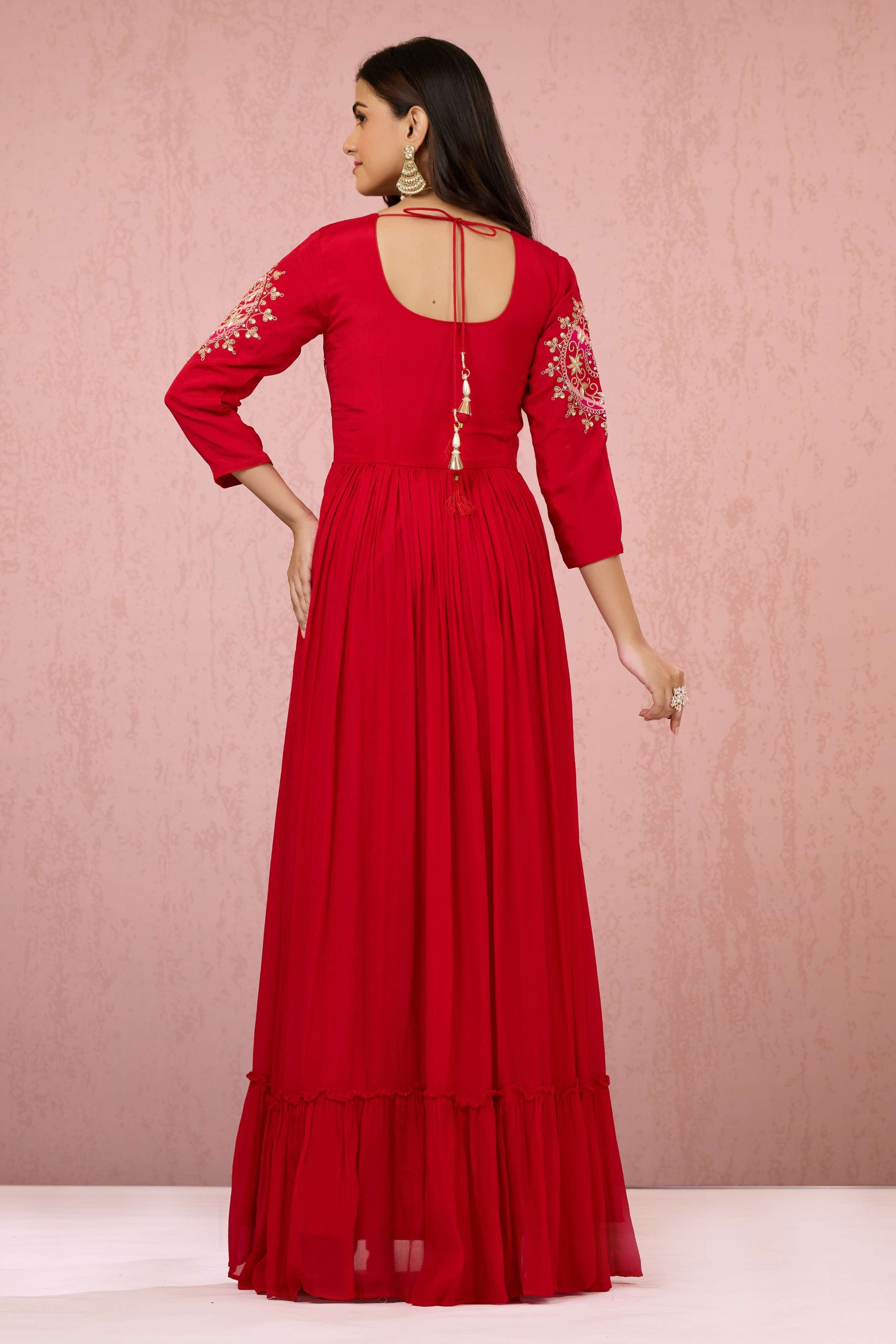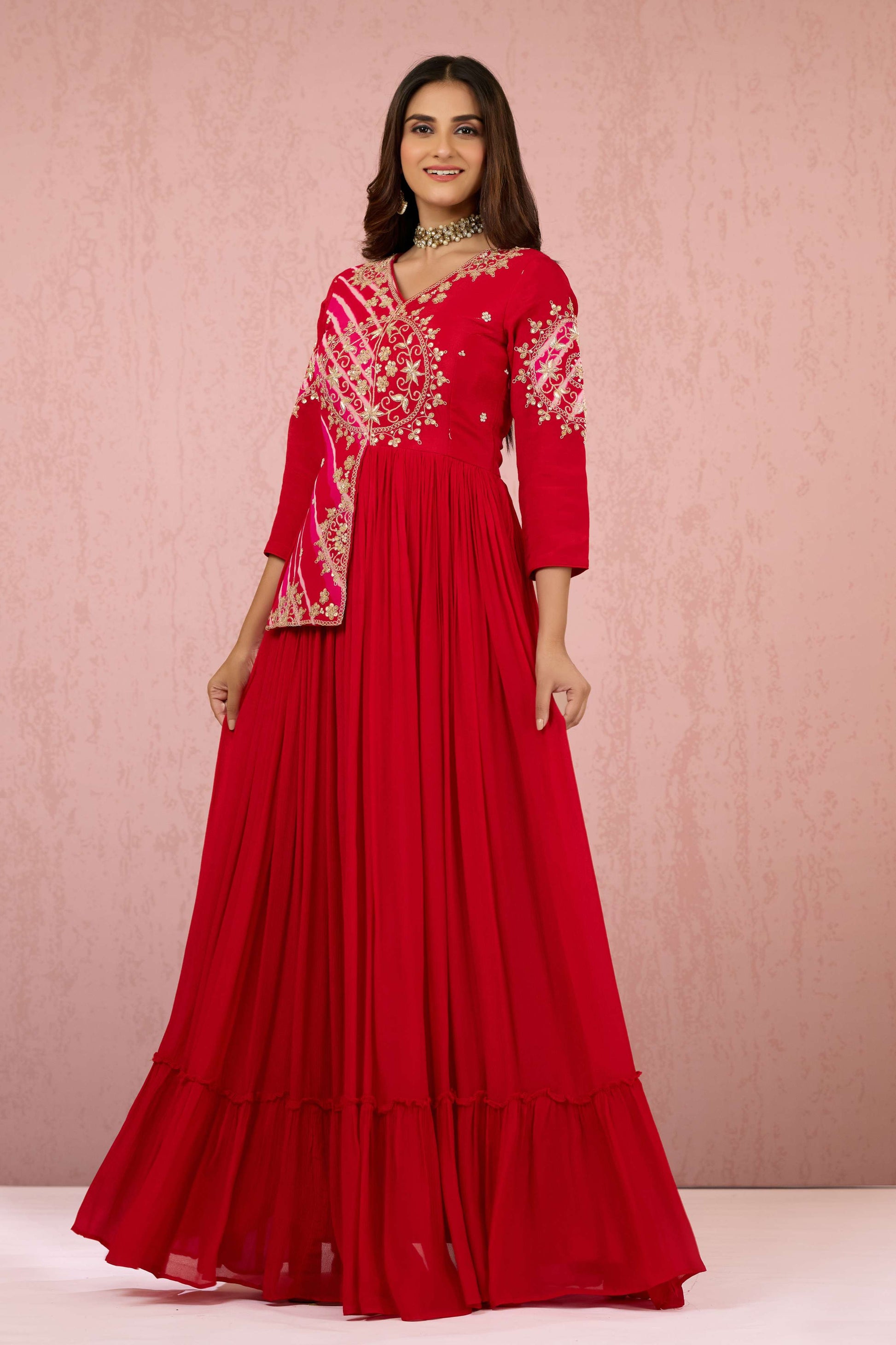 This Red Boolean Work Chinon Dress from Shreyshree combines elegant design with expert craftsmanship. Made from high-quality Chinon fabric, it offers a smooth texture and comfortable fit. The intricate red Boolean embroidery adds a sophisticated touch, making it ideal for formal occasions or festive events. Its tailored silhouette enhances your shape while ensuring ease of movement. Perfect for those seeking a refined and stylish outfit with lasting appeal.