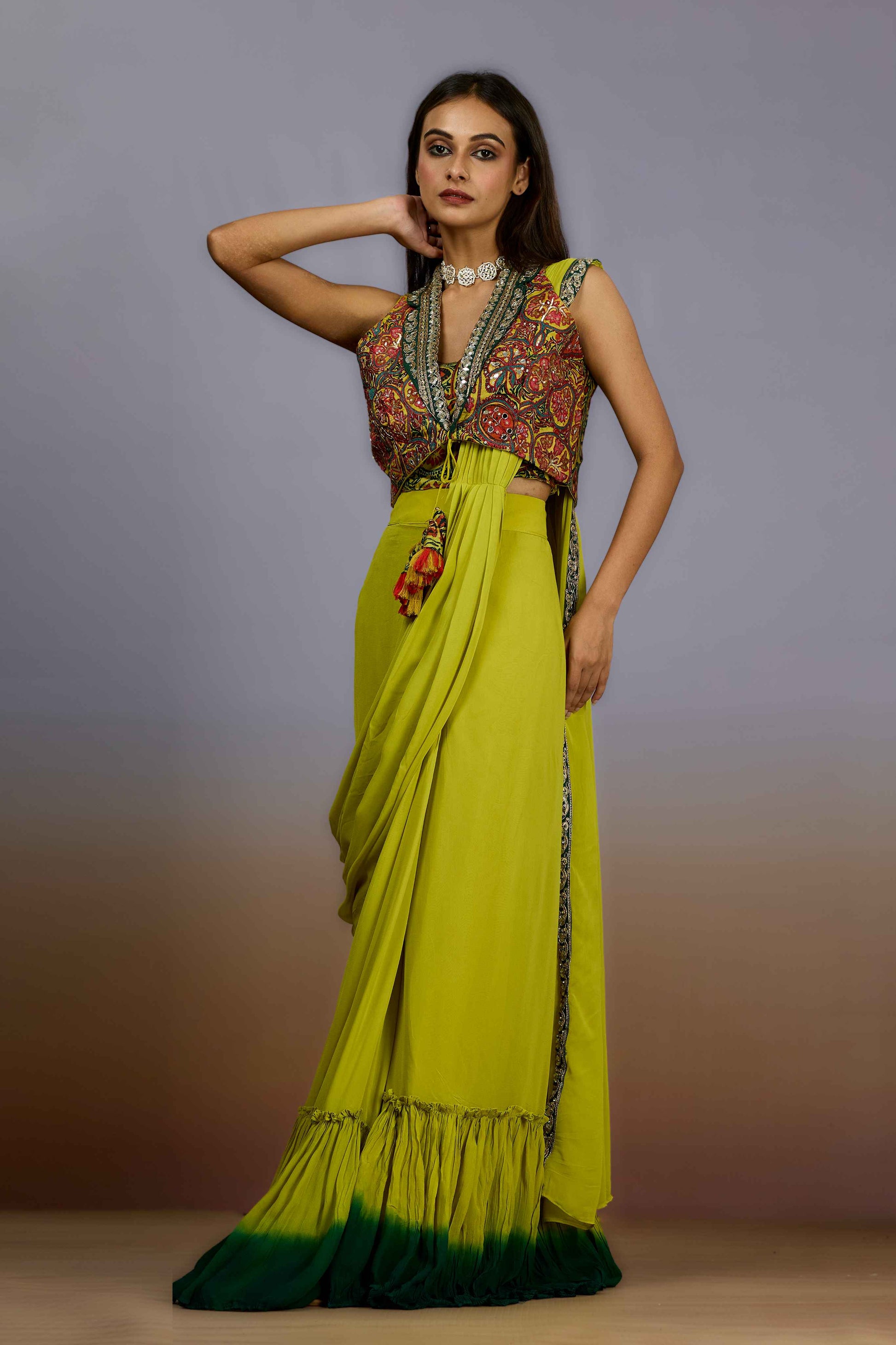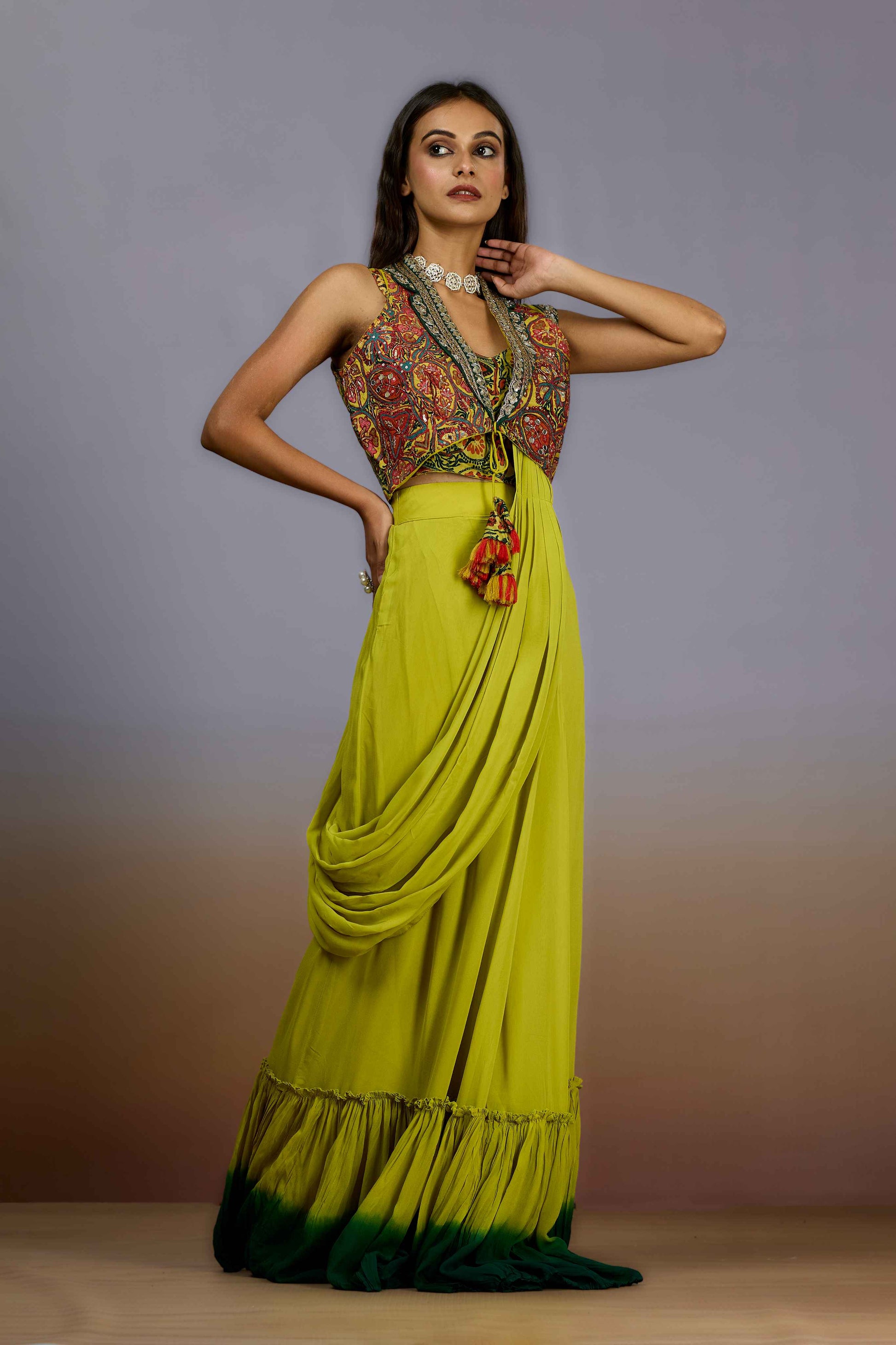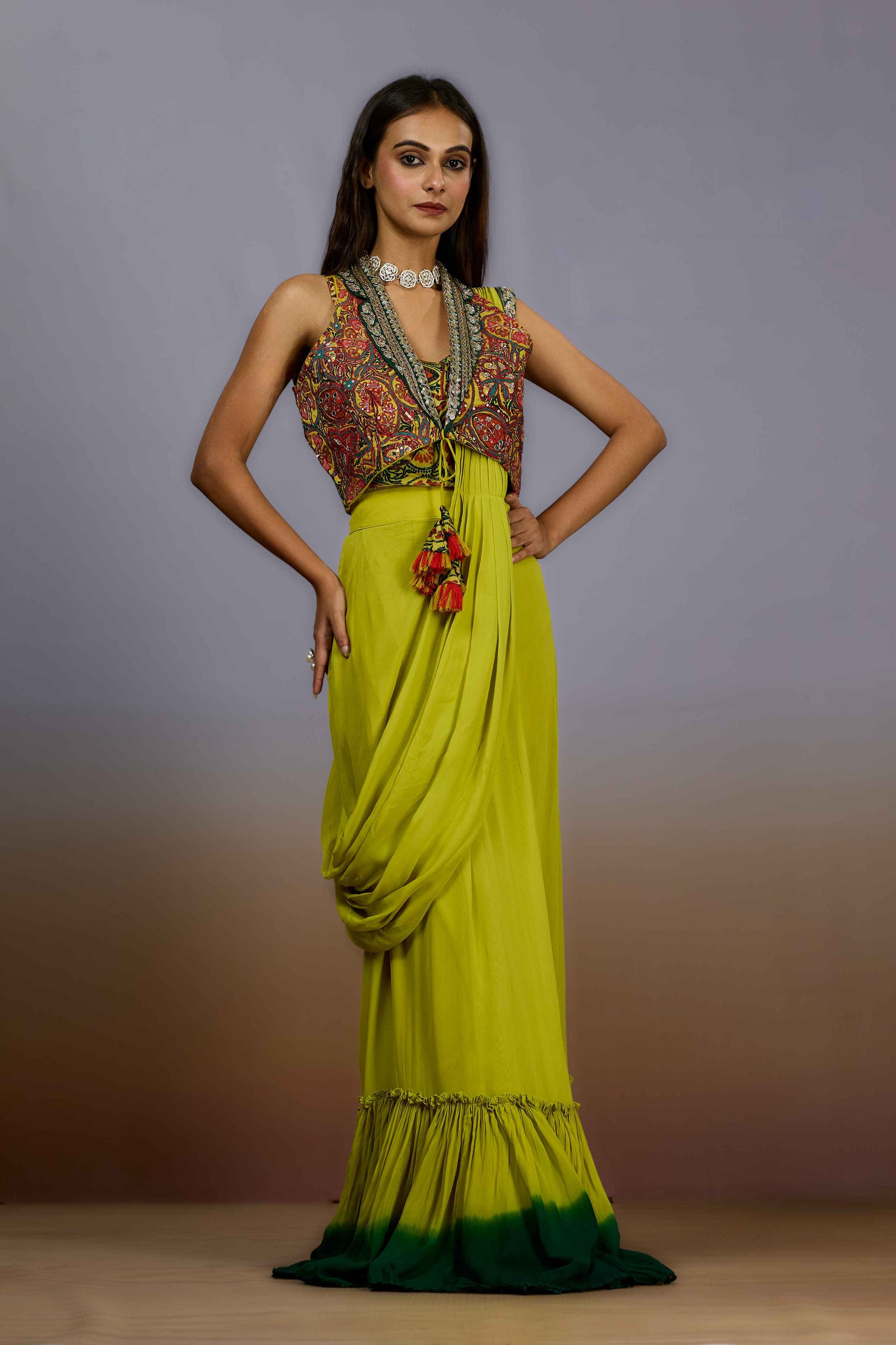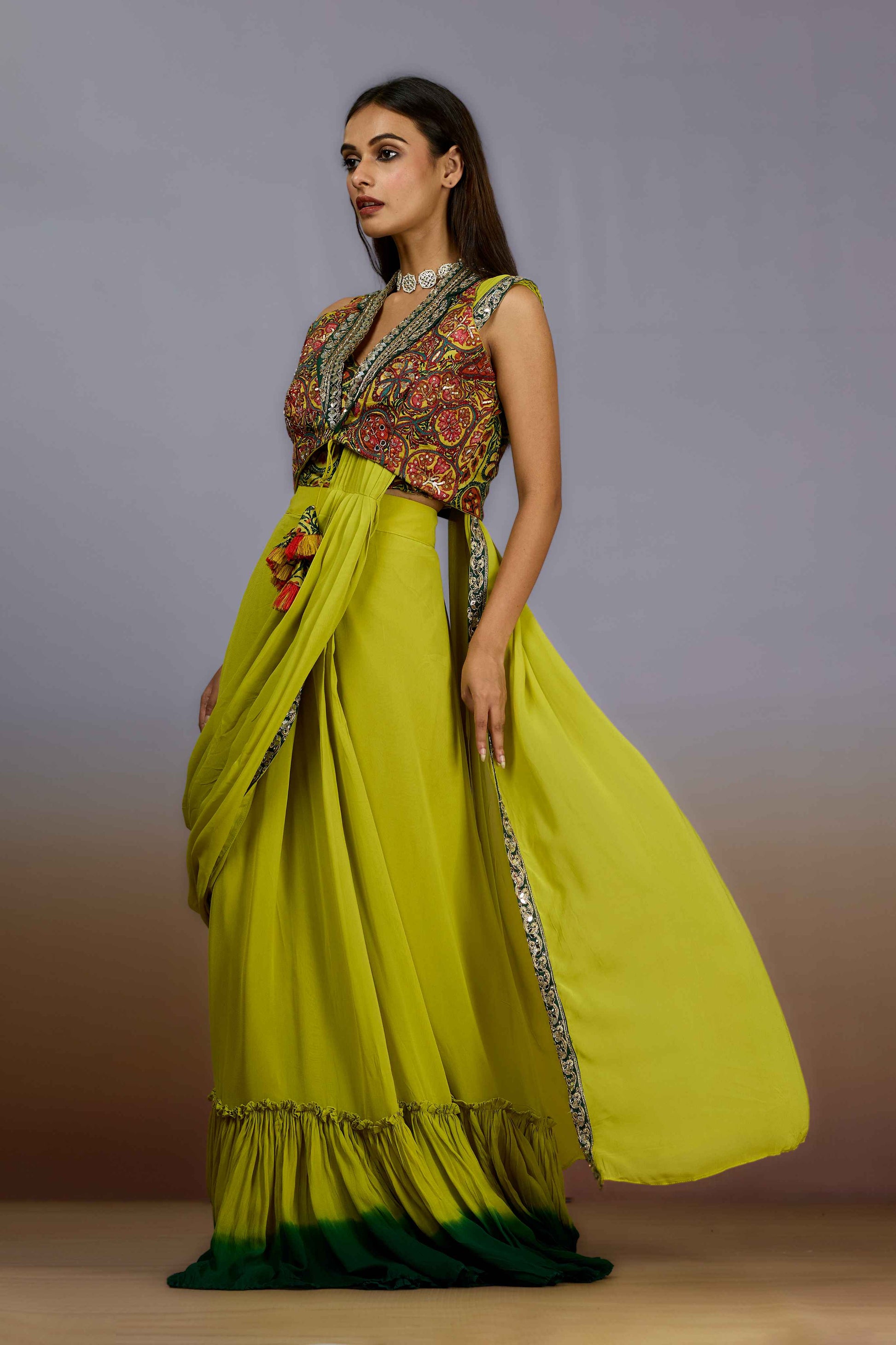 The Yellow Sequins Chinon Indo Western by Shreyshree is crafted from high-quality Chinon fabric adorned with refined sequin embellishments. This expertly designed piece seamlessly combines traditional aesthetics with contemporary style, offering both comfort and elegance for formal events and festive occasions.
