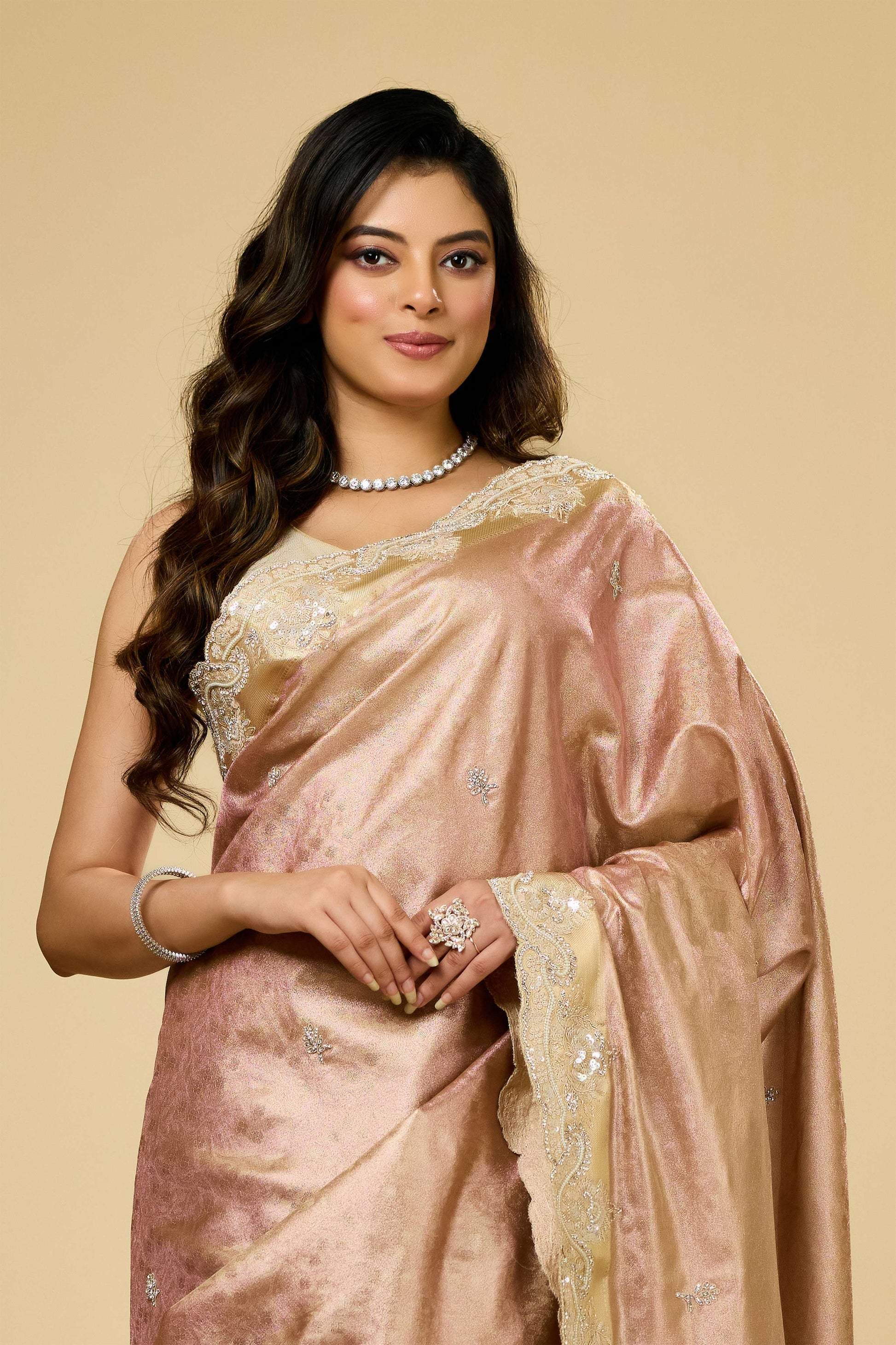 The Peach Cut Dana Jacquard Sarees by Shreyshree combine the rich texture of jacquard fabric with elegant cut dana embellishments, creating a sophisticated and tactile design. The soft peach hue enhances the saree’s graceful appeal, while the intricate detailing adds depth and refinement. Perfect for special occasions, this saree reflects expert craftsmanship and a harmonious blend of tradition and contemporary style.