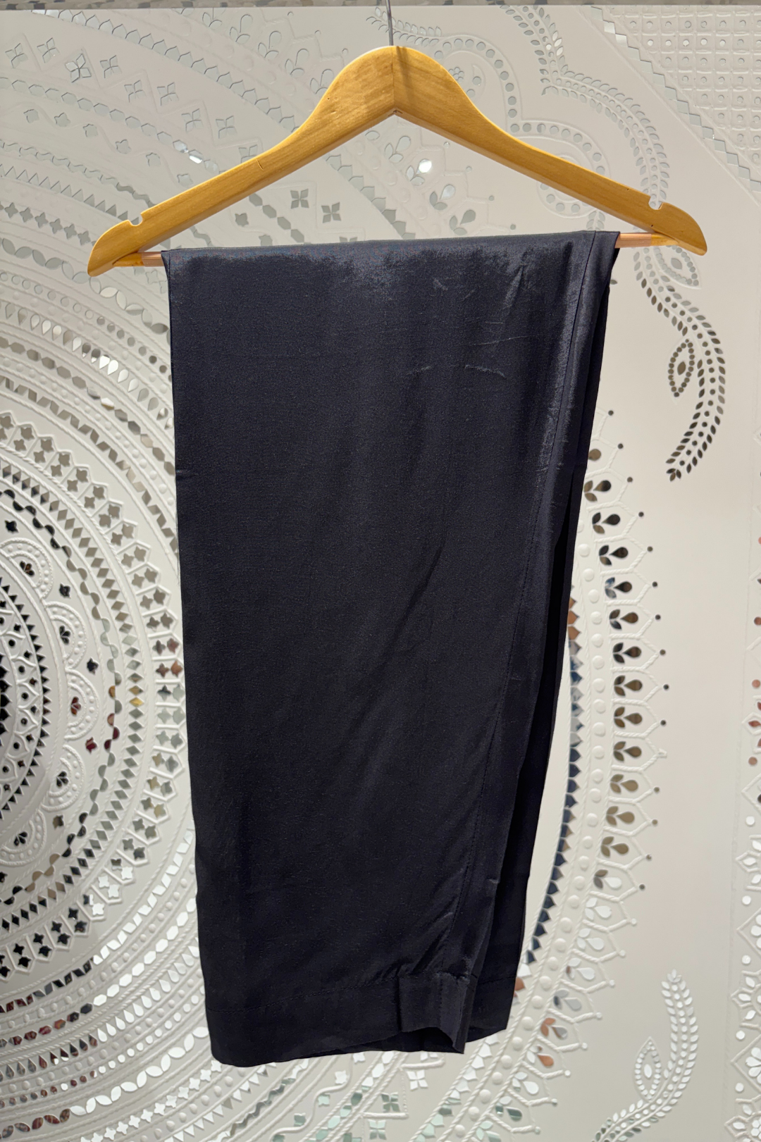 This black salwar suit features intricate printed patterns enhanced with elegant resham embroidery and delicate cut dana work, showcasing refined craftsmanship. Crafted from soft muslin fabric, it ensures comfort and breathability, ideal for semi-casual occasions. The outfit is paired with a stylish ikat dupatta that adds a contemporary touch, perfectly balancing traditional artistry with modern appeal for versatile wear