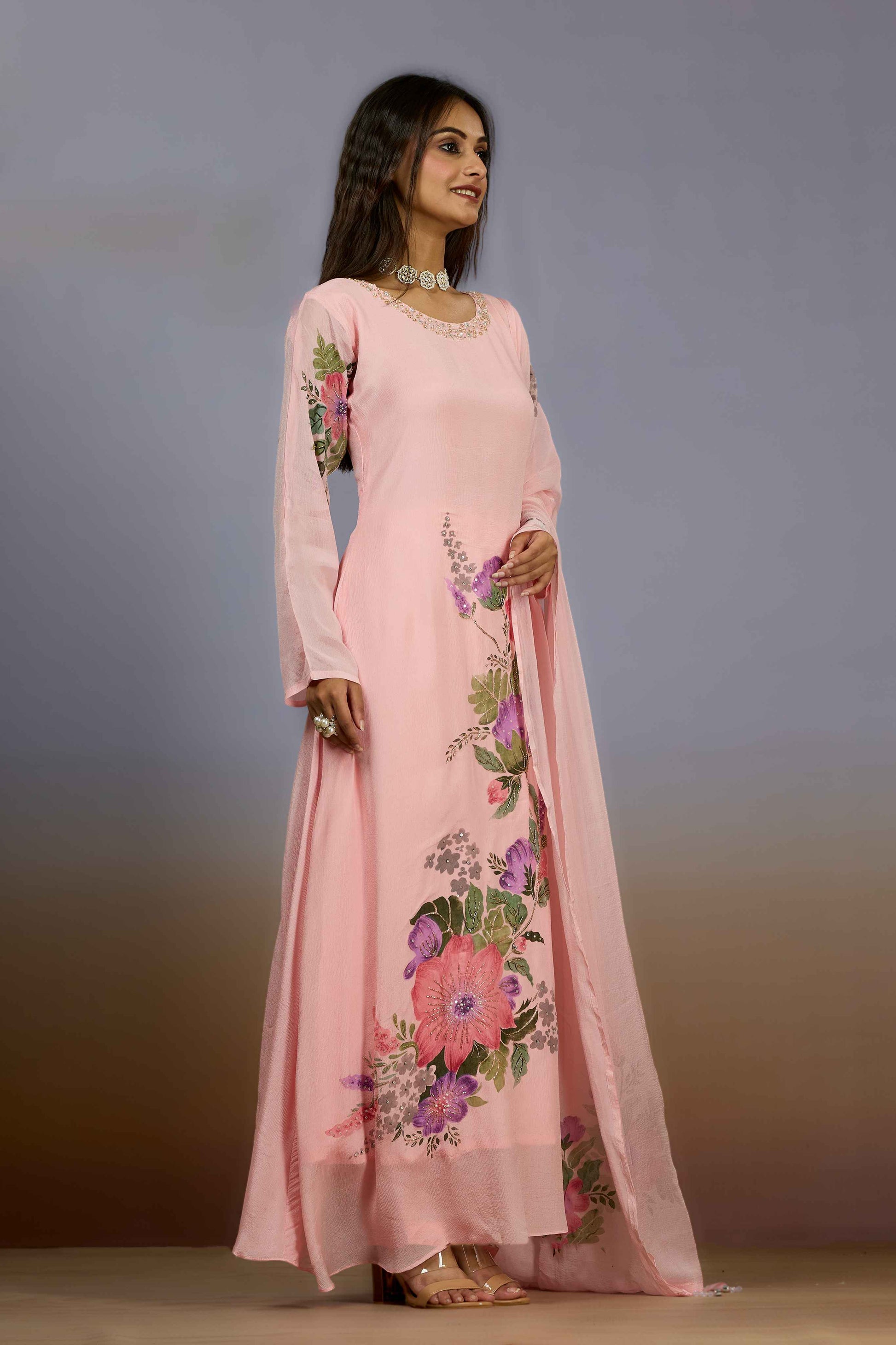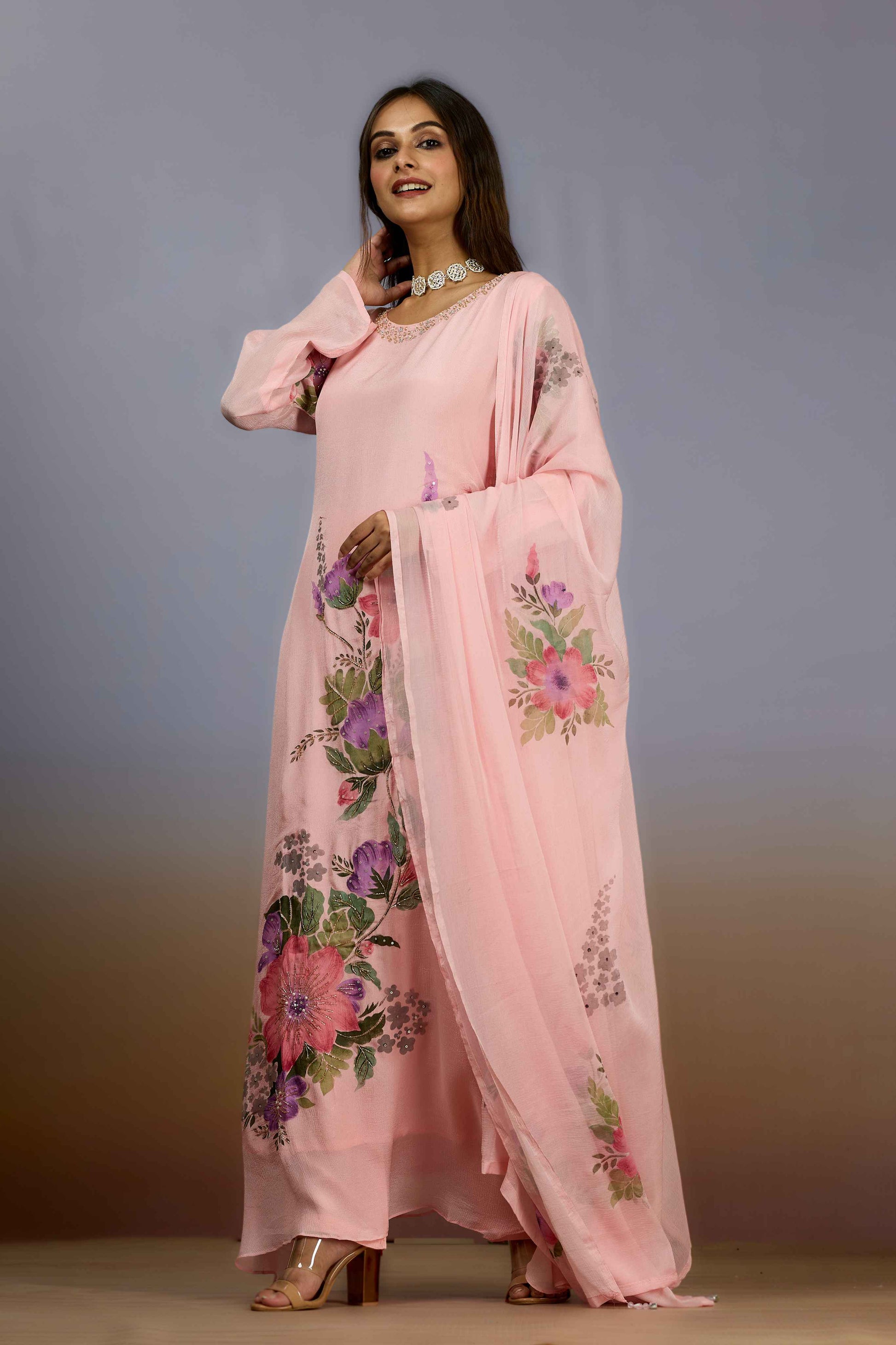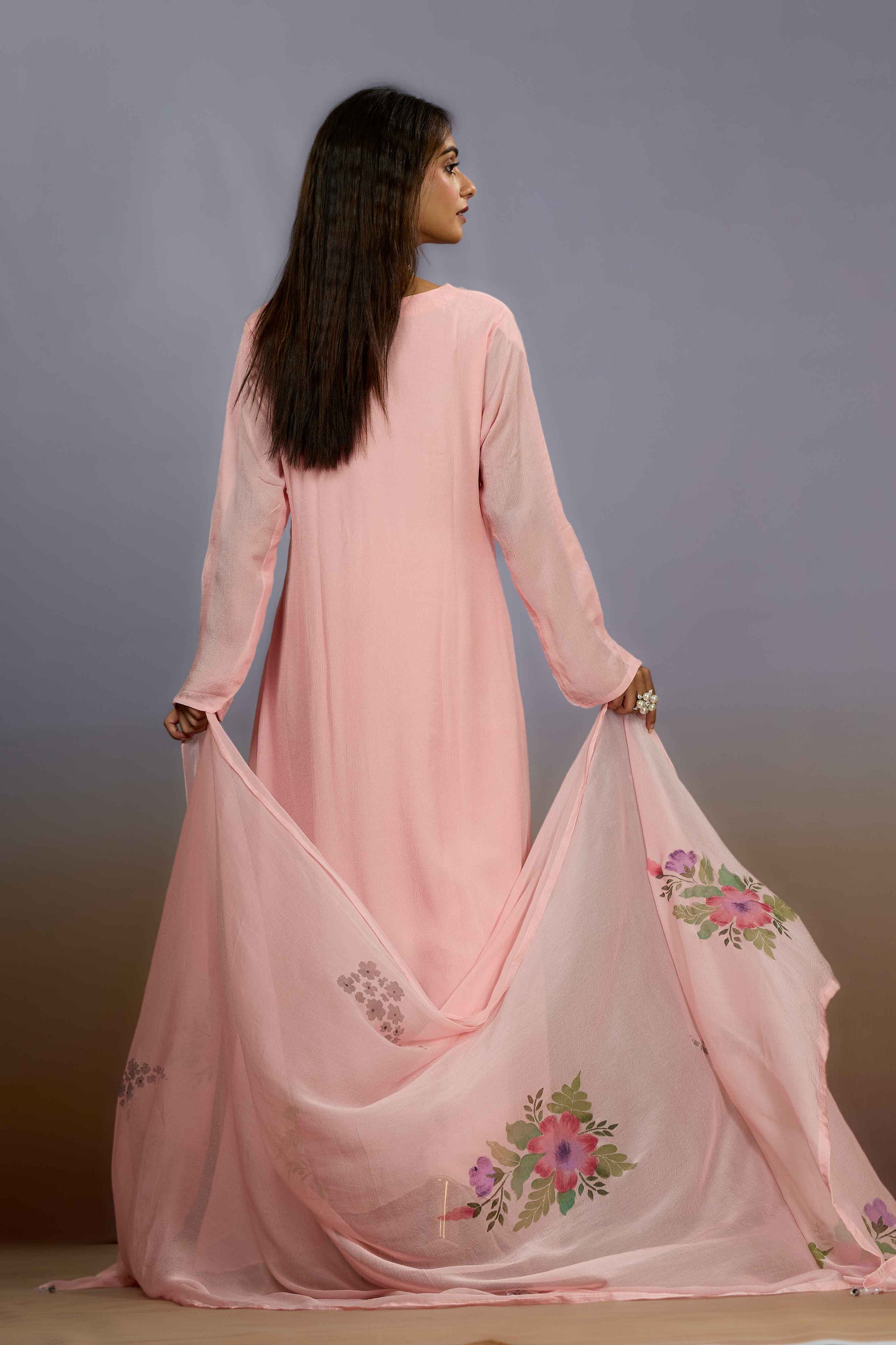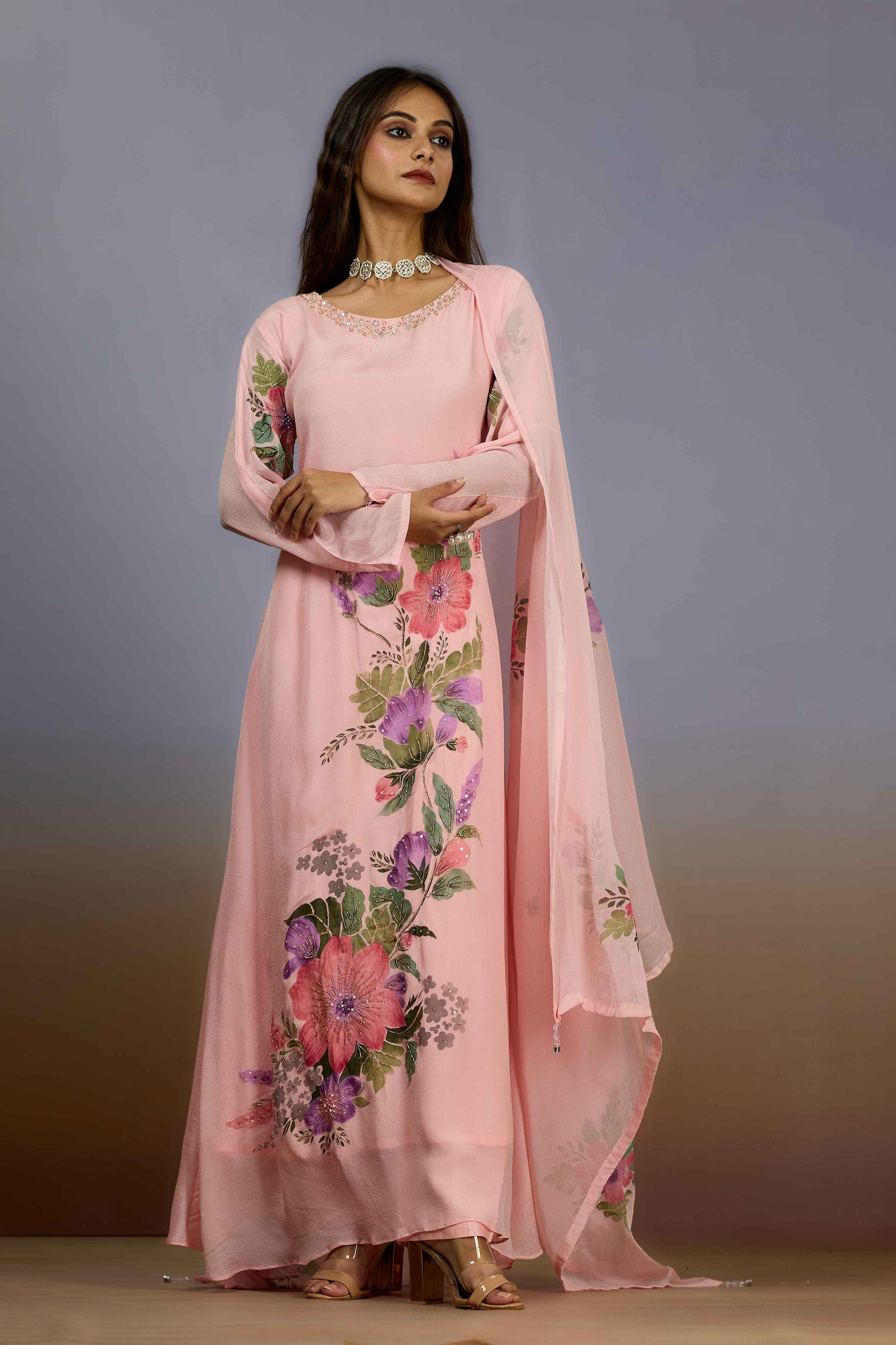 Shreyshree's Peach Pearlwork Chinon Salwar Suit features delicate pearl embellishments on soft Chinon fabric, combining traditional craftsmanship with contemporary design. The subtle peach hue enhances its refined detailing, making it an elegant choice for festive and formal occasions. This expertly tailored ensemble offers both grace and comfort.