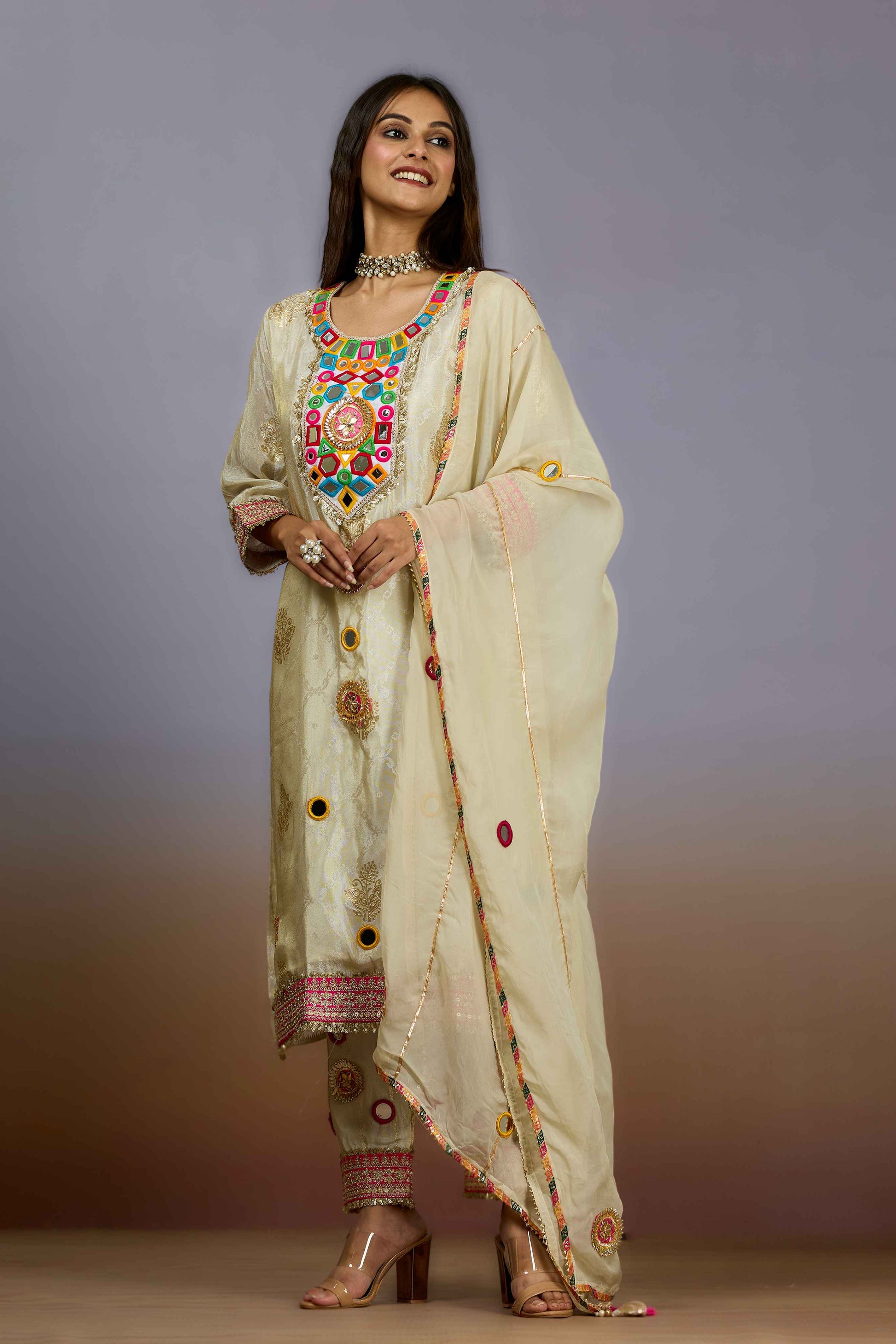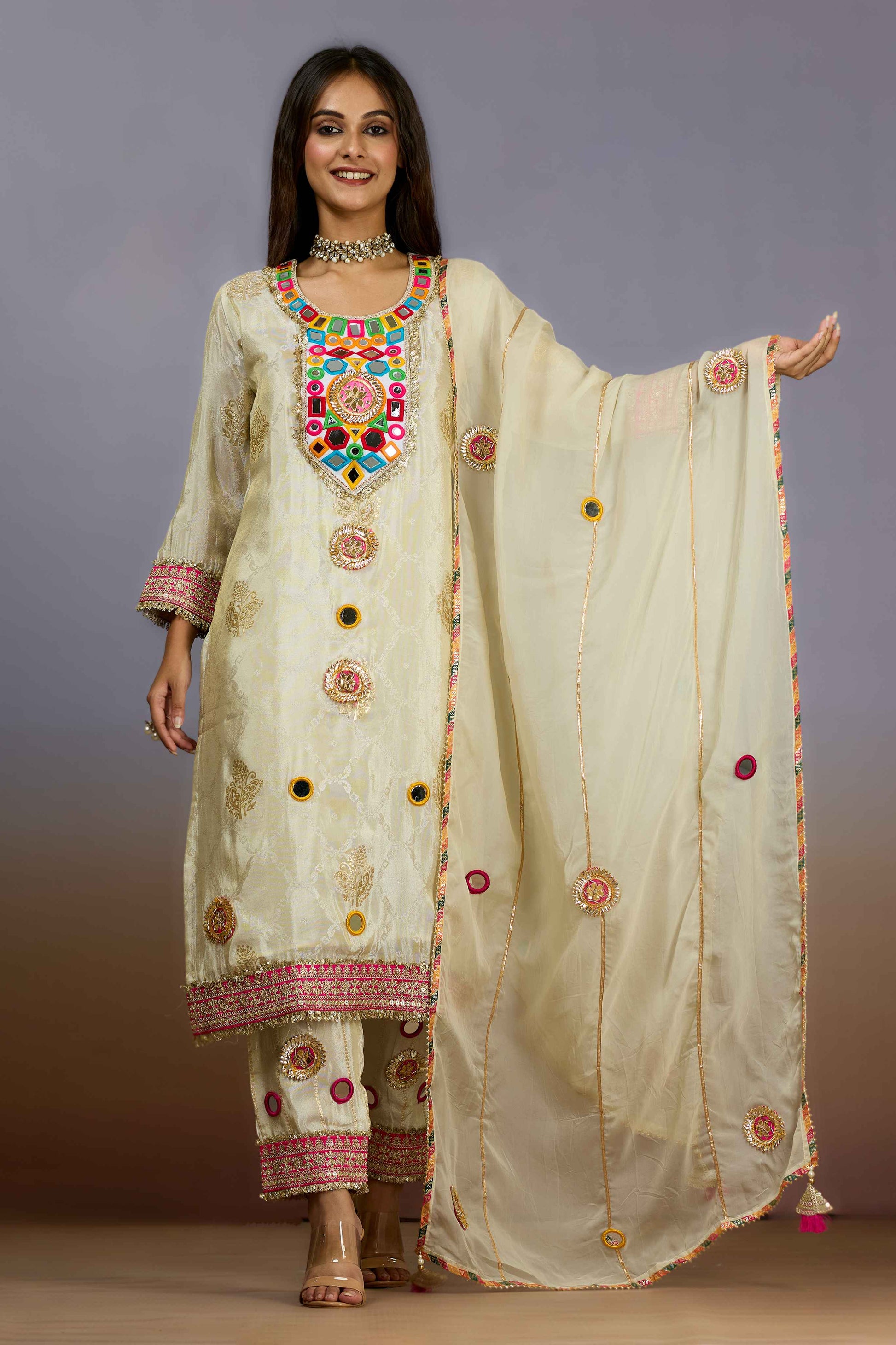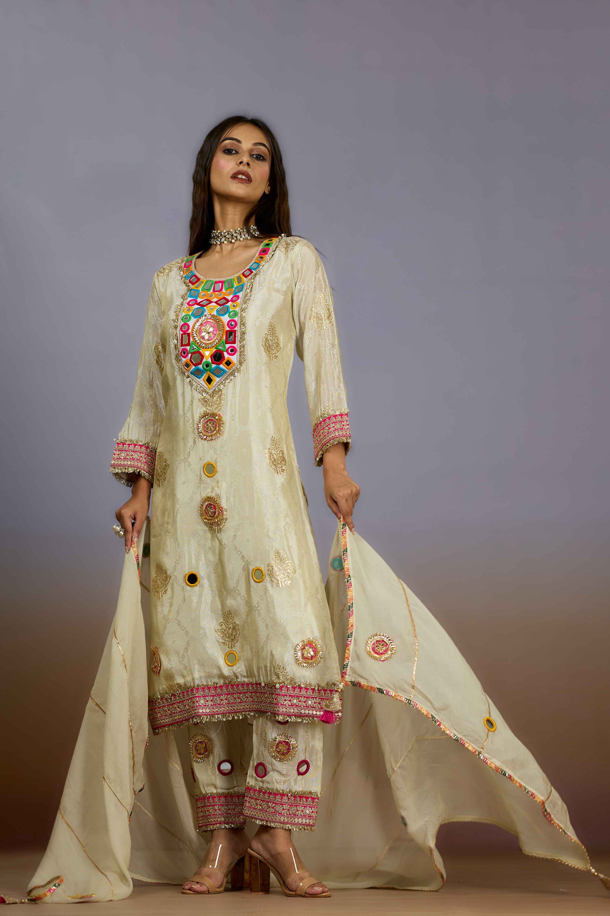 Cream mirrorwork Tissue Salwar Suits 1019-10102