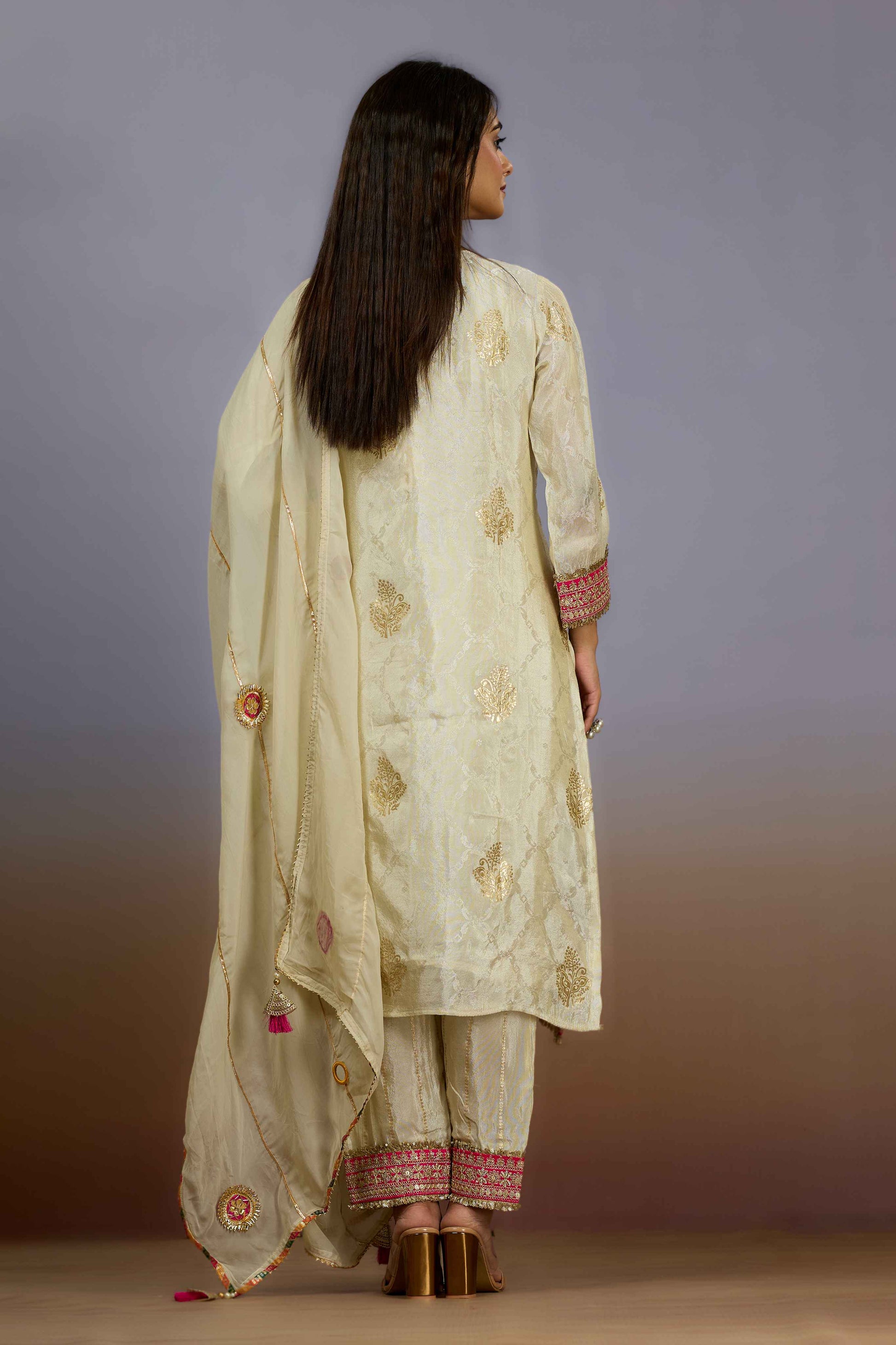Experience the elegance of Shreyshree's Cream Mirrorwork Tissue Salwar Suits. This exquisite ensemble features delicate mirrorwork embellishments on lightweight tissue fabric, blending traditional craftsmanship with graceful comfort. Ideal for special occasions, its subtle cream tone and intricate detailing create a sophisticated look that enhances your presence while ensuring ease of wear.