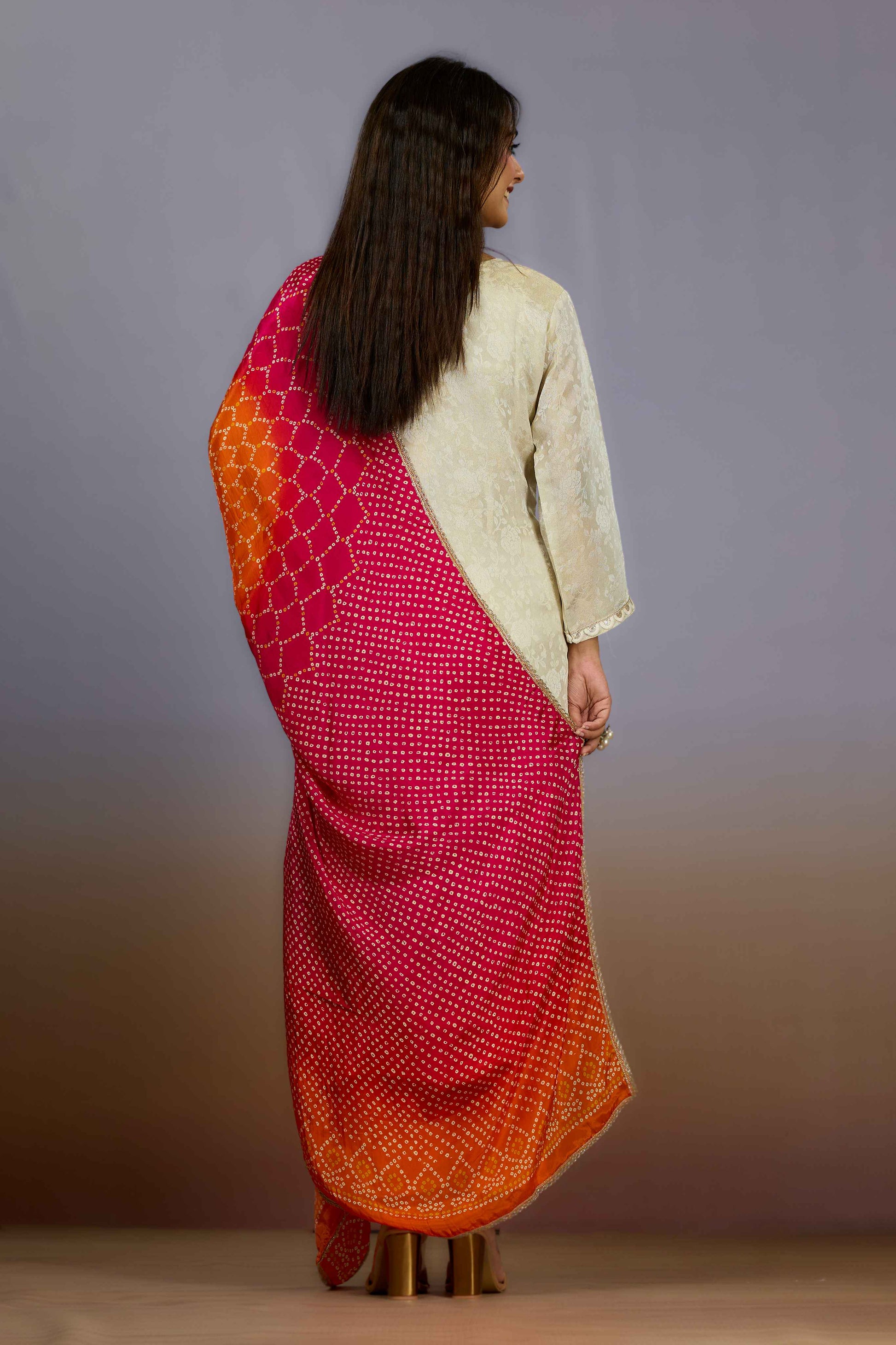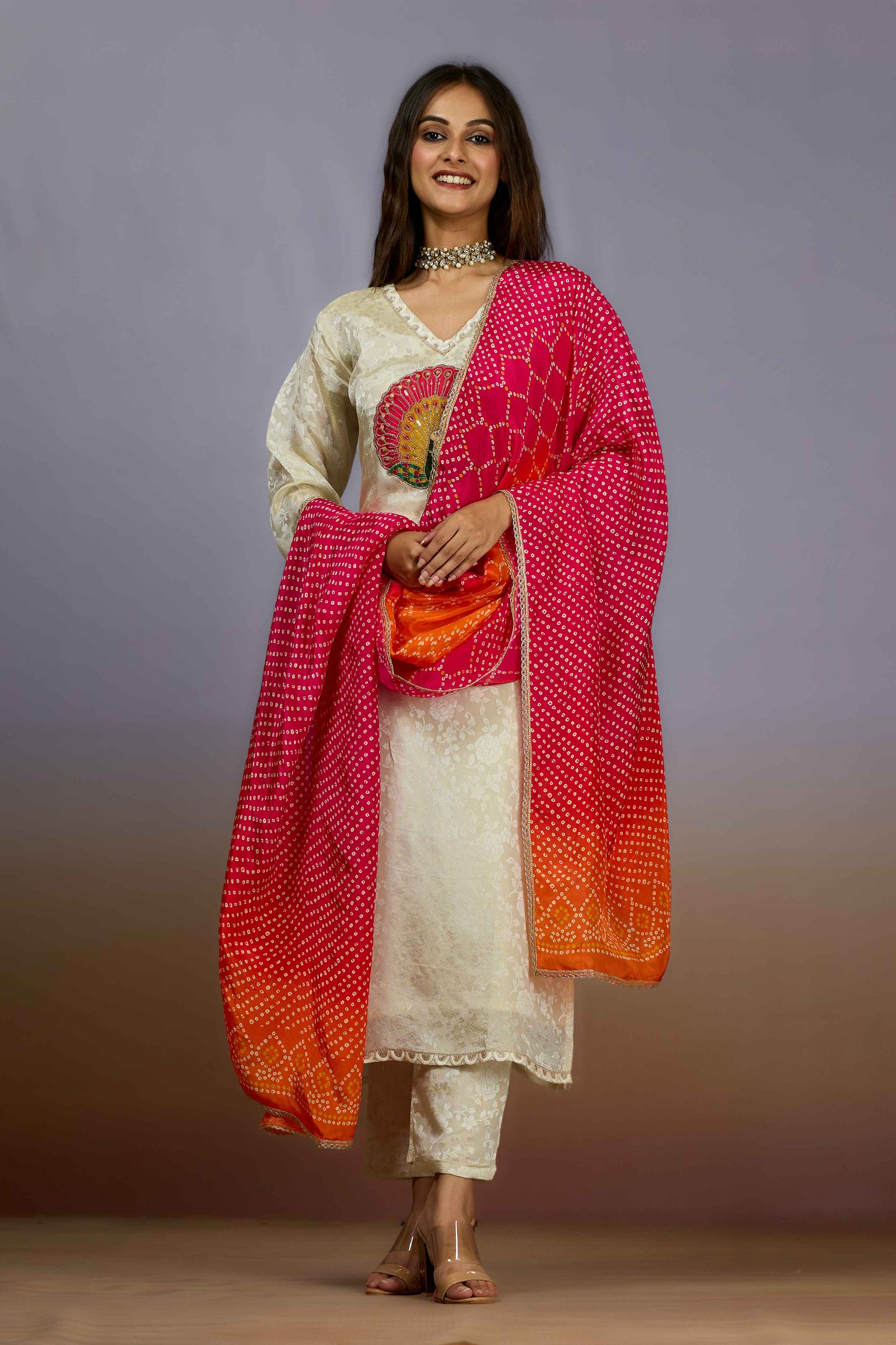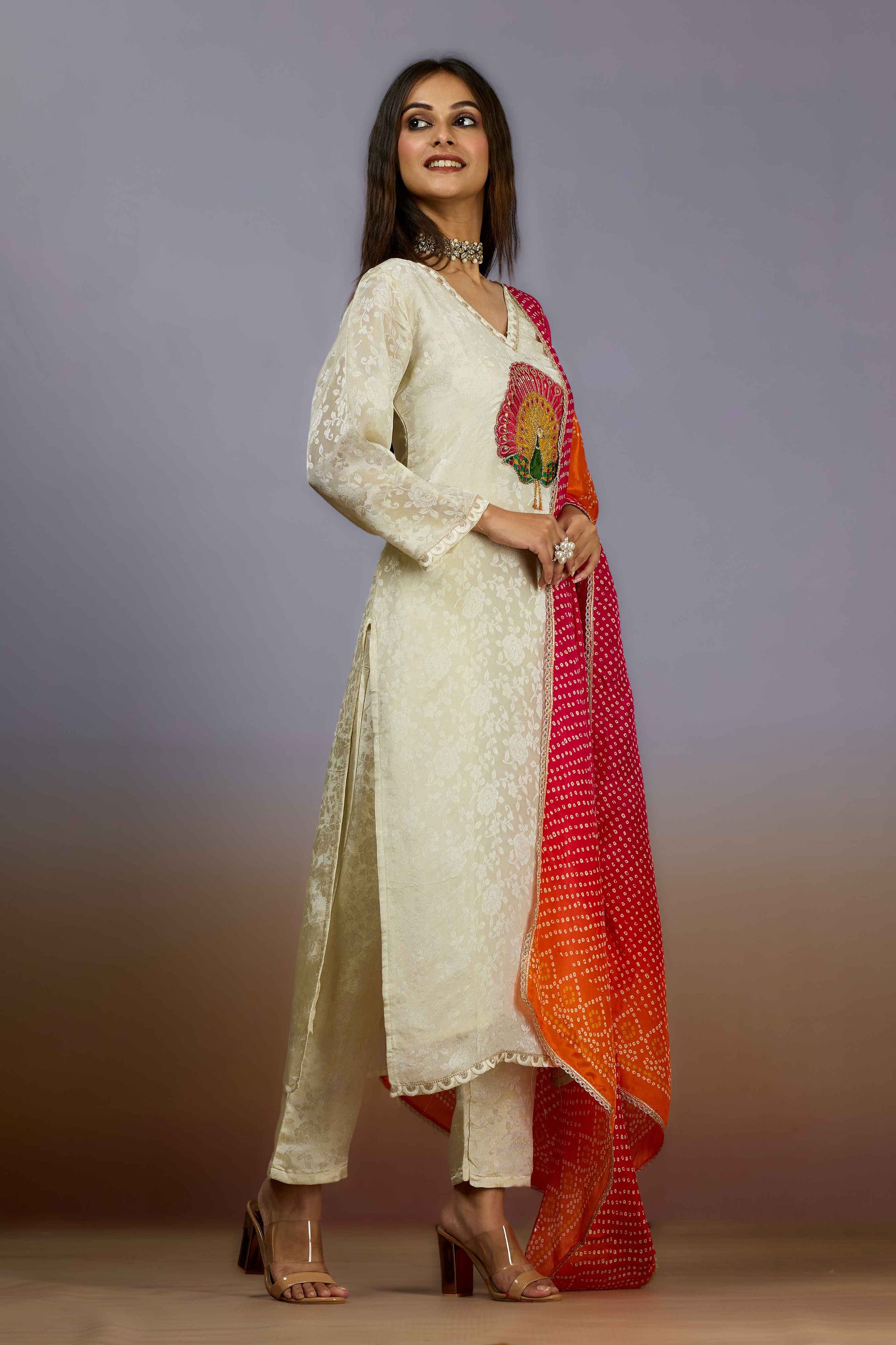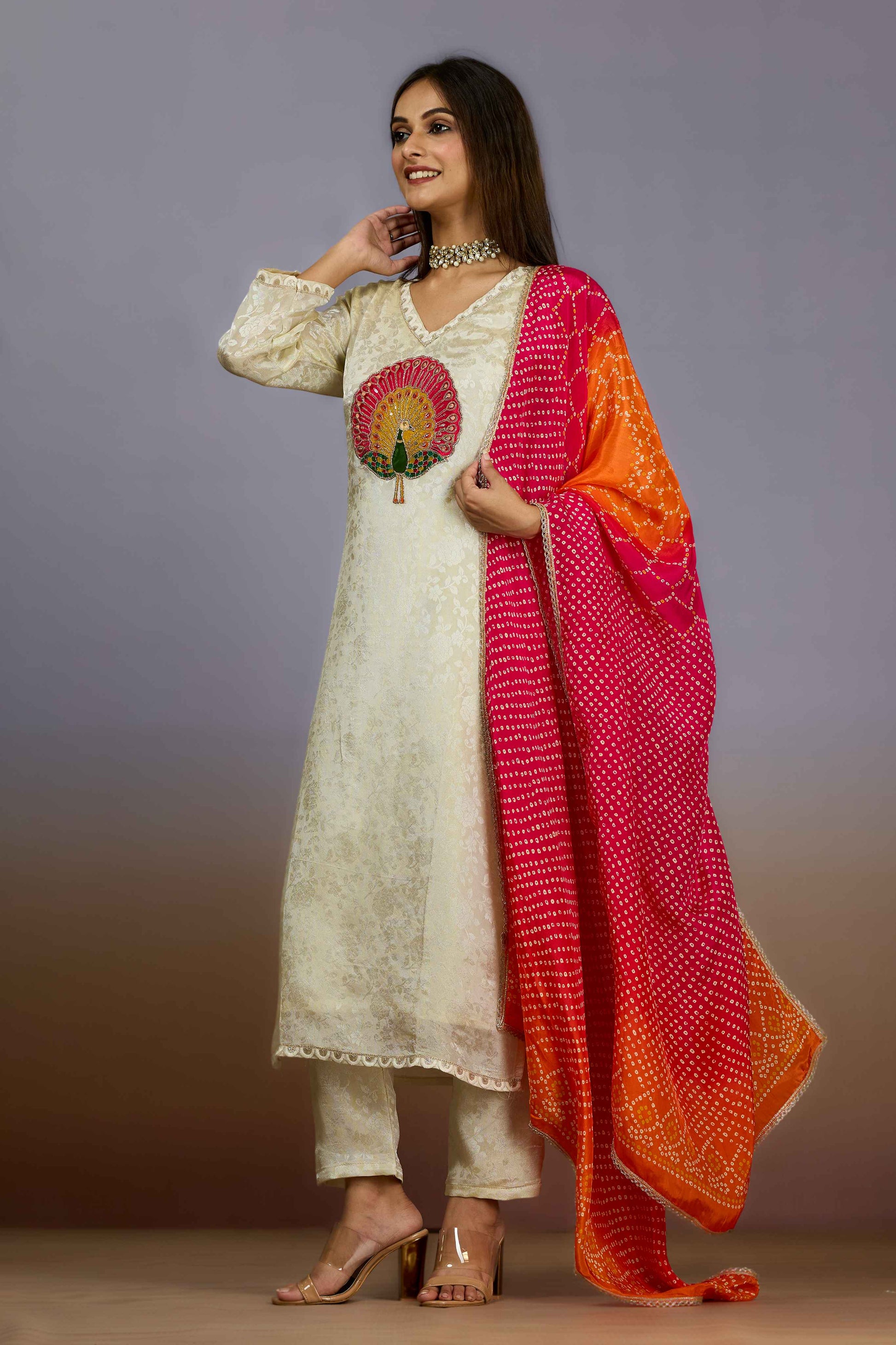 Shreyshree's Cream Sequins Tissue Salwar Suit combines delicate sequined embellishments with the lightweight elegance of tissue fabric. This expertly crafted ensemble offers a subtle shimmer that enhances its sophisticated cream tone, making it ideal for festive and formal occasions. Designed to provide both comfort and style, it reflects refined Indian craftsmanship and contemporary aesthetics.