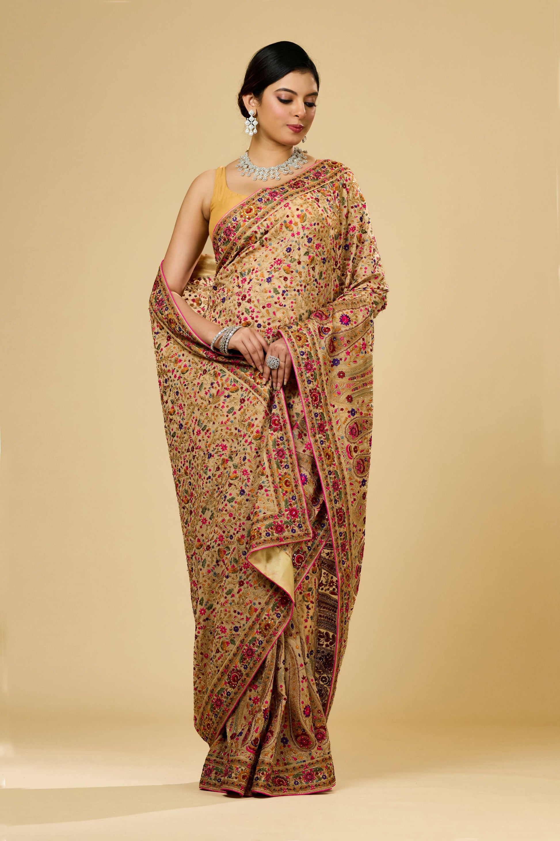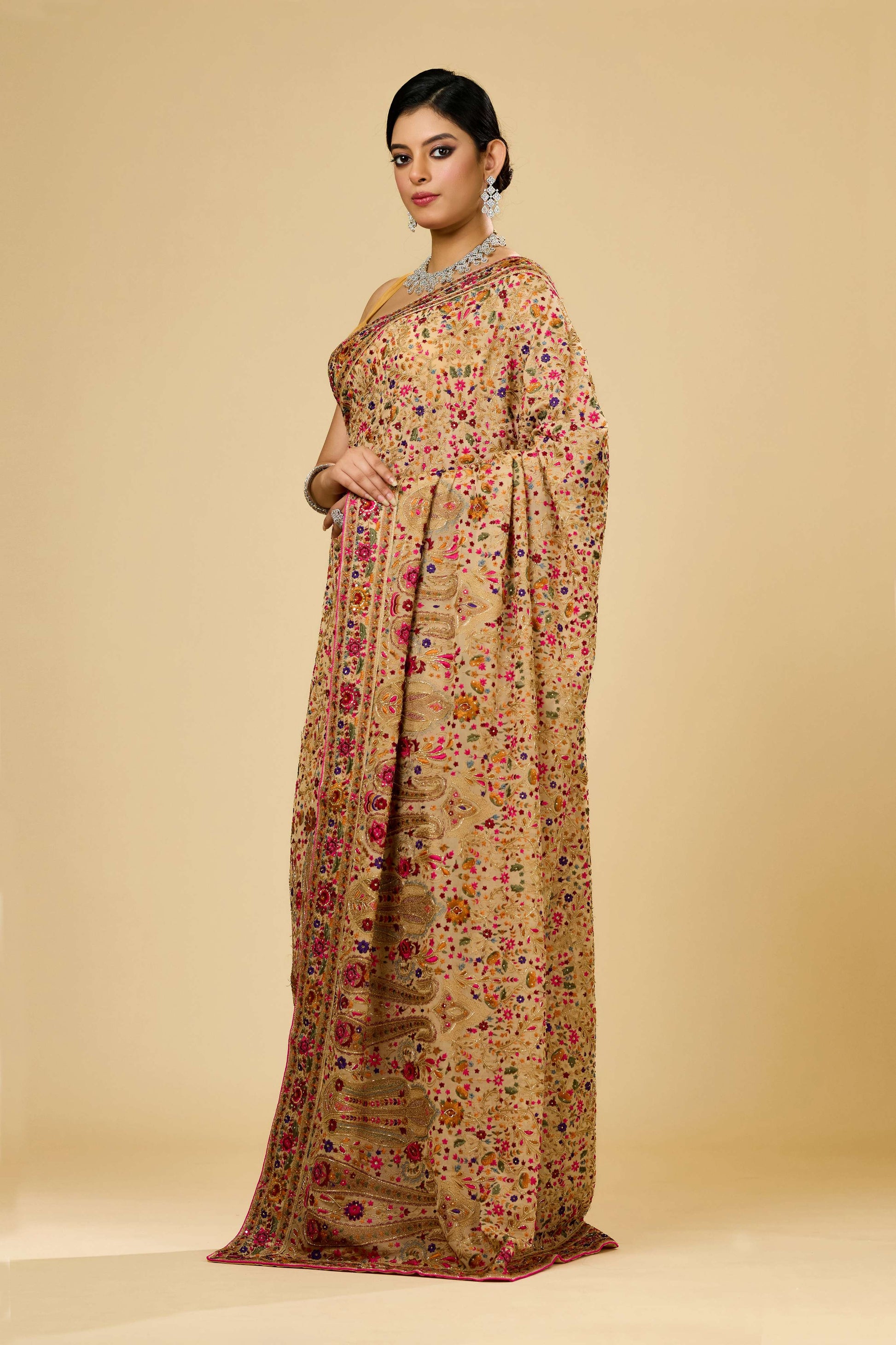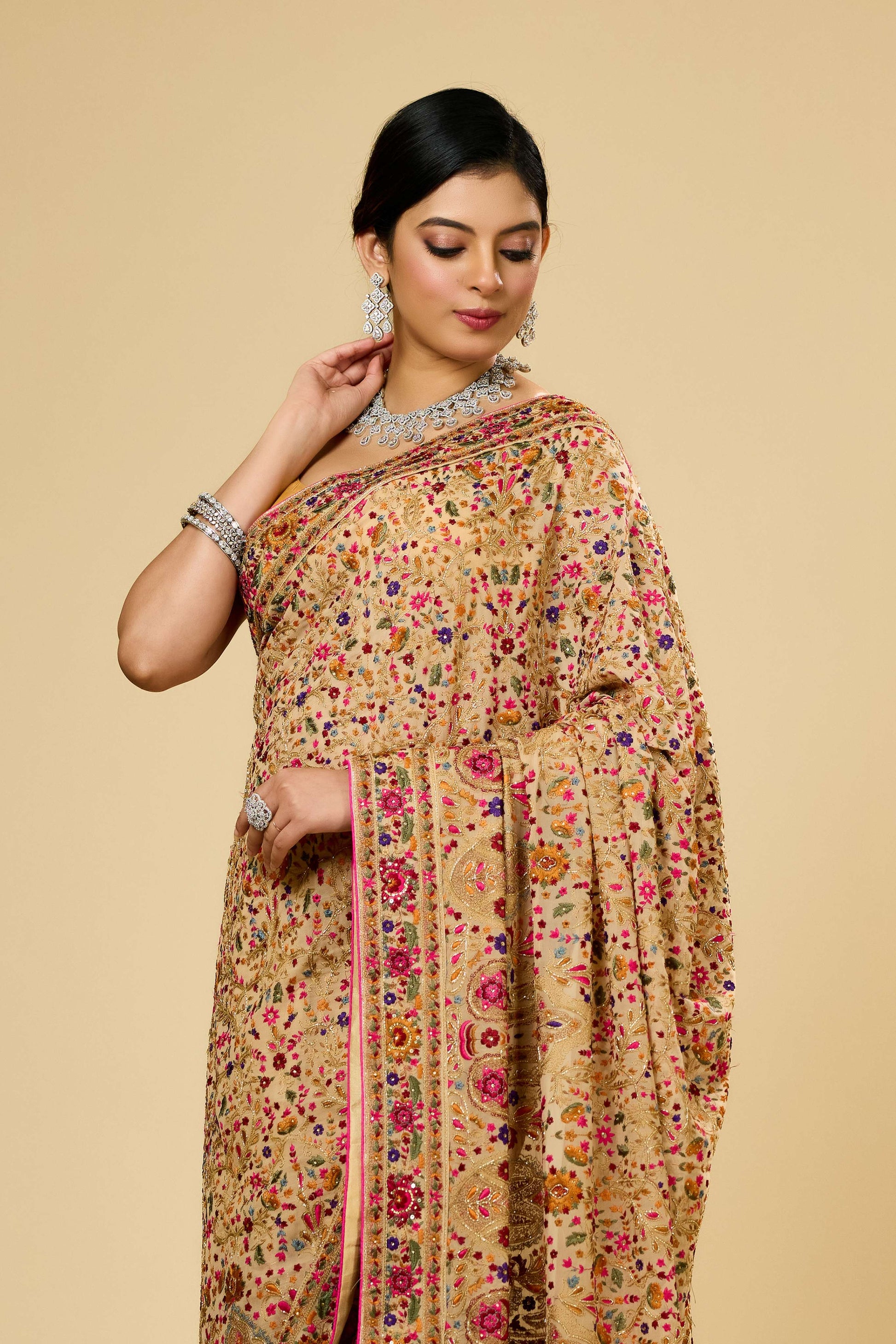 Elevate your wardrobe with the Beige Kashmiri Georgette Saree from Shreyshree. Crafted from lightweight georgette fabric, this saree offers graceful drape and comfort. Its subtle beige hue is enhanced by intricate Kashmiri embroidery, showcasing expert craftsmanship and timeless elegance. Perfect for formal occasions, this saree combines traditional artistry with modern sophistication.