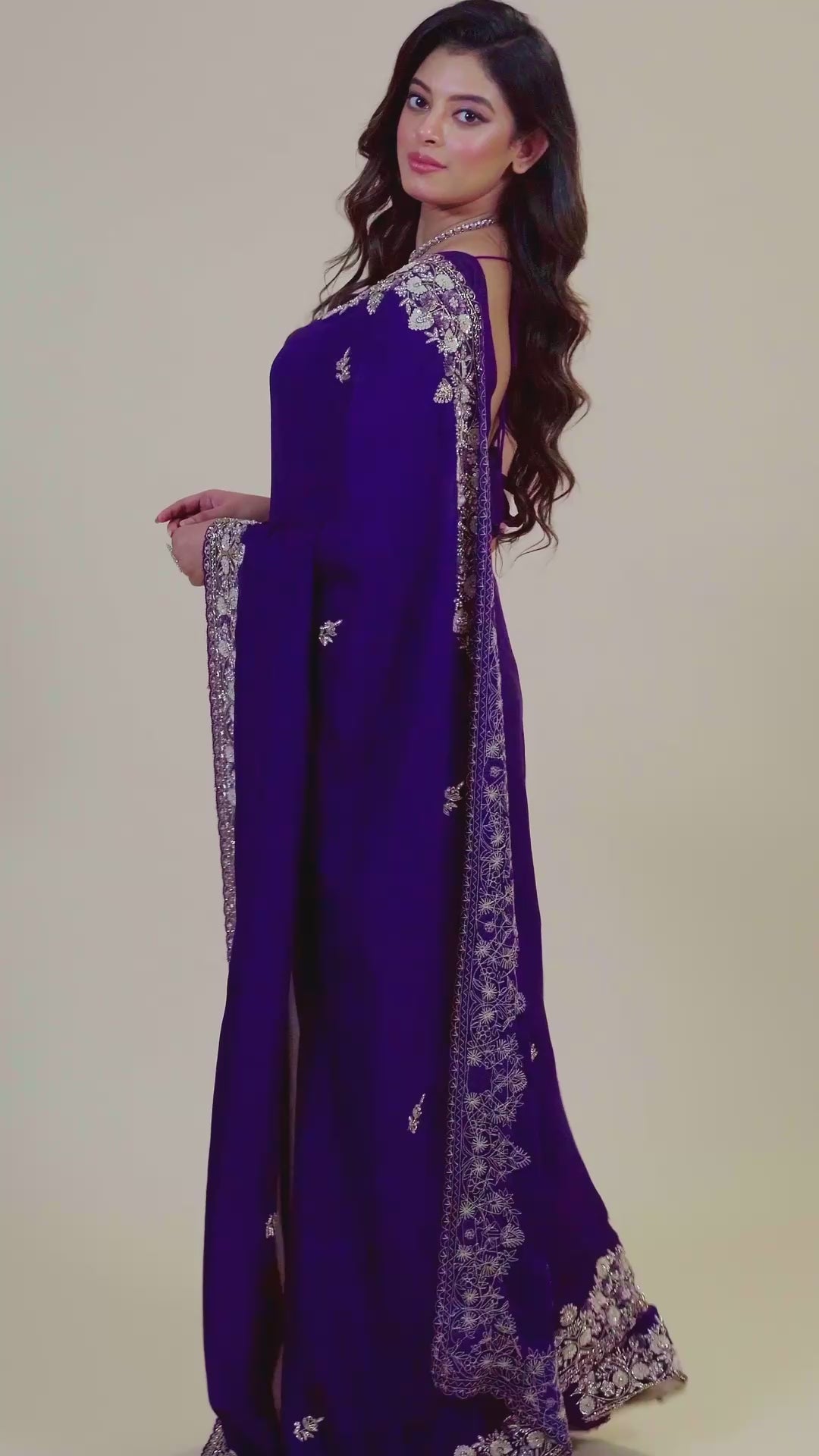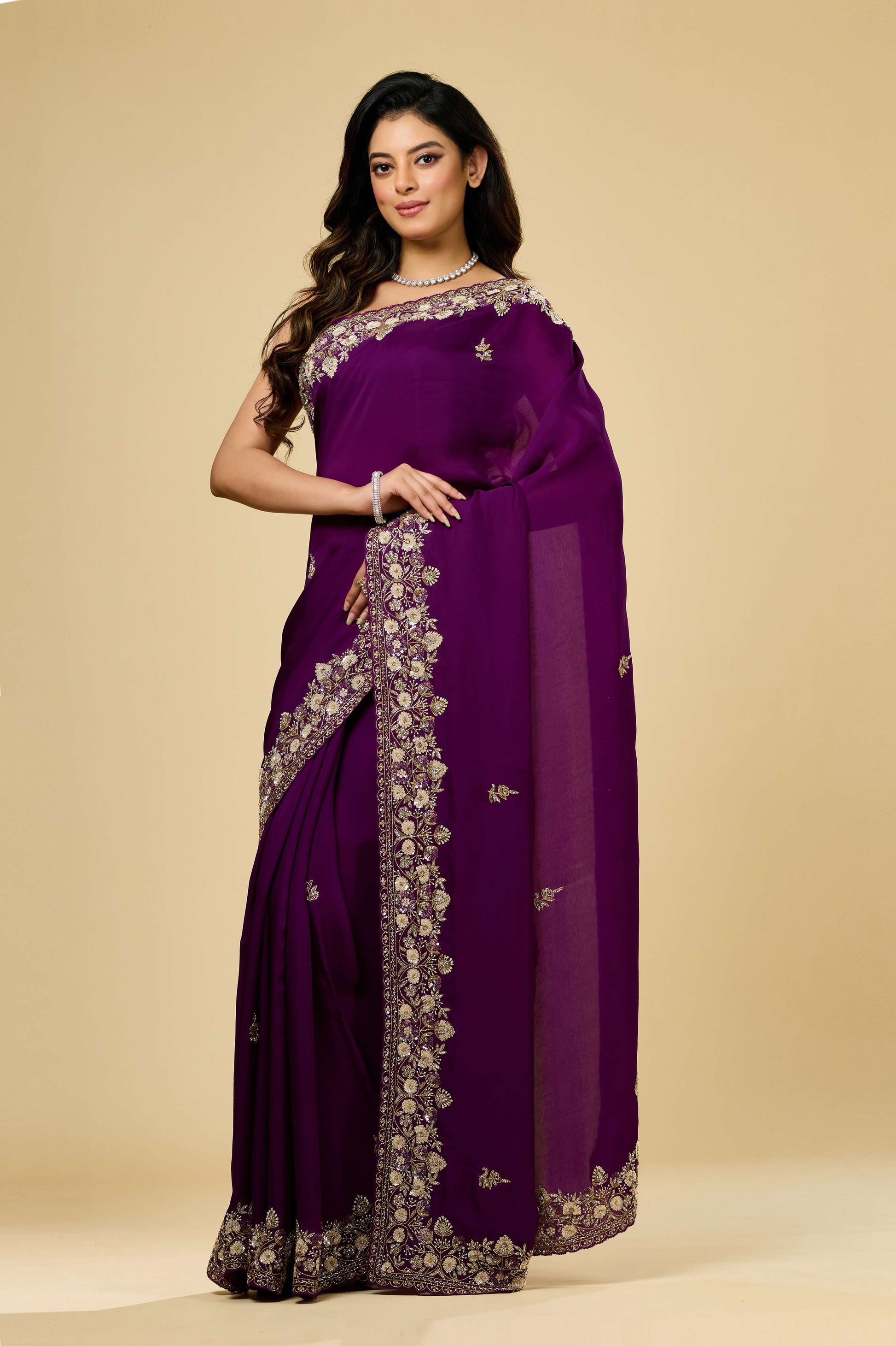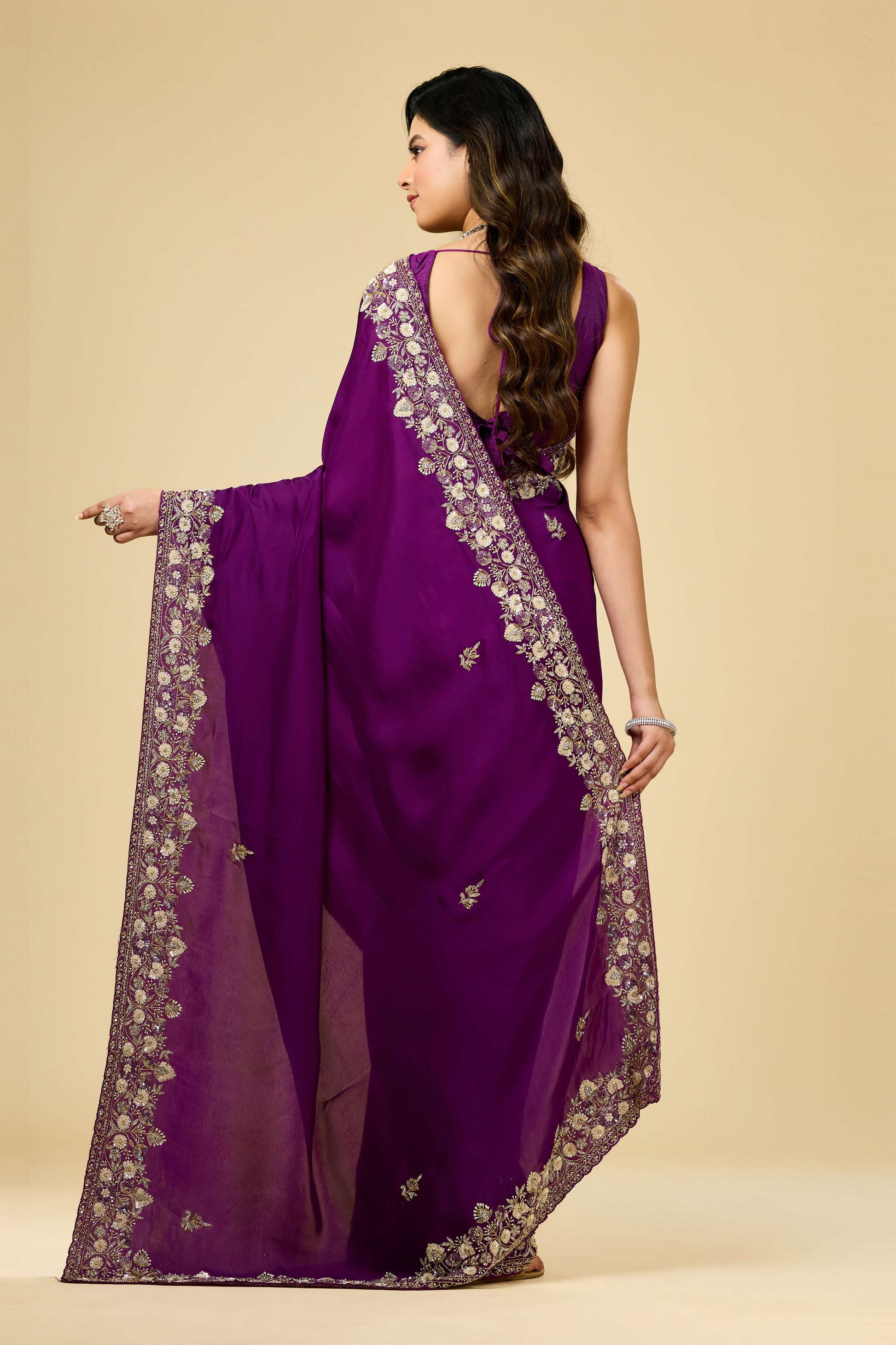 The Wine Sequins Organza Saree by Shreyshree exemplifies luxury with its sheer organza fabric adorned with delicate sequin embellishments. This saree offers a lightweight, translucent drape that enhances its rich wine color, creating a striking yet elegant look. Ideal for evening events and celebrations, it combines sophisticated design with expert craftsmanship to ensure a graceful and memorable appearance.