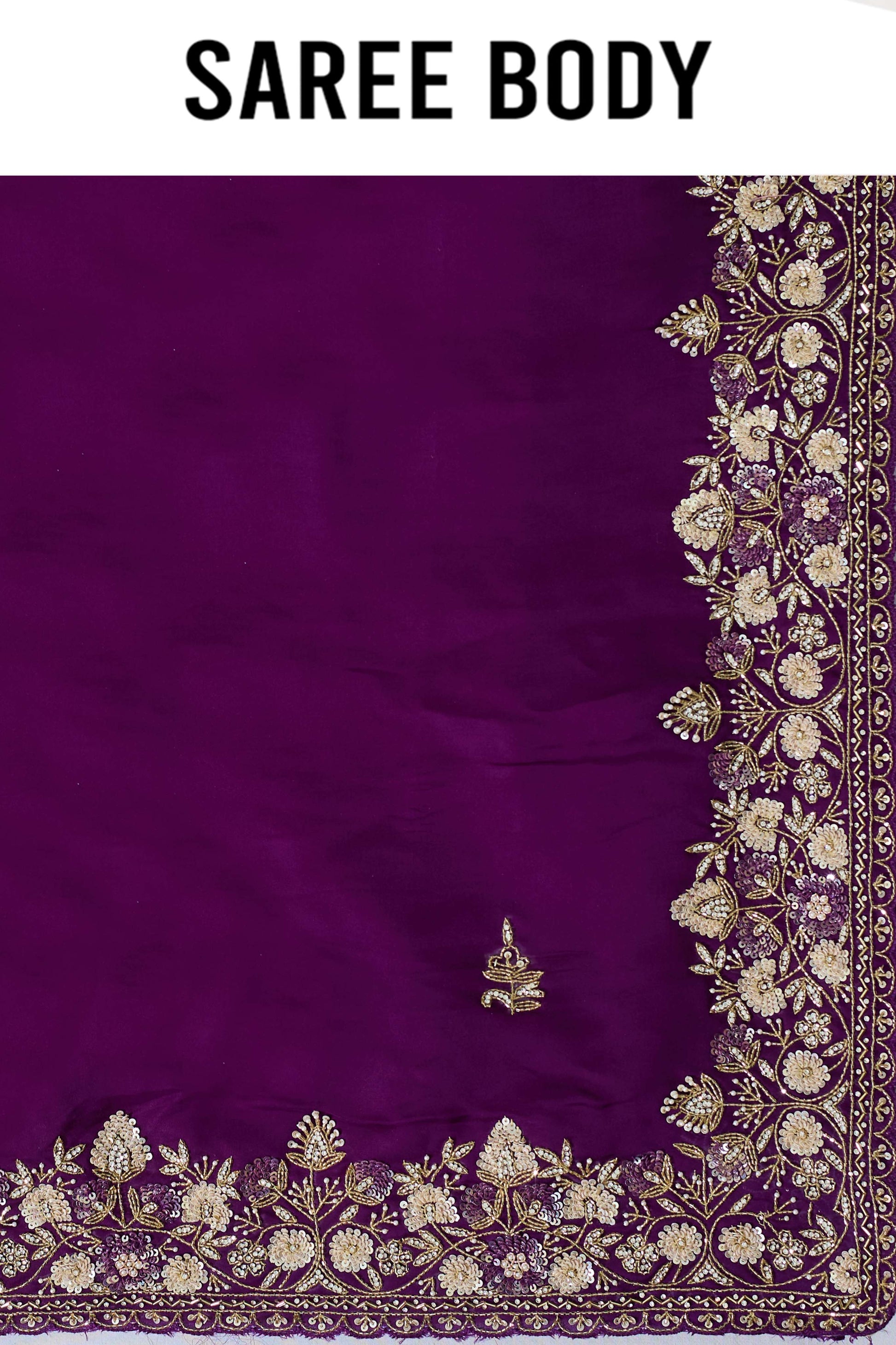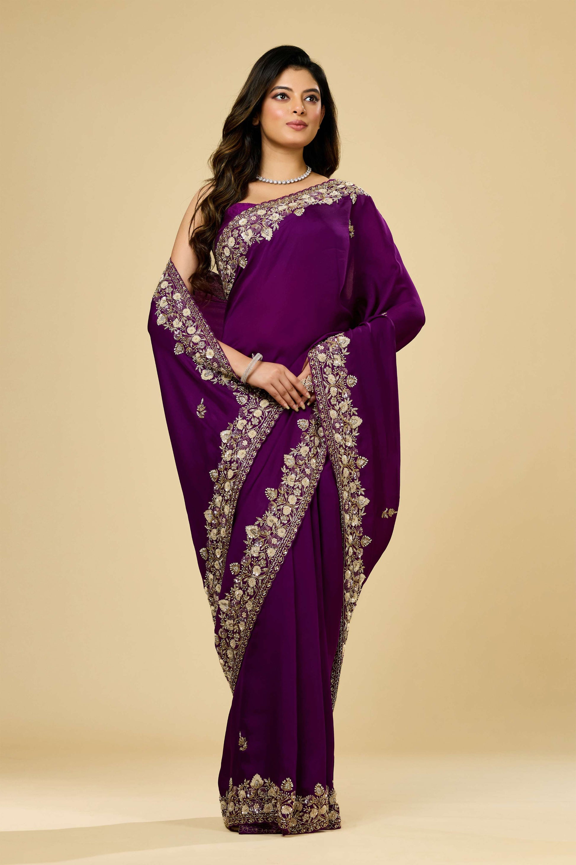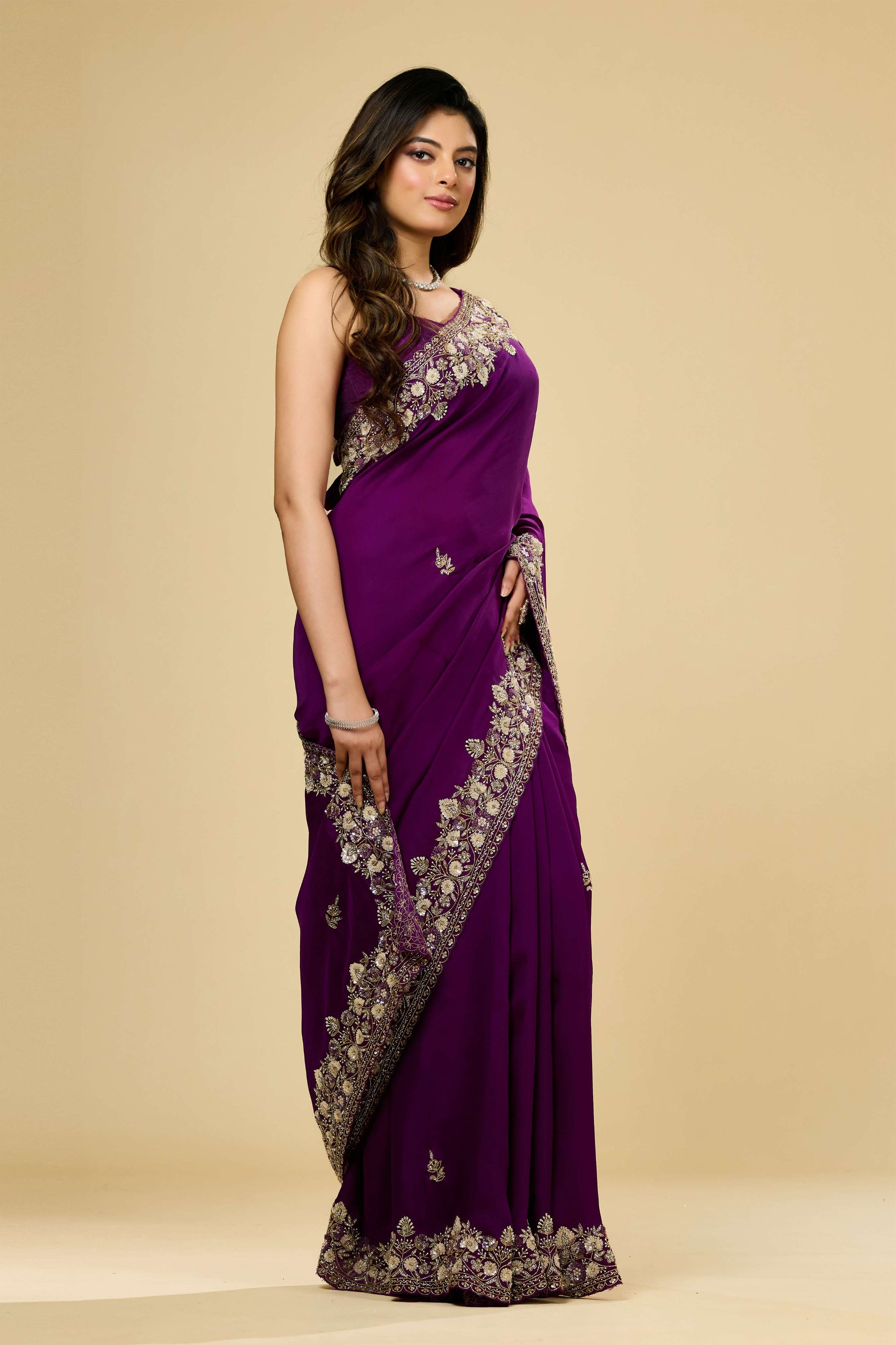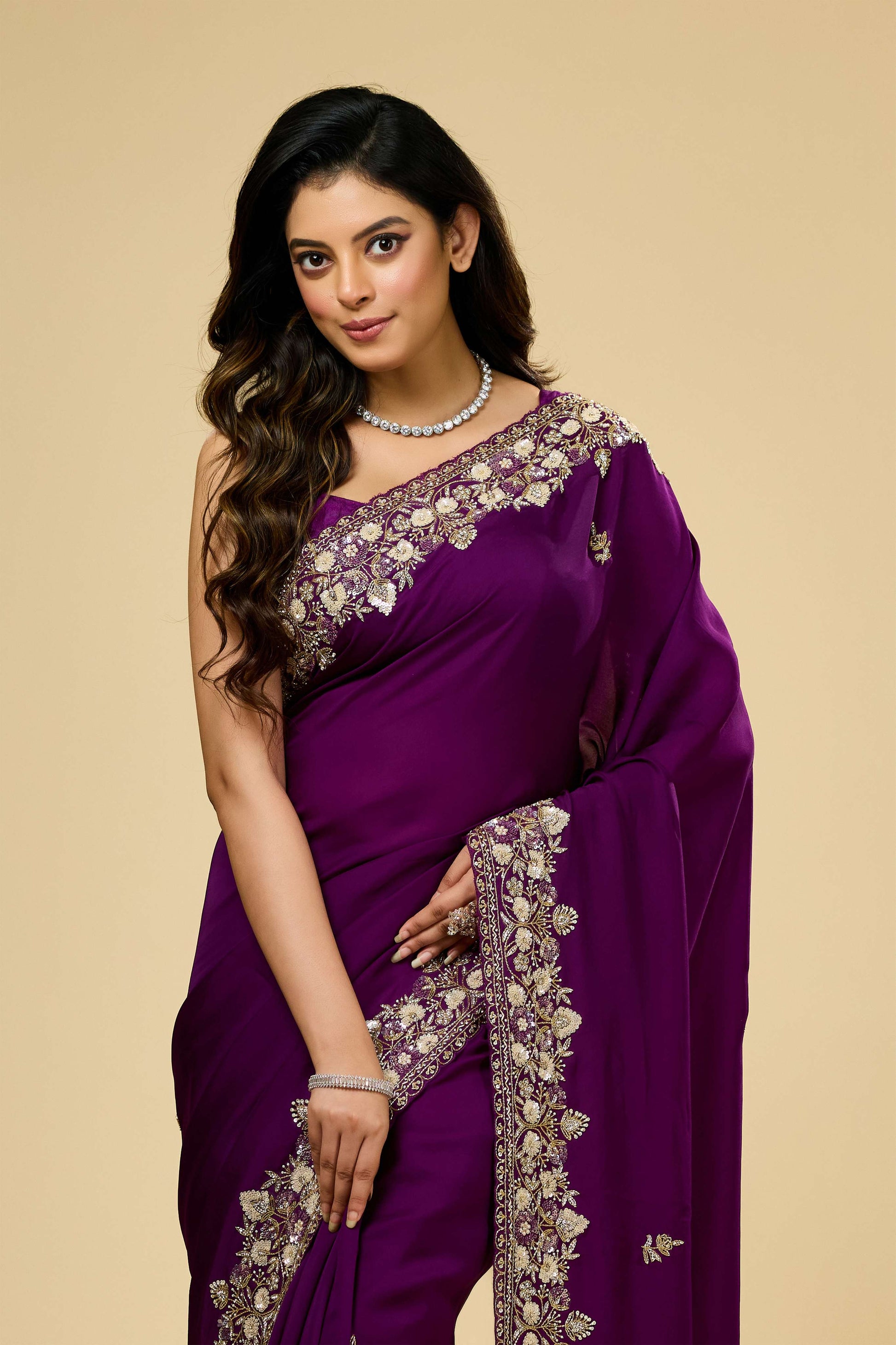 The Wine Sequins Organza Saree by Shreyshree exemplifies luxury with its sheer organza fabric adorned with delicate sequin embellishments. This saree offers a lightweight, translucent drape that enhances its rich wine color, creating a striking yet elegant look. Ideal for evening events and celebrations, it combines sophisticated design with expert craftsmanship to ensure a graceful and memorable appearance.