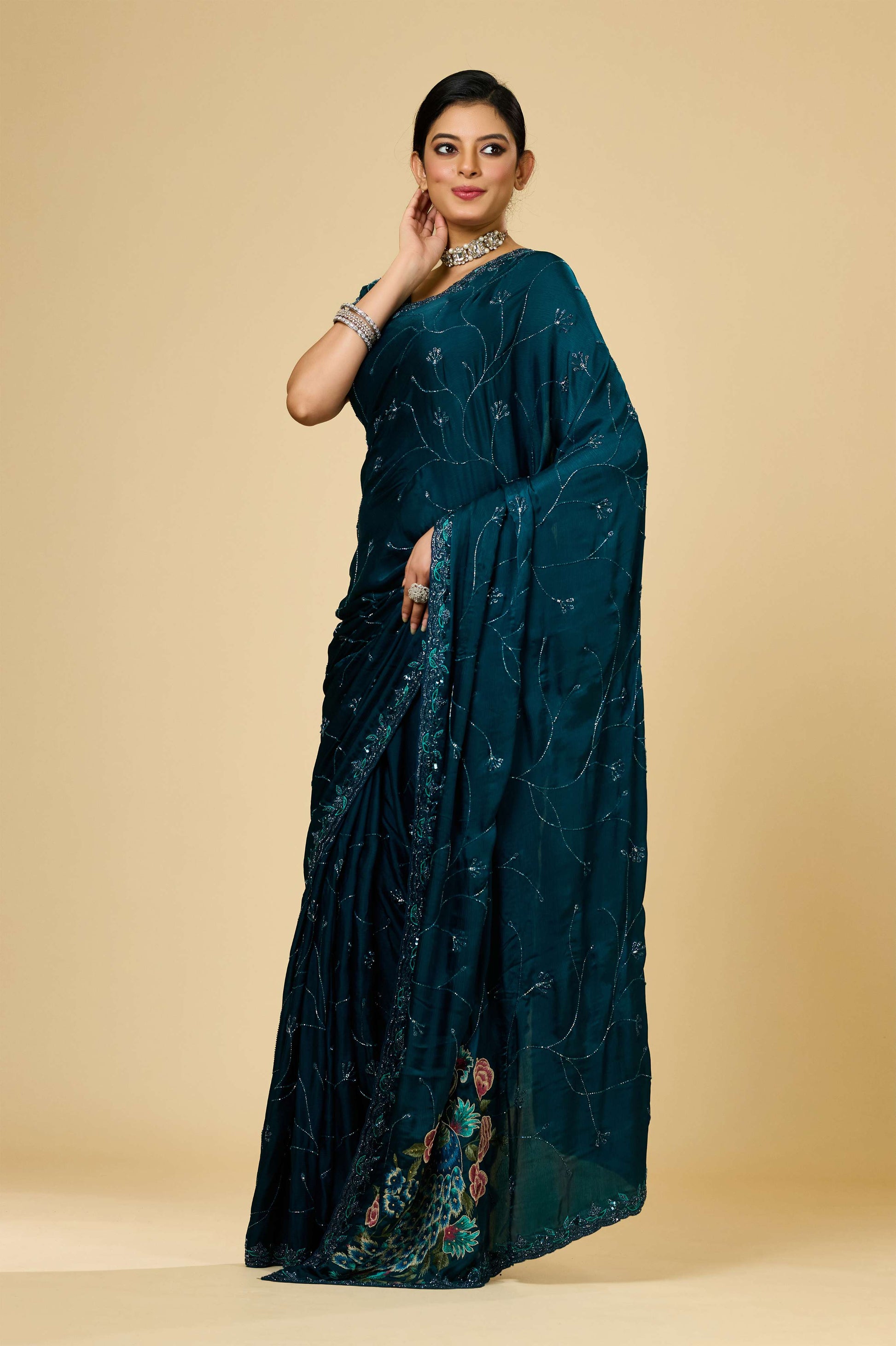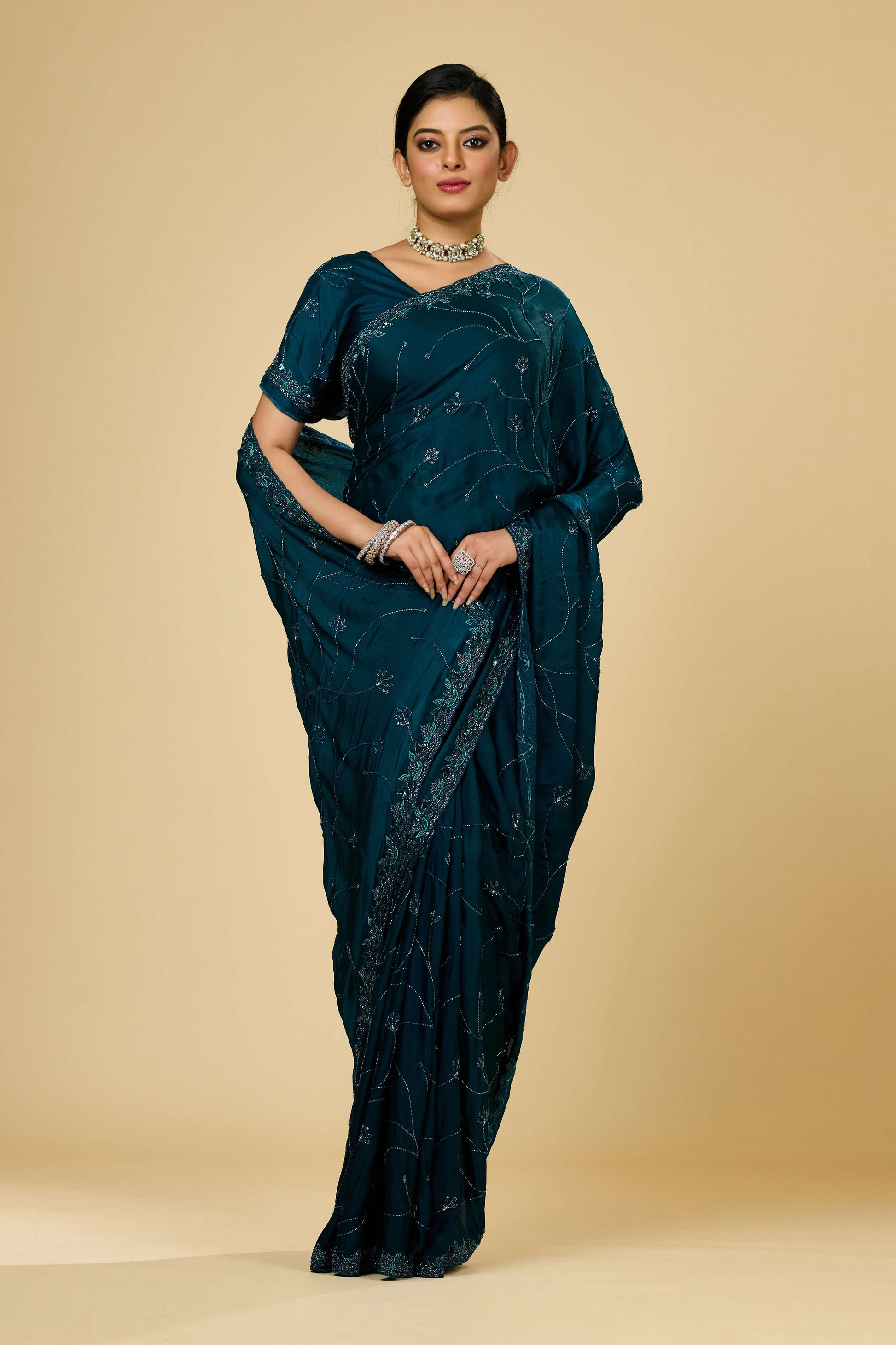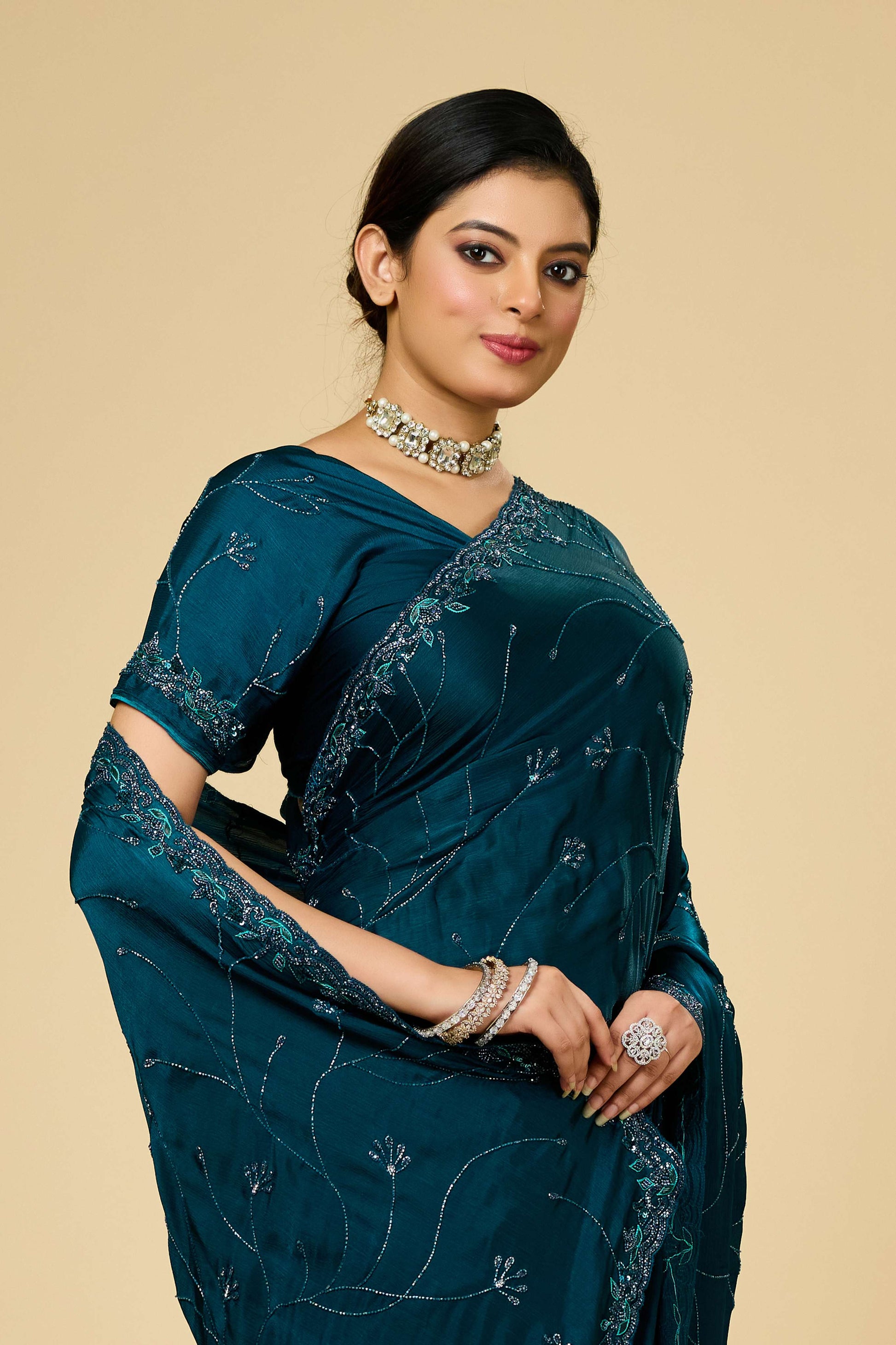 Indulge in the refined elegance of Indigo Embroidery Chinon Sarees by Shreyshree, crafted from smooth Chinon fabric known for its lightweight and flowing drape. The intricate indigo embroidery adds a rich texture and artistic detail, elevating the saree’s sophisticated appeal. Perfect for formal events and celebrations, this saree combines comfort with exquisite craftsmanship, embodying timeless style and expert design.