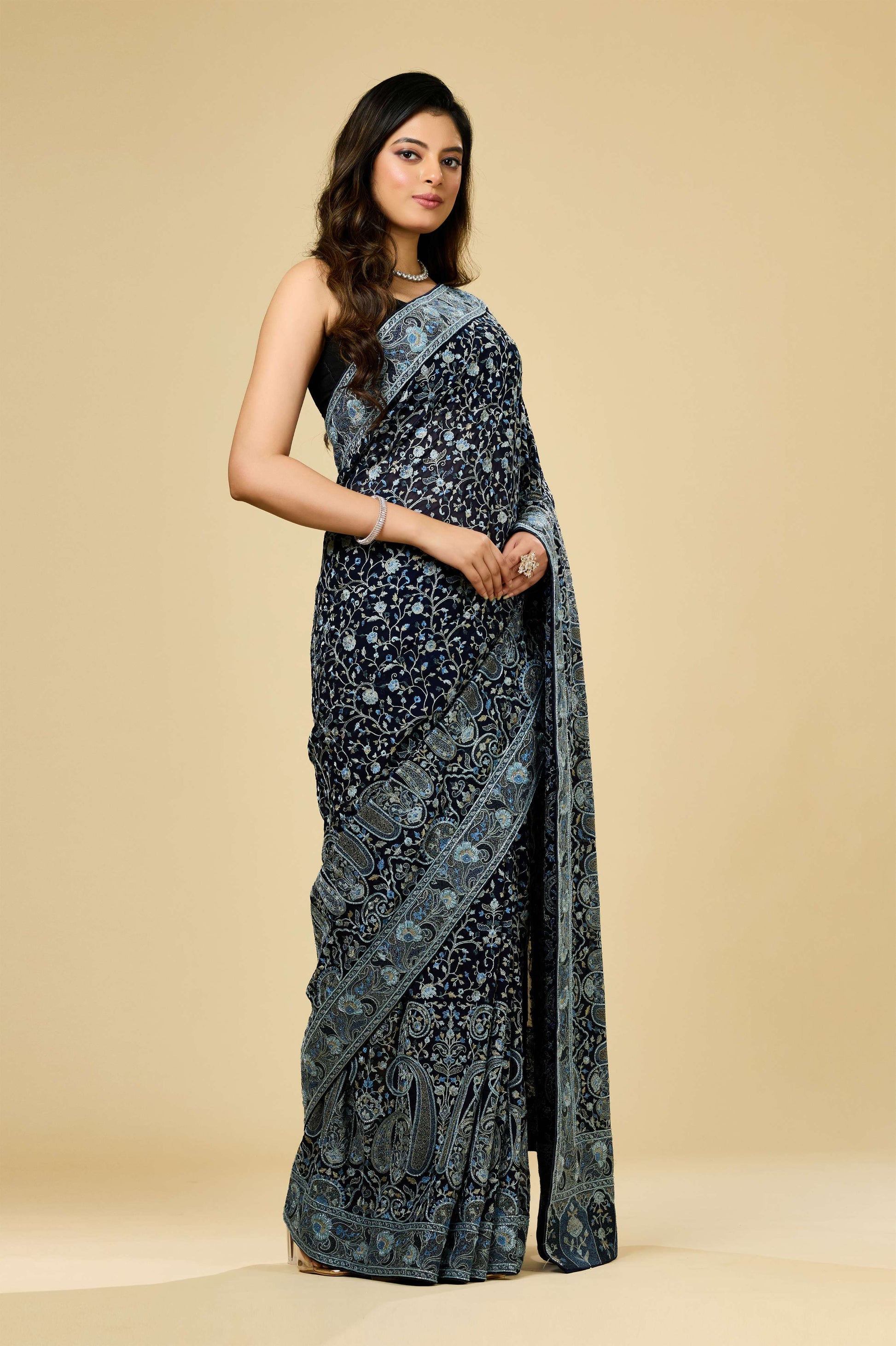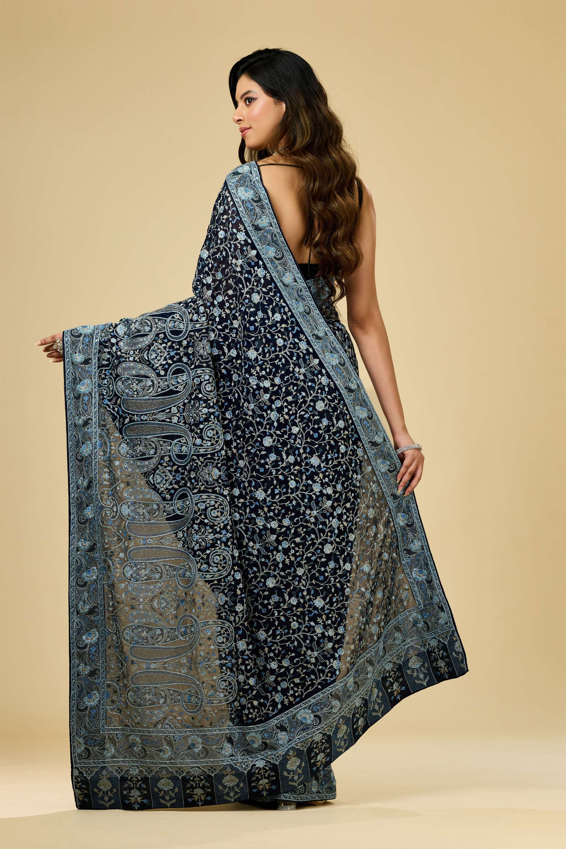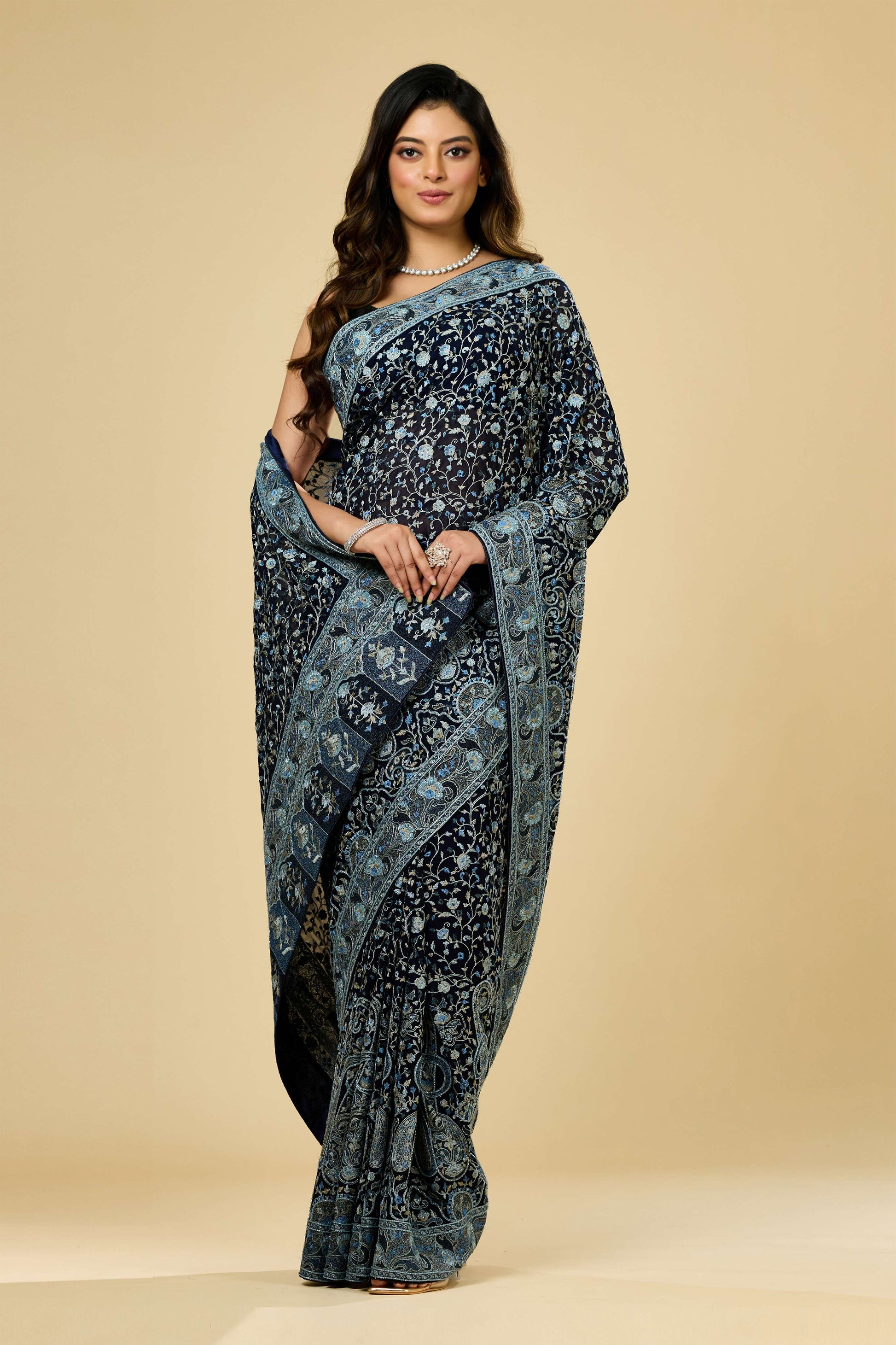 The Blue Kashmiri Georgette Sarees by Shreyshree showcase delicate Kashmiri embroidery on soft, flowing georgette fabric. This combination offers a lightweight, breathable drape with intricate craftsmanship that highlights traditional artistry. Ideal for elegant occasions, the saree’s rich blue hue and detailed motifs create a timeless statement of sophistication and cultural heritage.