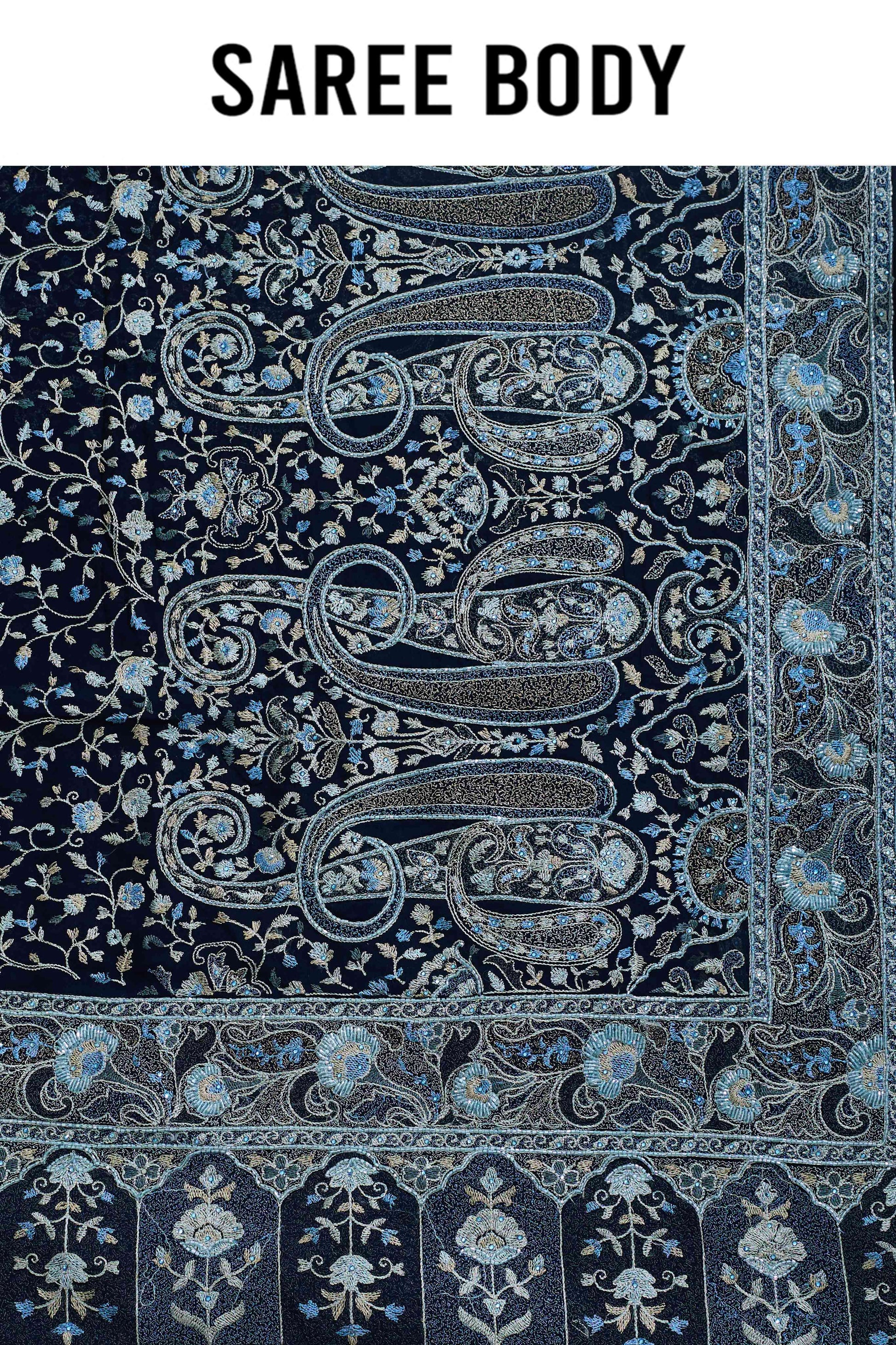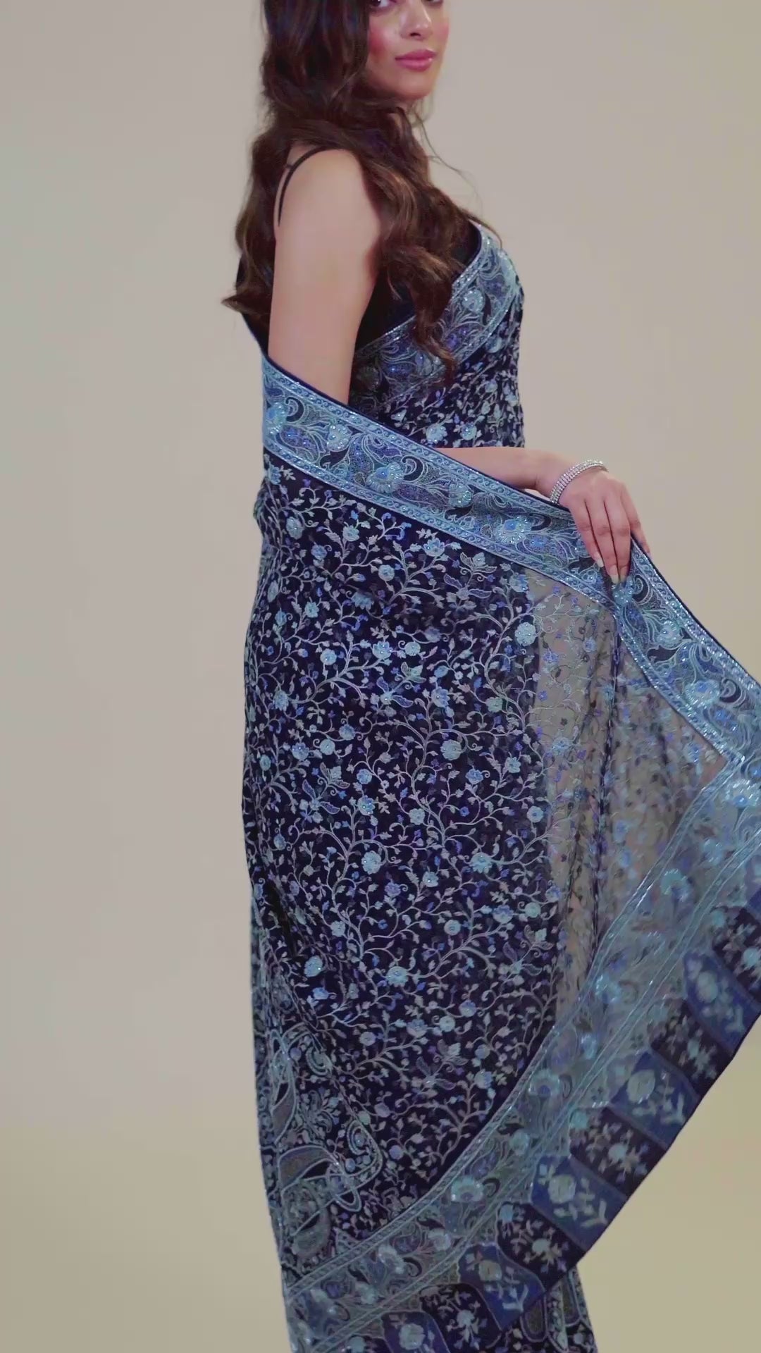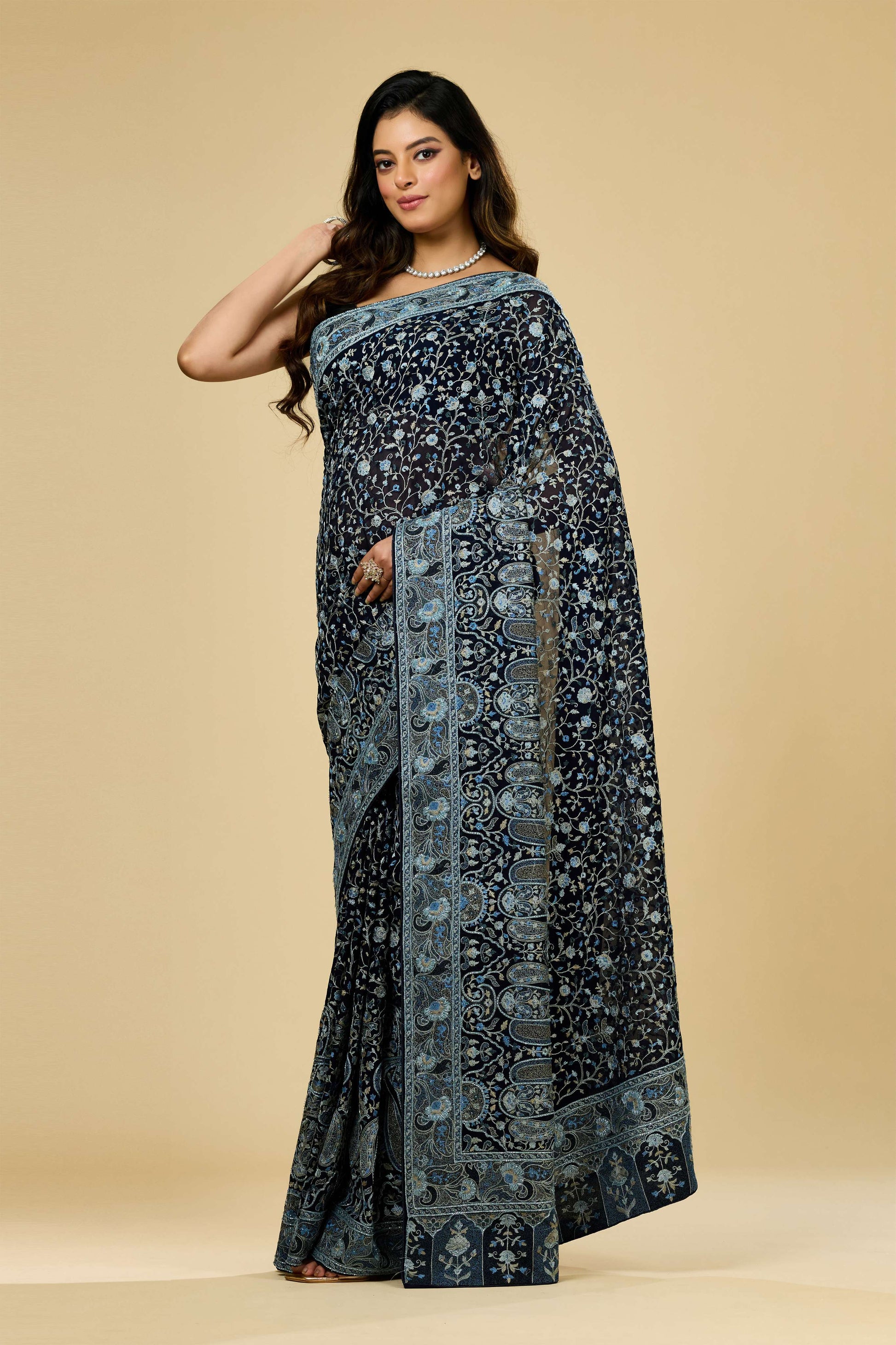 The Blue Kashmiri Georgette Sarees by Shreyshree showcase delicate Kashmiri embroidery on soft, flowing georgette fabric. This combination offers a lightweight, breathable drape with intricate craftsmanship that highlights traditional artistry. Ideal for elegant occasions, the saree’s rich blue hue and detailed motifs create a timeless statement of sophistication and cultural heritage.