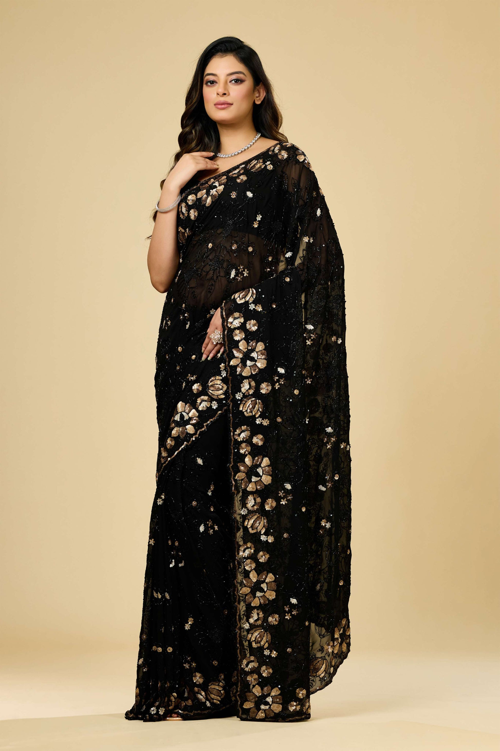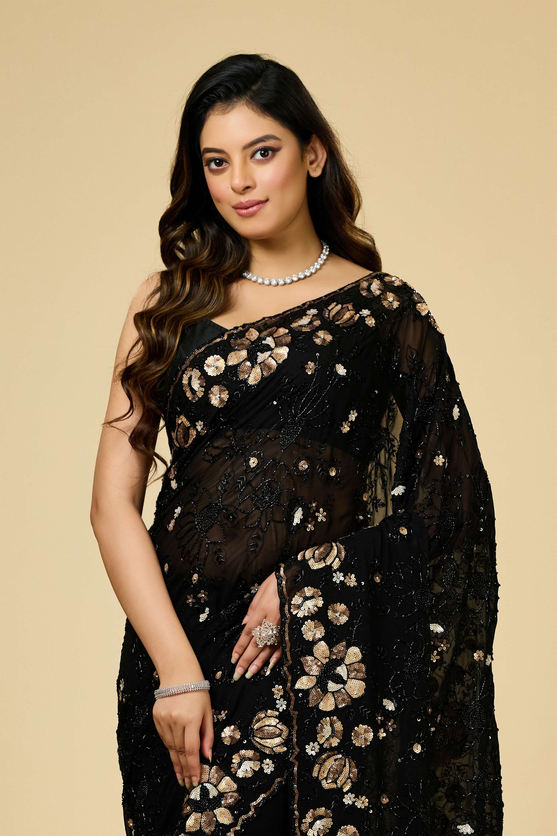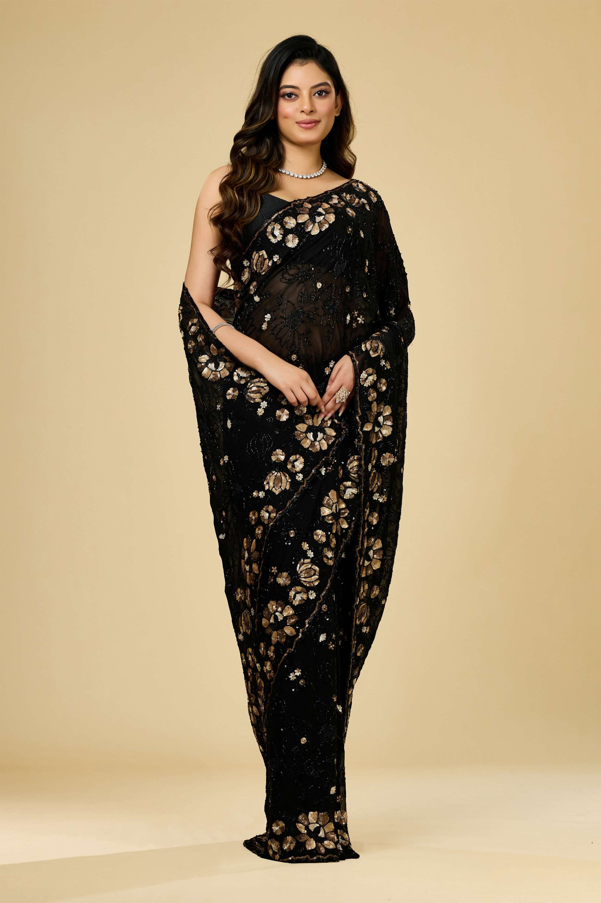 The Black Sequins Georgette Sarees by Shreyshree combine the fluidity of georgette fabric with shimmering sequin embellishments for a striking, elegant look. Lightweight and comfortable, this saree drapes effortlessly, making it ideal for evening events and celebrations. The subtle sparkle adds a touch of glamour while maintaining refined sophistication, showcasing expert craftsmanship and contemporary style.