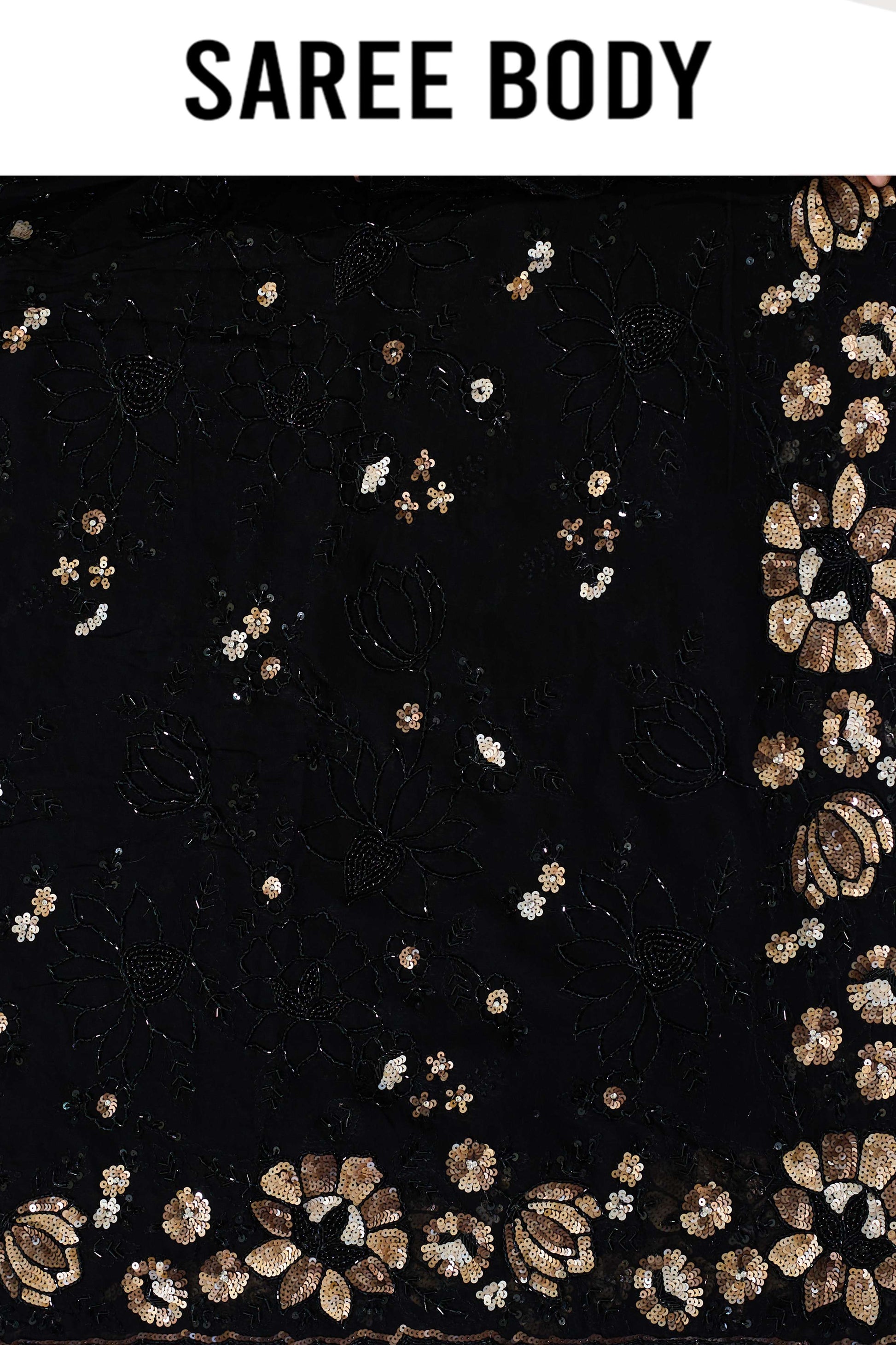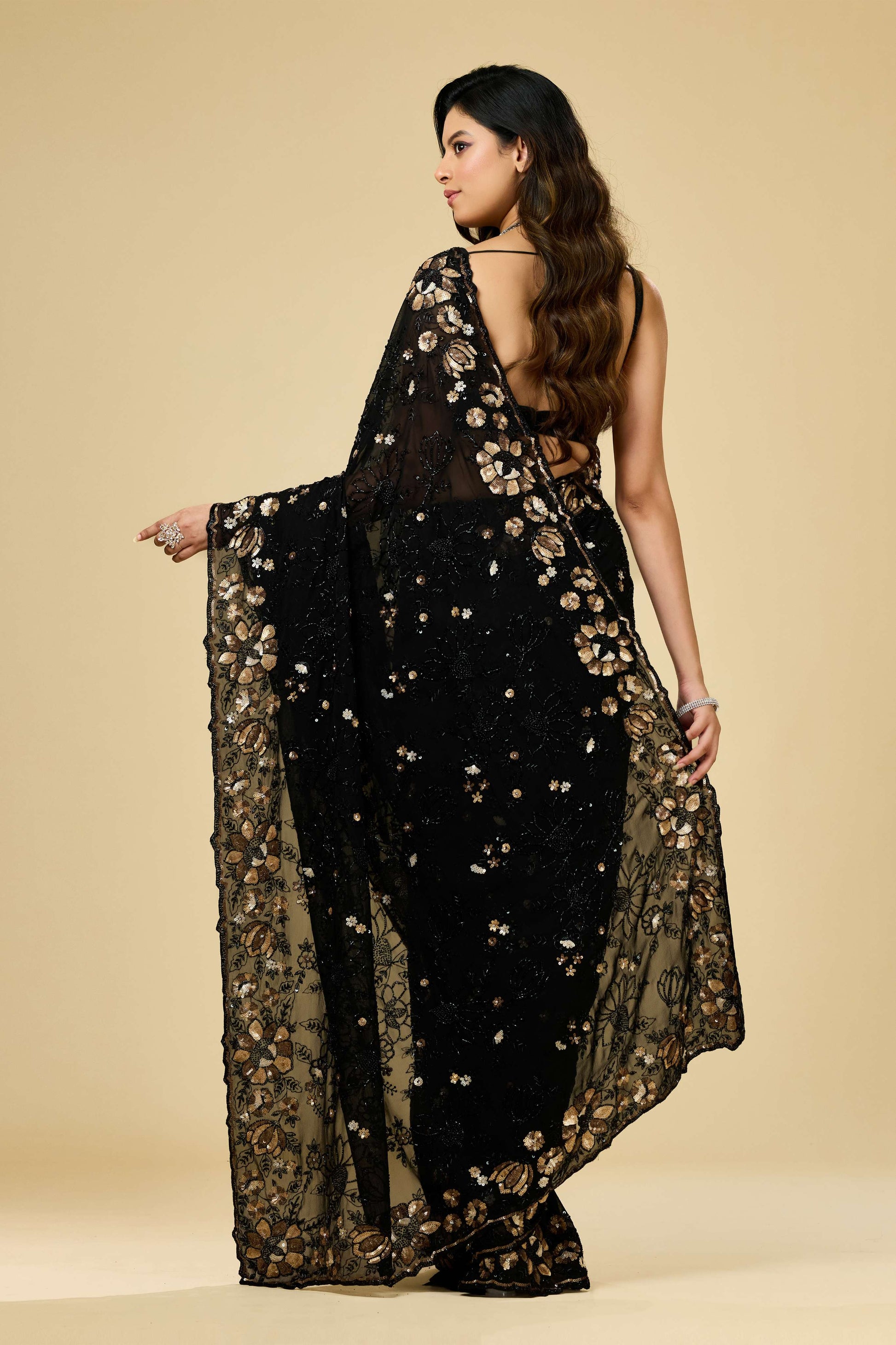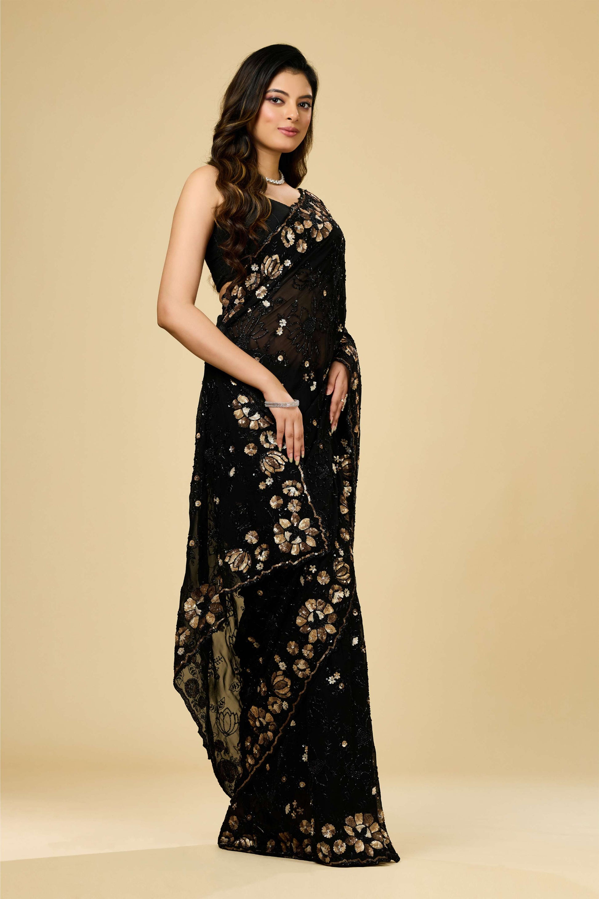The Black Sequins Georgette Sarees by Shreyshree combine the fluidity of georgette fabric with shimmering sequin embellishments for a striking, elegant look. Lightweight and comfortable, this saree drapes effortlessly, making it ideal for evening events and celebrations. The subtle sparkle adds a touch of glamour while maintaining refined sophistication, showcasing expert craftsmanship and contemporary style.