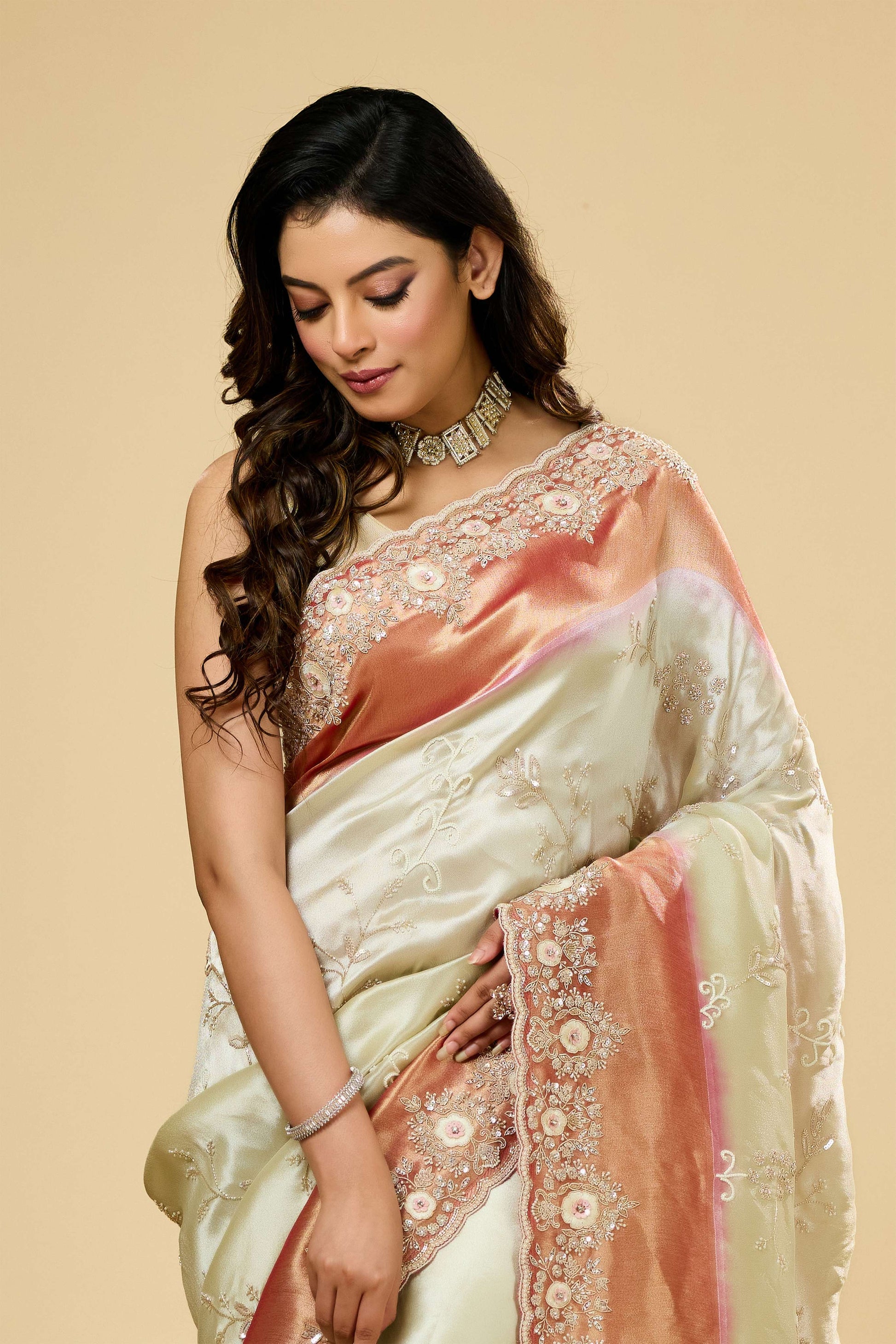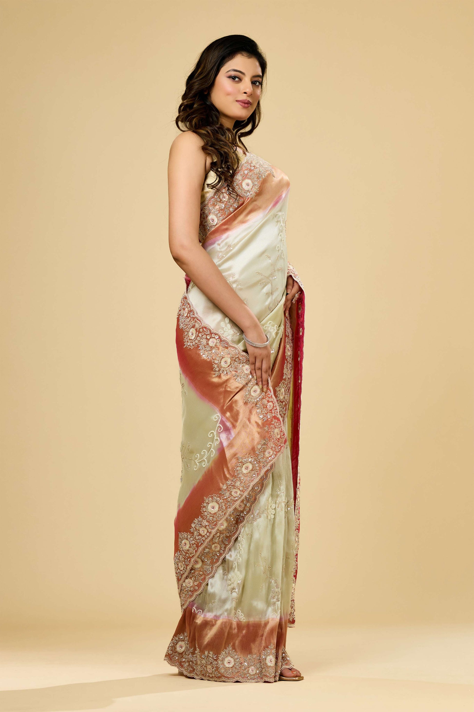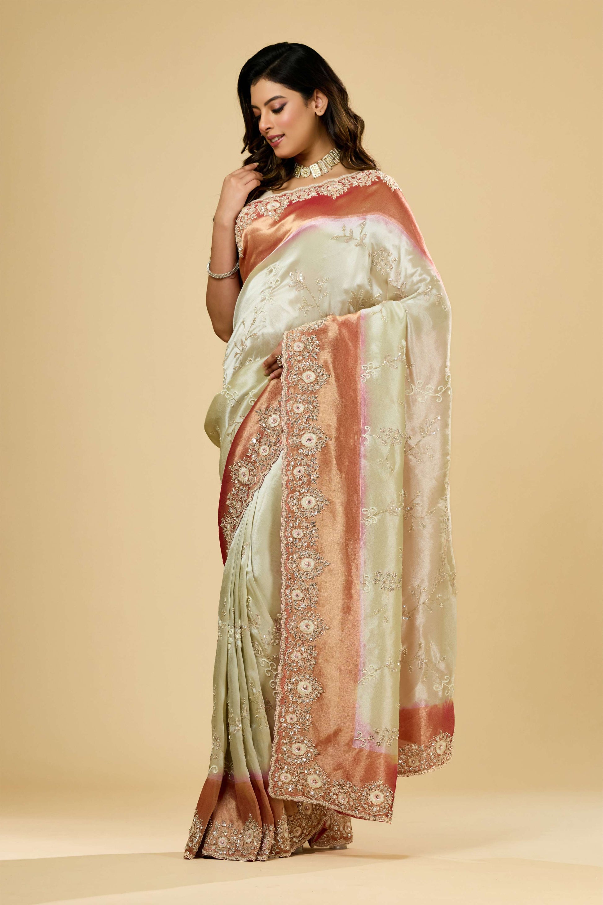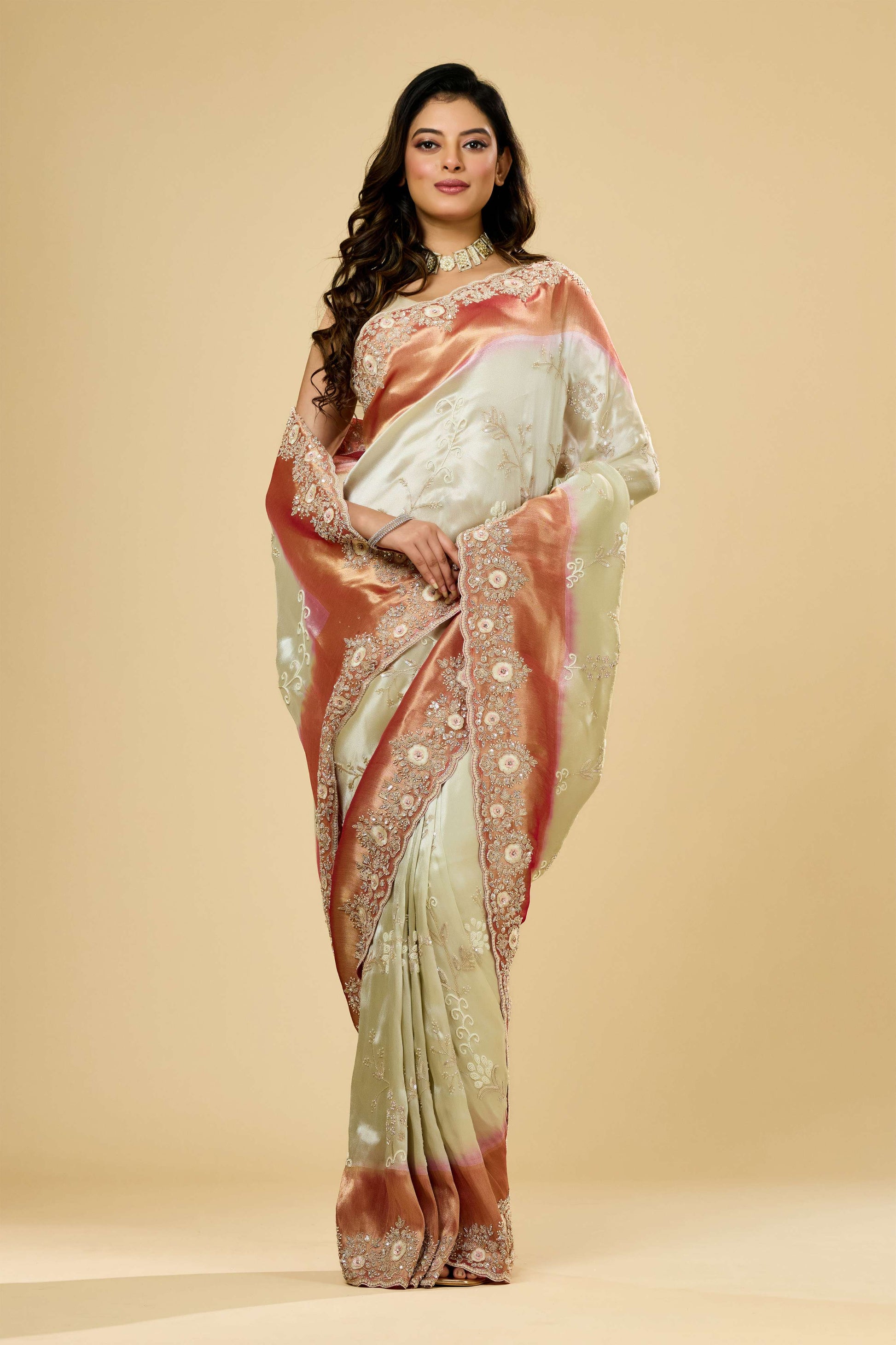 The Multicolor Cut Dana Tissue Sarees by Shreyshree feature vibrant cut dana embellishments on delicate tissue fabric, offering a striking blend of color and texture. Lightweight and airy, these sarees drape elegantly, making them ideal for festive and formal occasions. The intricate detailing showcases skilled craftsmanship, reflecting Shreyshree’s dedication to quality and sophisticated design.