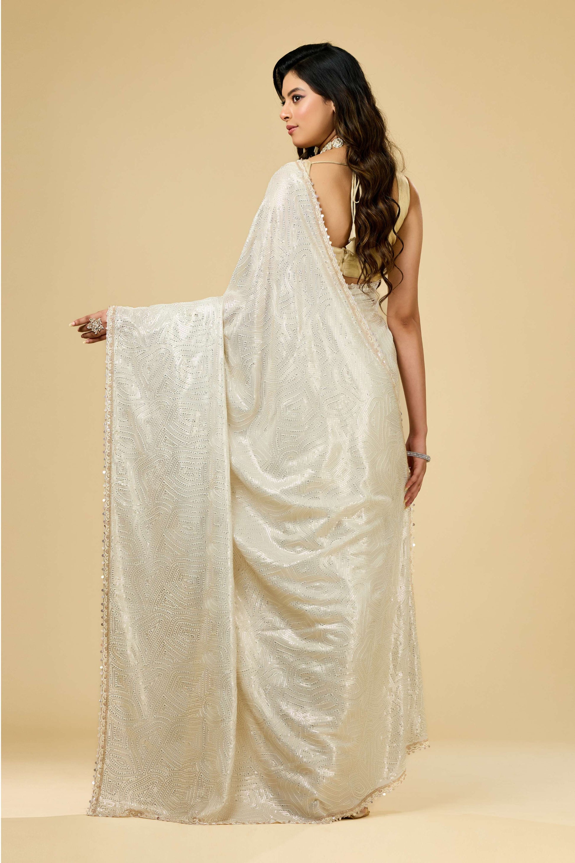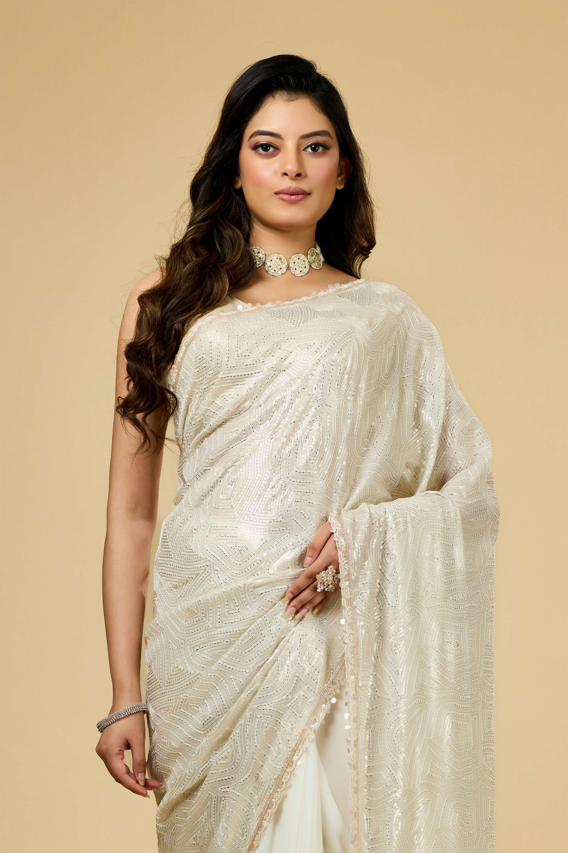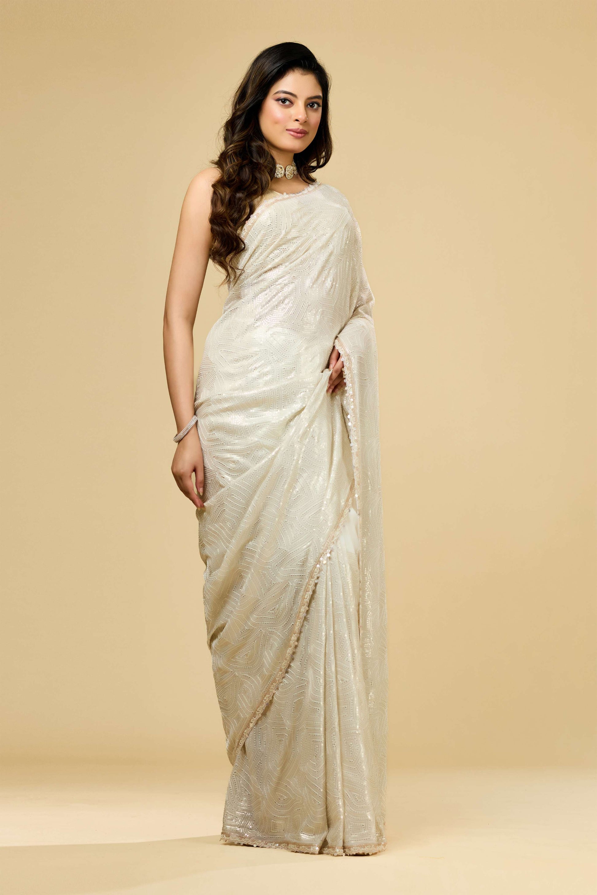 Cream Pearlwork Georgette Sarees 1011-10038