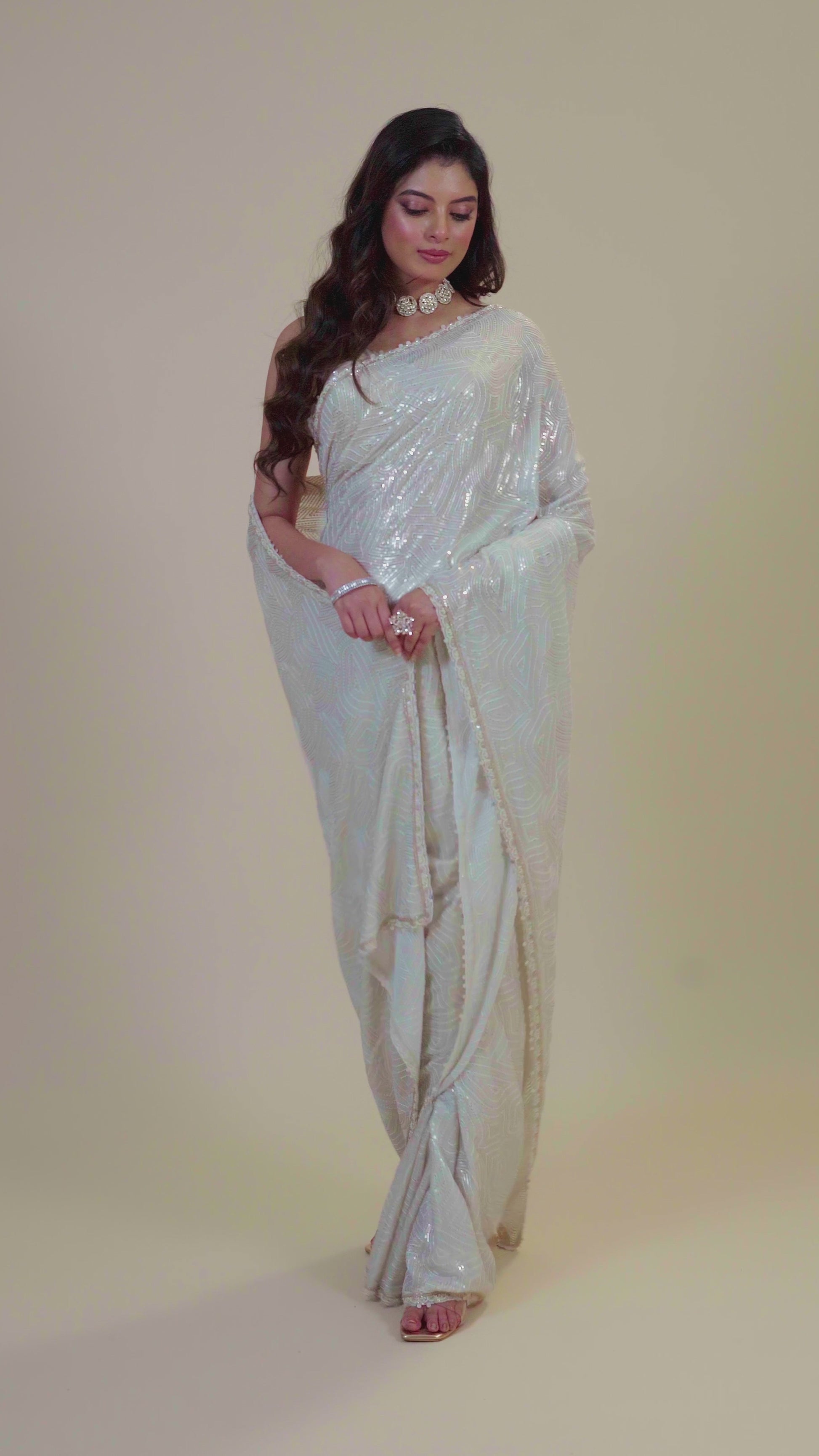 The Cream Pearlwork Georgette Saree by Shreyshree showcases delicate pearl embellishments on lightweight georgette fabric, creating an exquisite blend of elegance and comfort. Its soft cream hue complements the intricate pearl detailing, making it perfect for sophisticated gatherings and special occasions. This saree offers a graceful drape and refined texture, reflecting expert craftsmanship and timeless style.