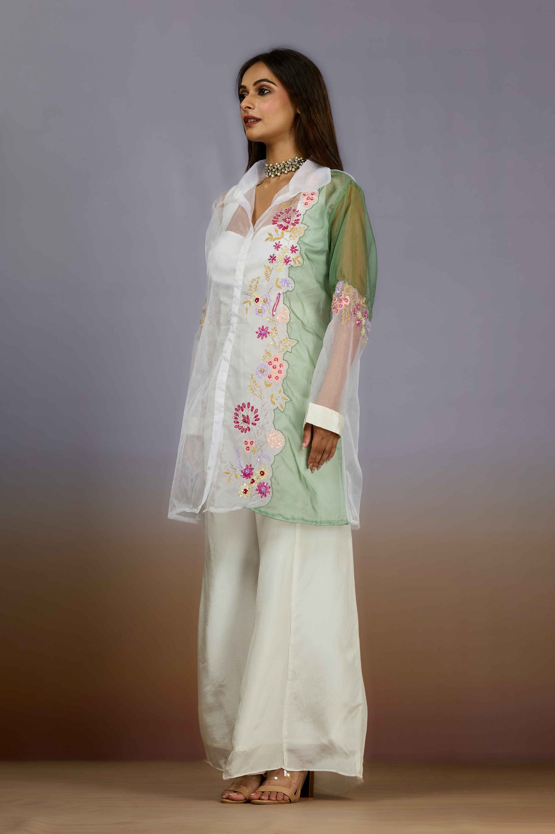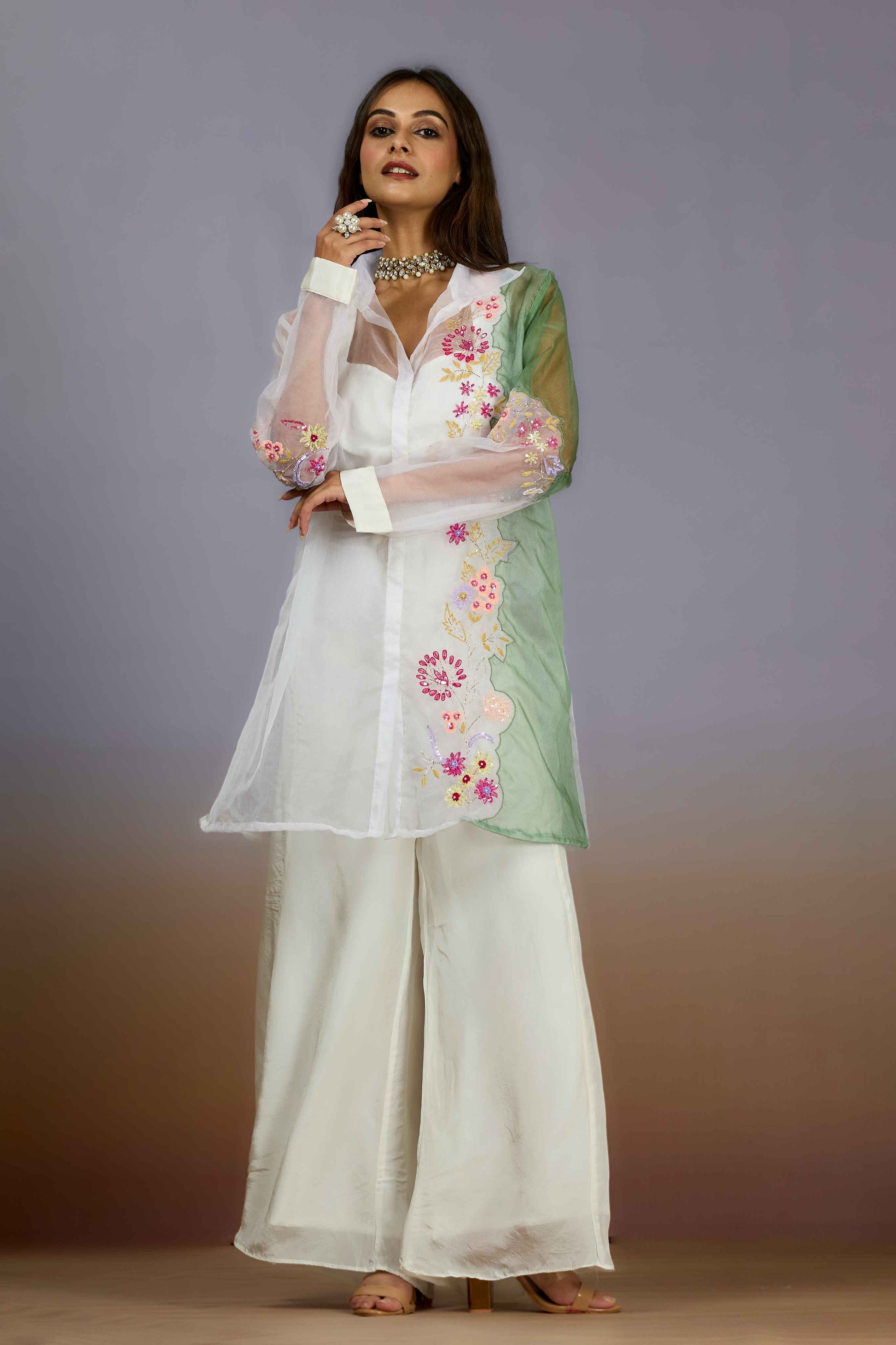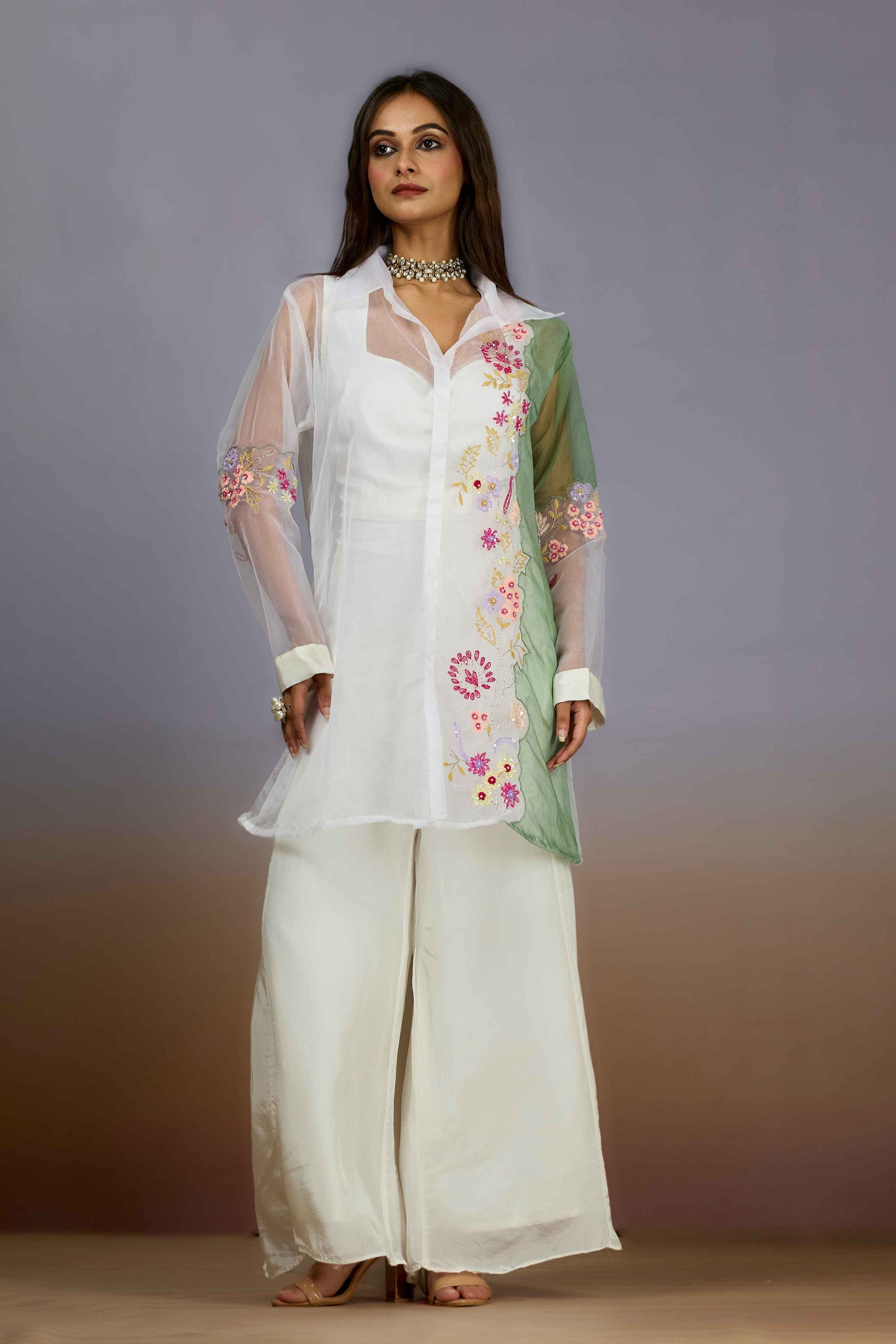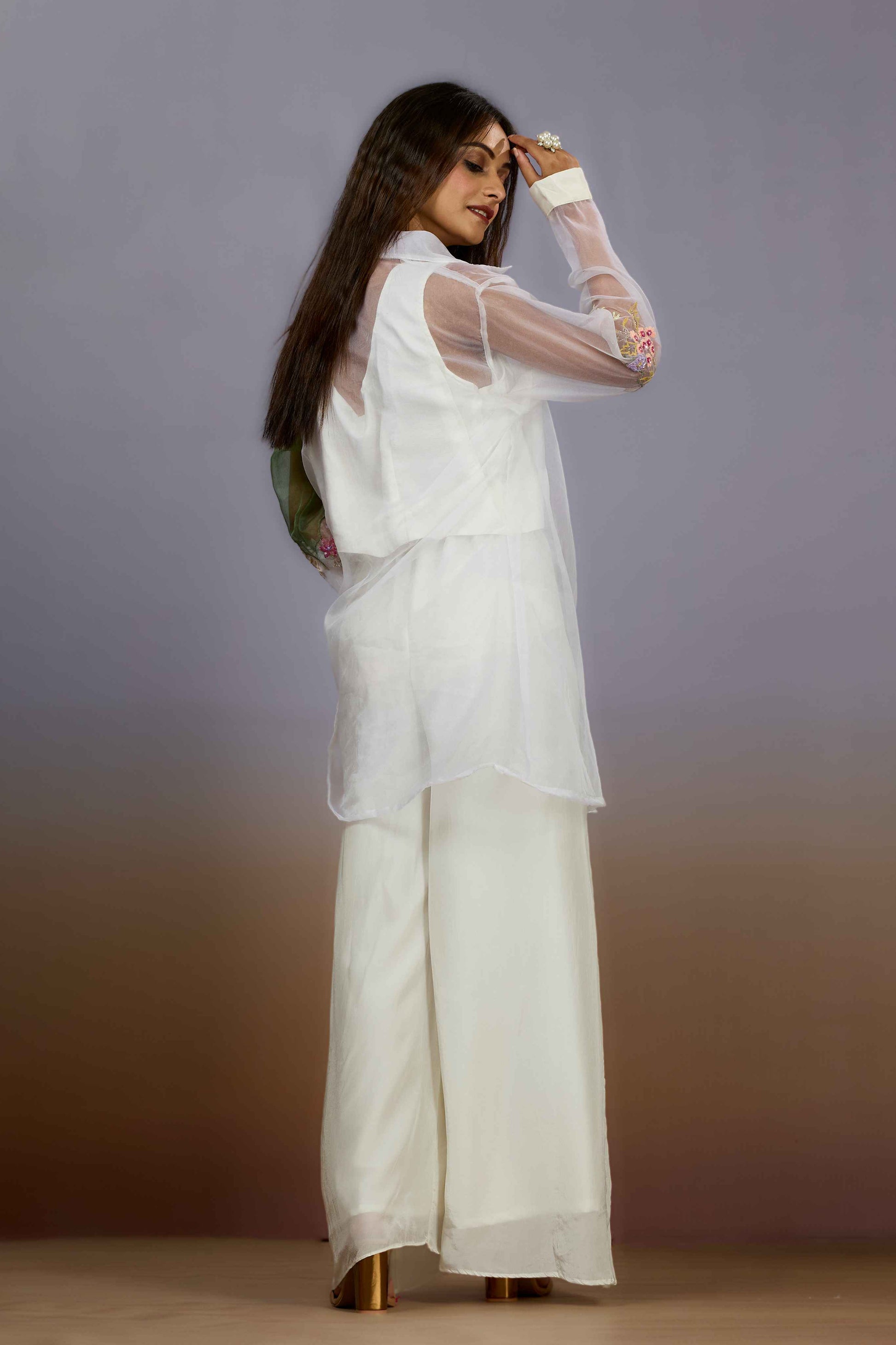 The White Sequins HO Silk Indo Western by Shreyshree features luxurious HO silk fabric adorned with subtle sequin embellishments. This expertly designed piece balances traditional elegance with modern style, providing a comfortable fit and a graceful silhouette ideal for formal events and special occasions.