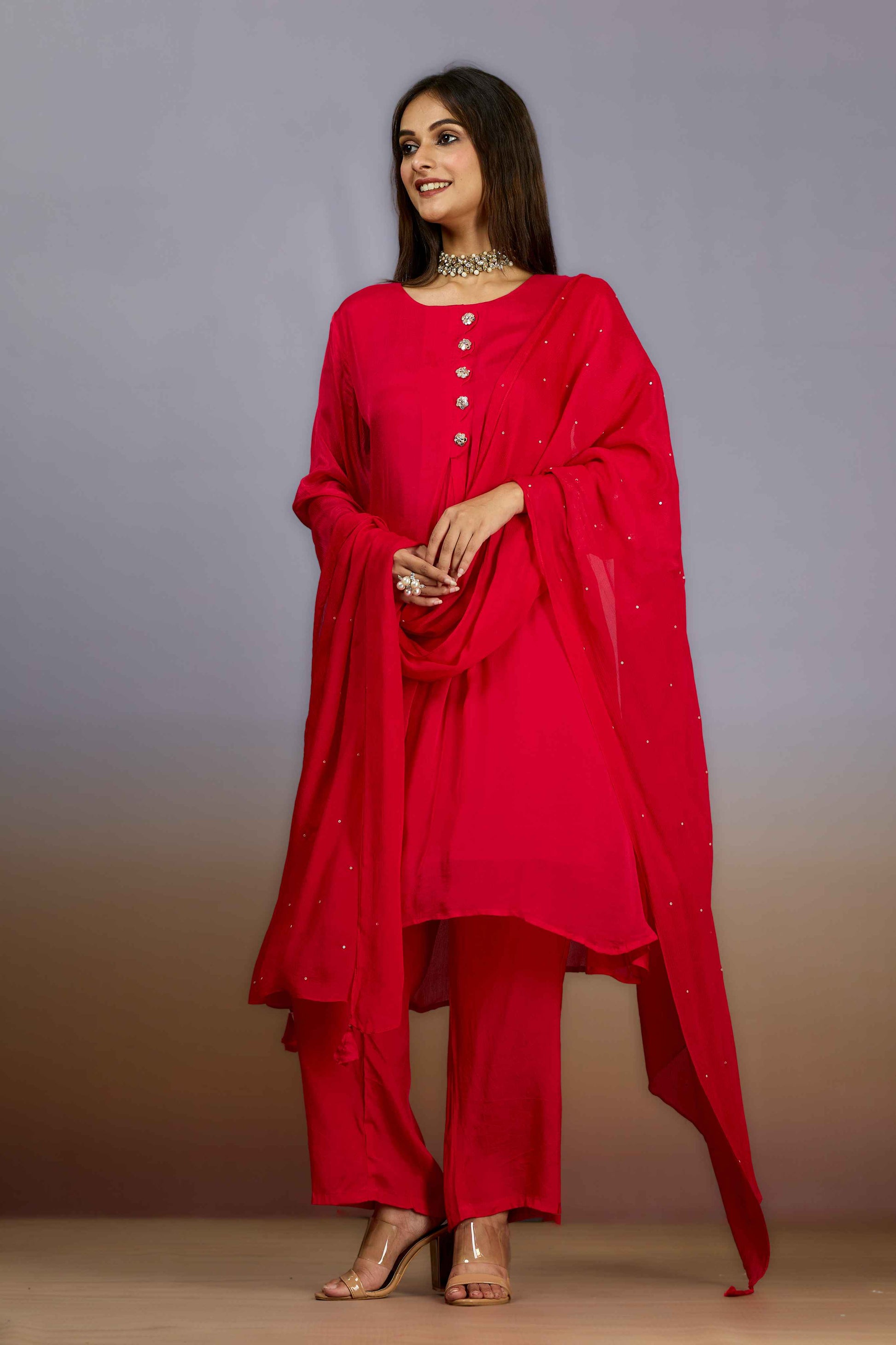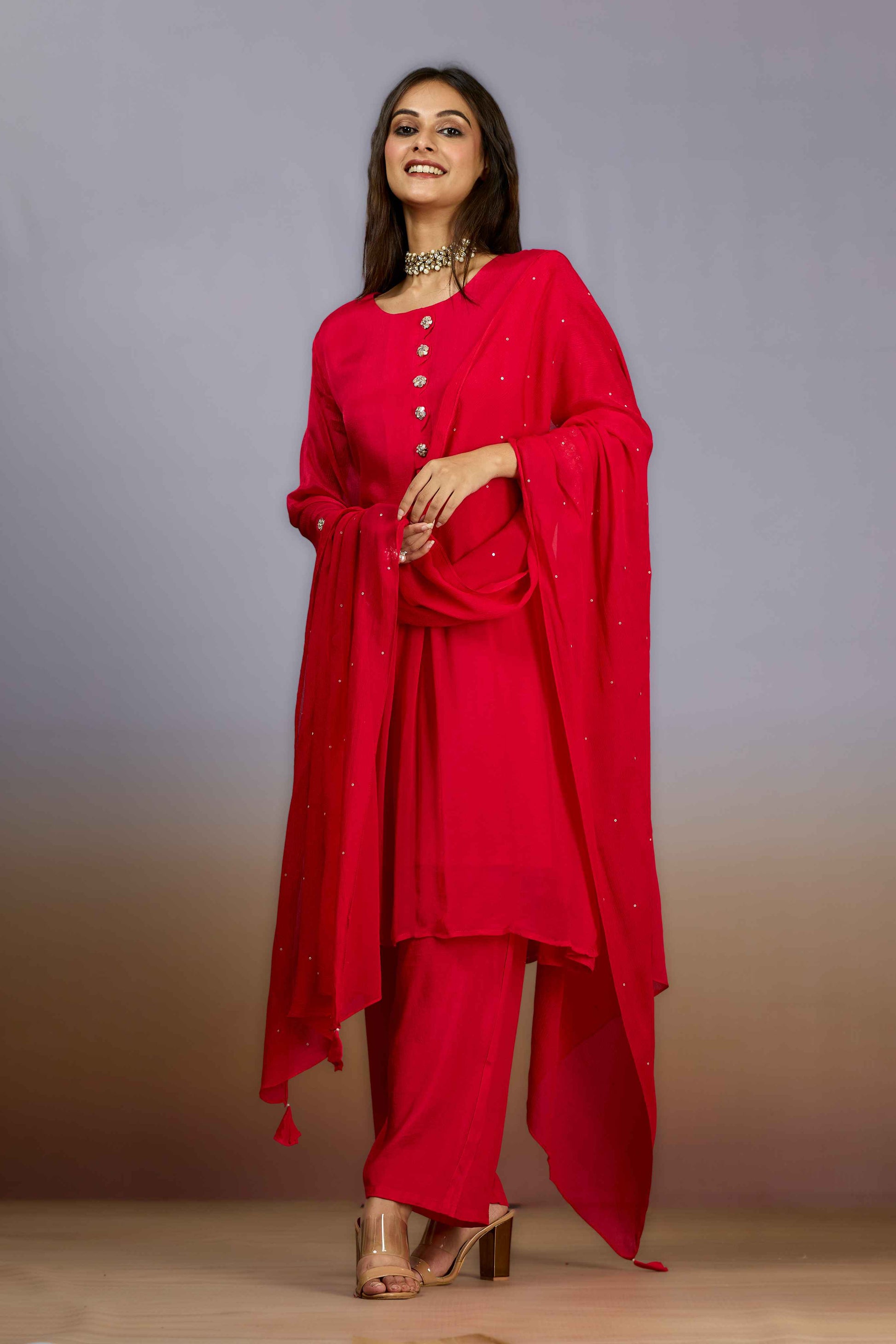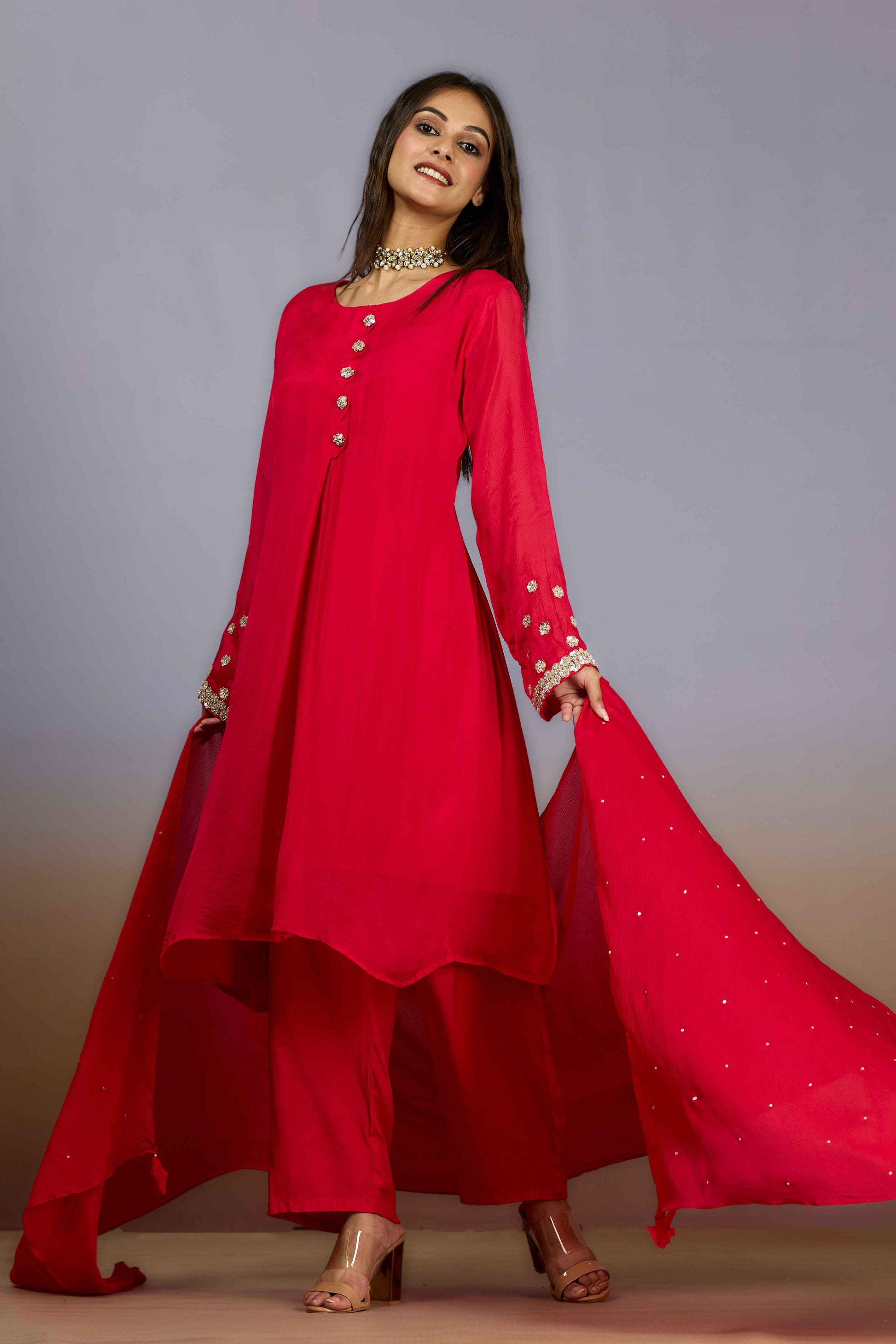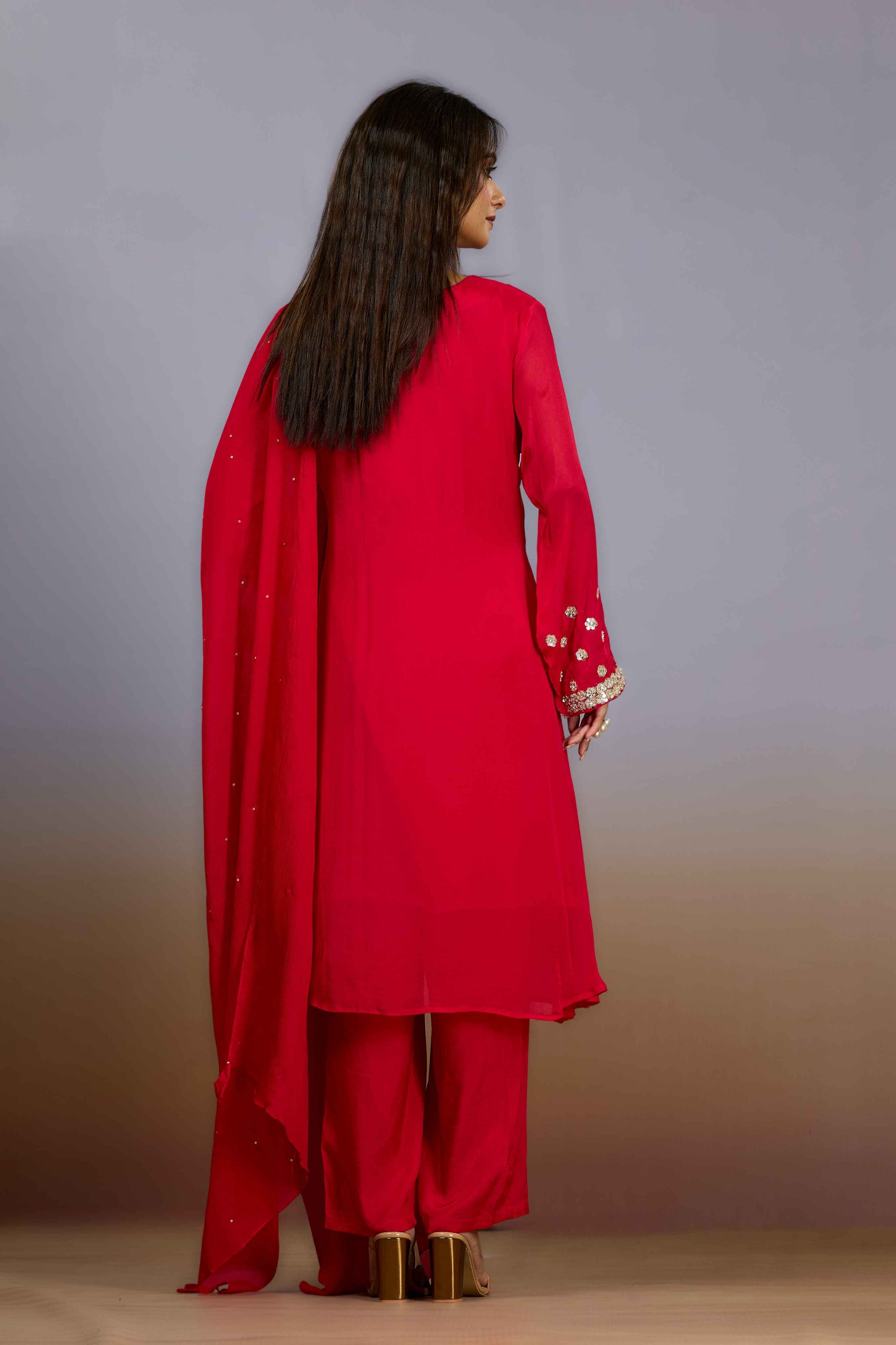 The Rani Cut Dana Chinon Indo Western by Shreyshree features finely crafted cut dana embellishments on high-quality Chinon fabric. This piece expertly merges traditional detailing with contemporary design, providing a comfortable fit and sophisticated appearance, ideal for festive and formal occasions.